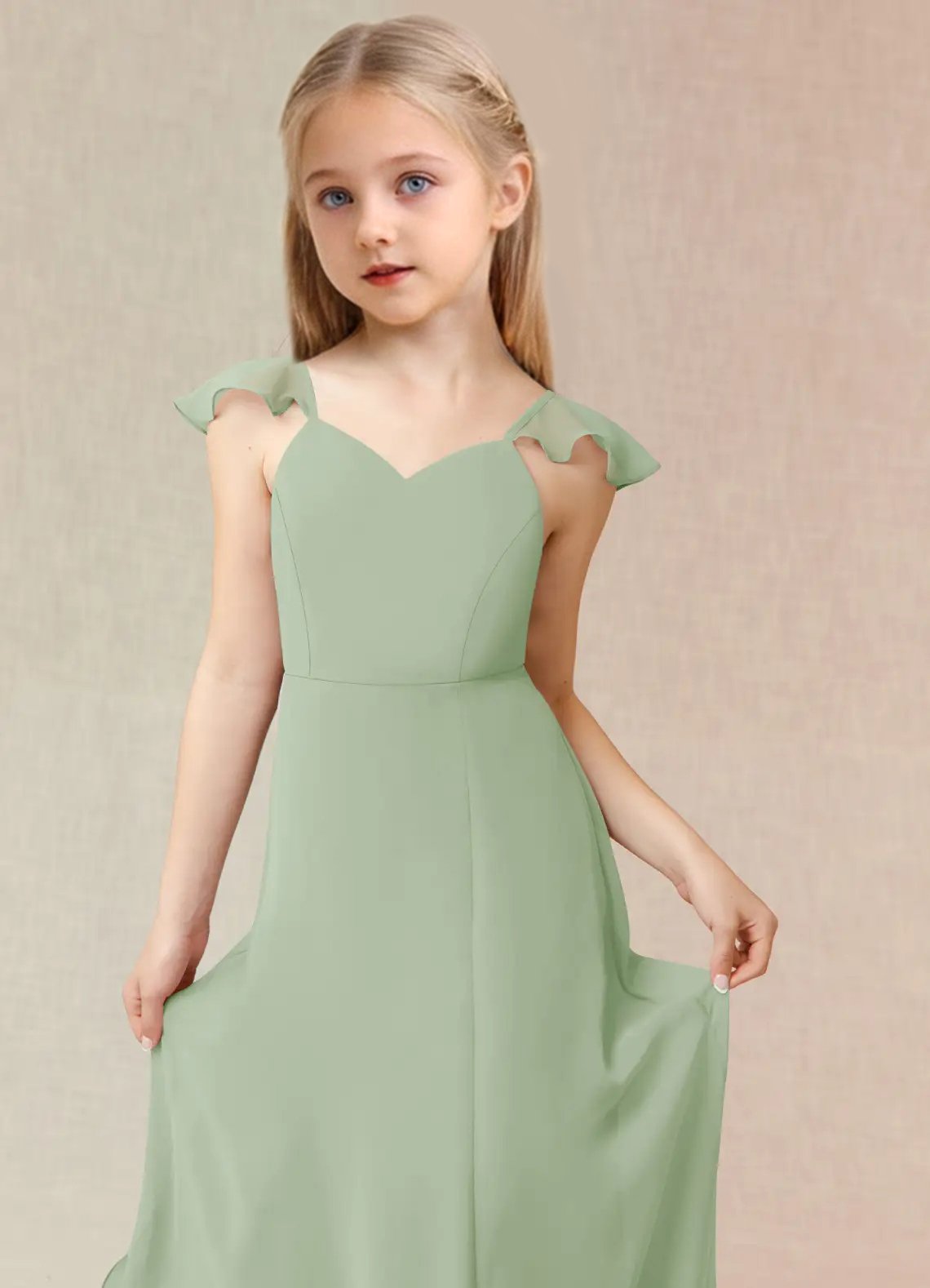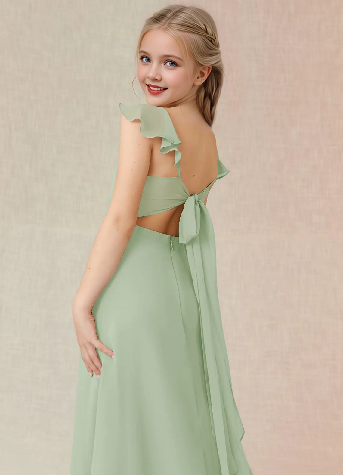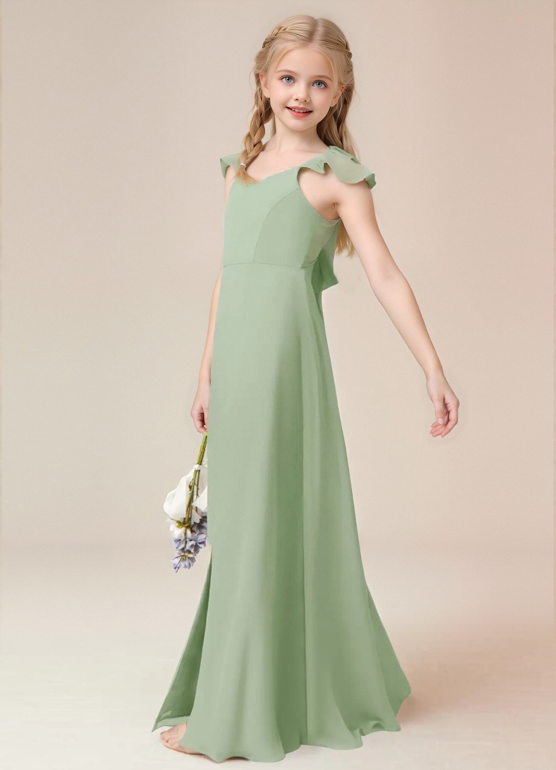Junior Bridesmaid Everett, the sister dress to Bridesmaid Everett, is a floor length, a-line dress made of chiffon. She has a classic v-neckline and fun cascading ruffle straps. This cute girly dress also features a fashionable back cut-out and bow tie at the waist.
