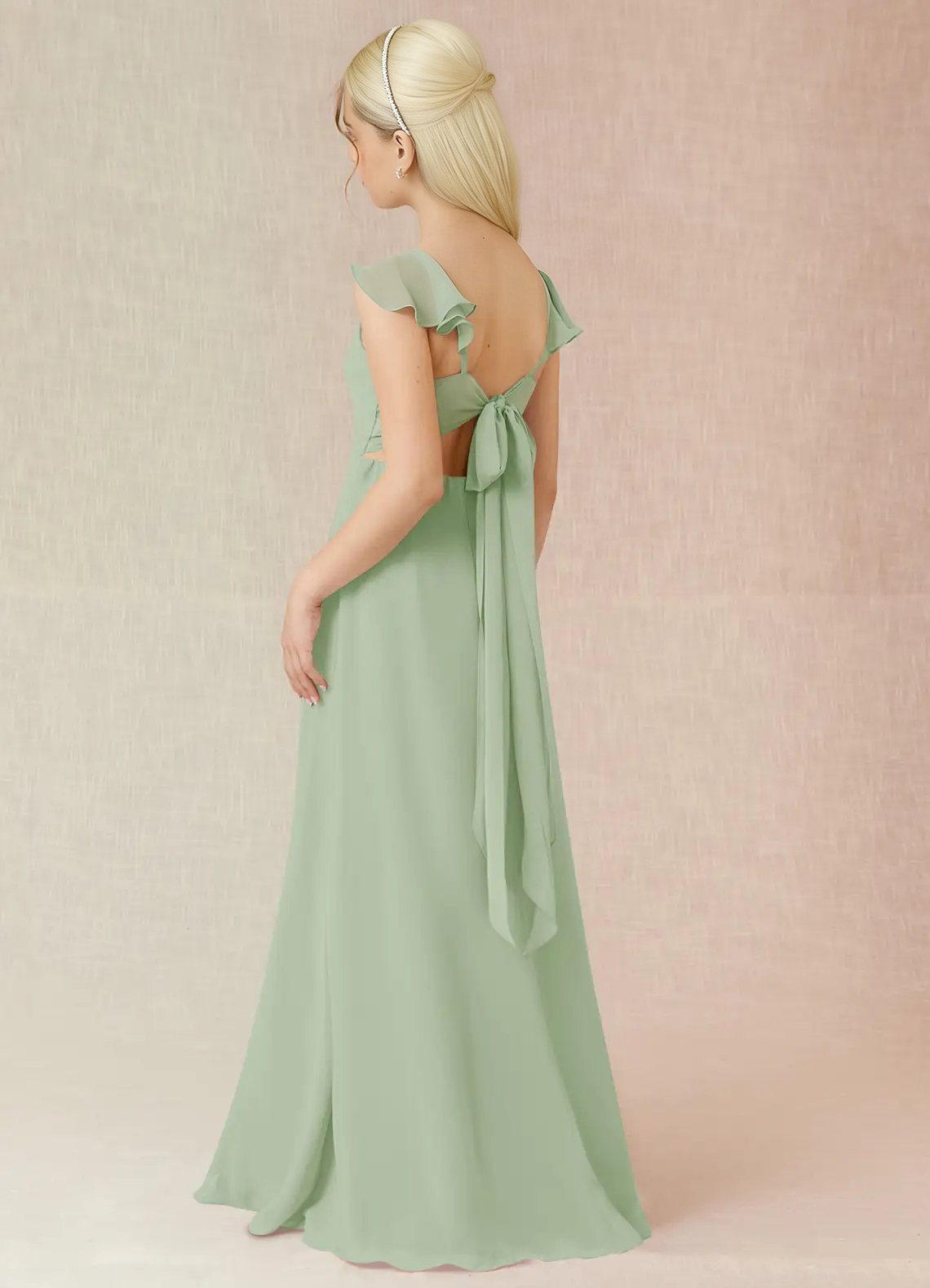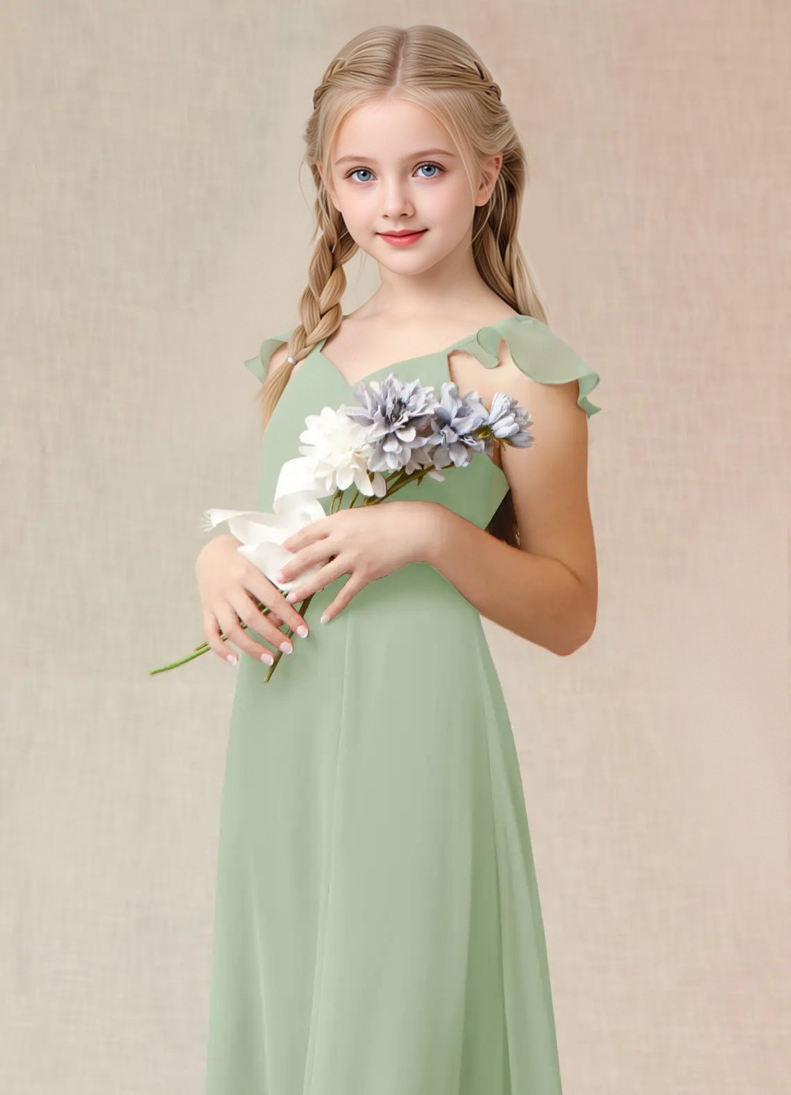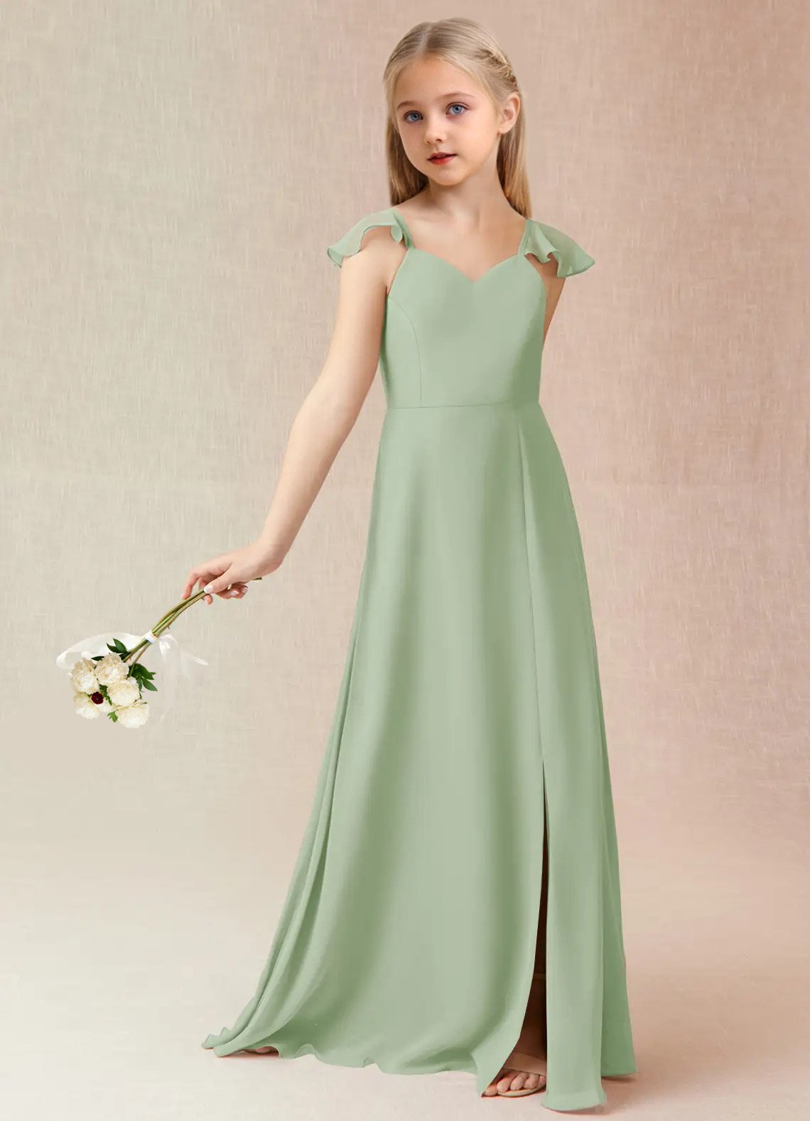 Junior Bridesmaid Everett, the sister dress to Bridesmaid Everett, is a floor length, a-line dress made of chiffon. She has a classic v-neckline and fun cascading ruffle straps. This cute girly dress also features a fashionable back cut-out and bow tie at the waist.