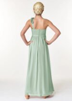 JBD Flower is a fun floor length dress made of chiffon. This vibrant a-line gown features a one-shoulder neckline, pleating, belted waistline, and 3D floral applique.