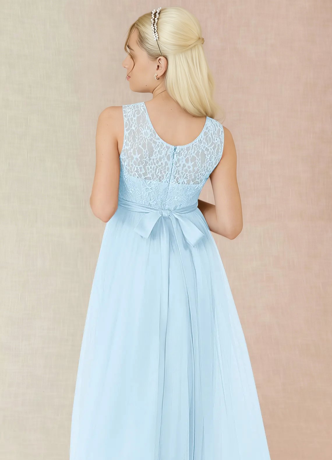 Look and feel absolutely gorgeous in Georgette! She is a floor length, a-line lace and tulle dress with a scoop neckline, lovely lace bodice, matte satin belt, and gathering on the skirt.