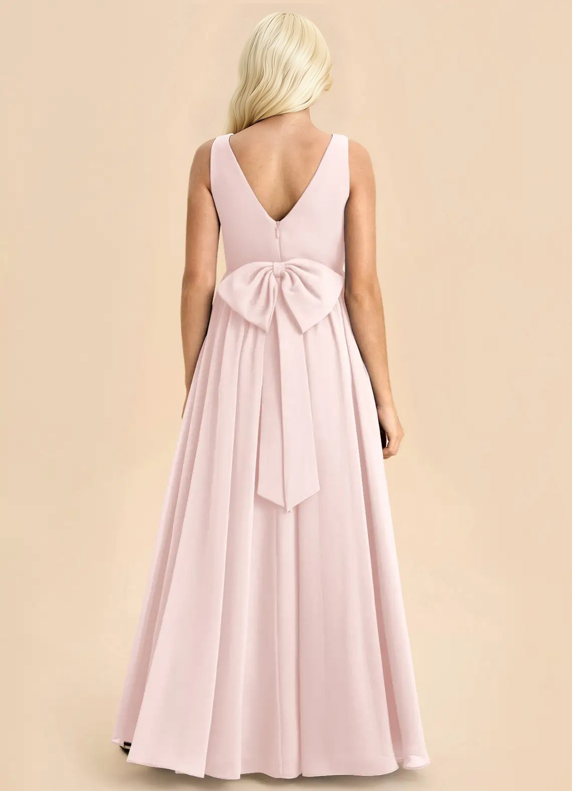 The Hathaway junior bridesmaids dress is a floor-length A-line gown crafted from smooth stretch satin for a polished yet comfortable fit. With a sleeveless V-neckline and back, a statement bow at the waist, and softly ruched skirt, it offers graceful, flowing movement with every step.