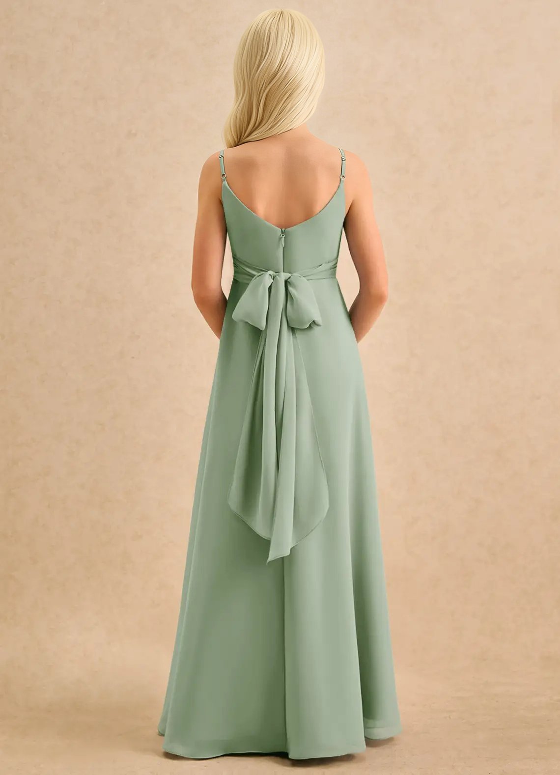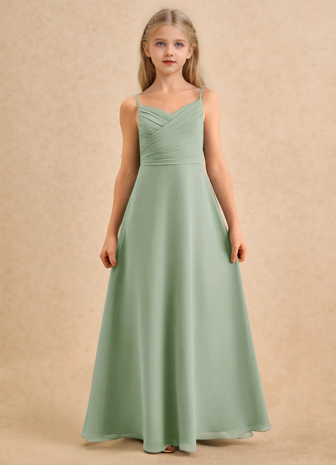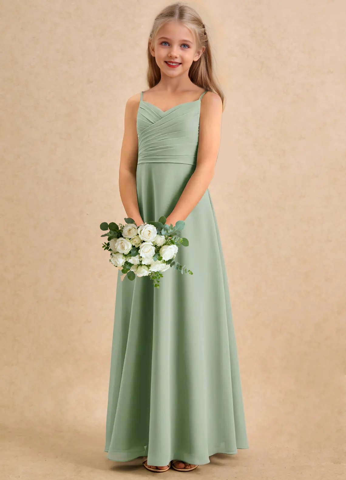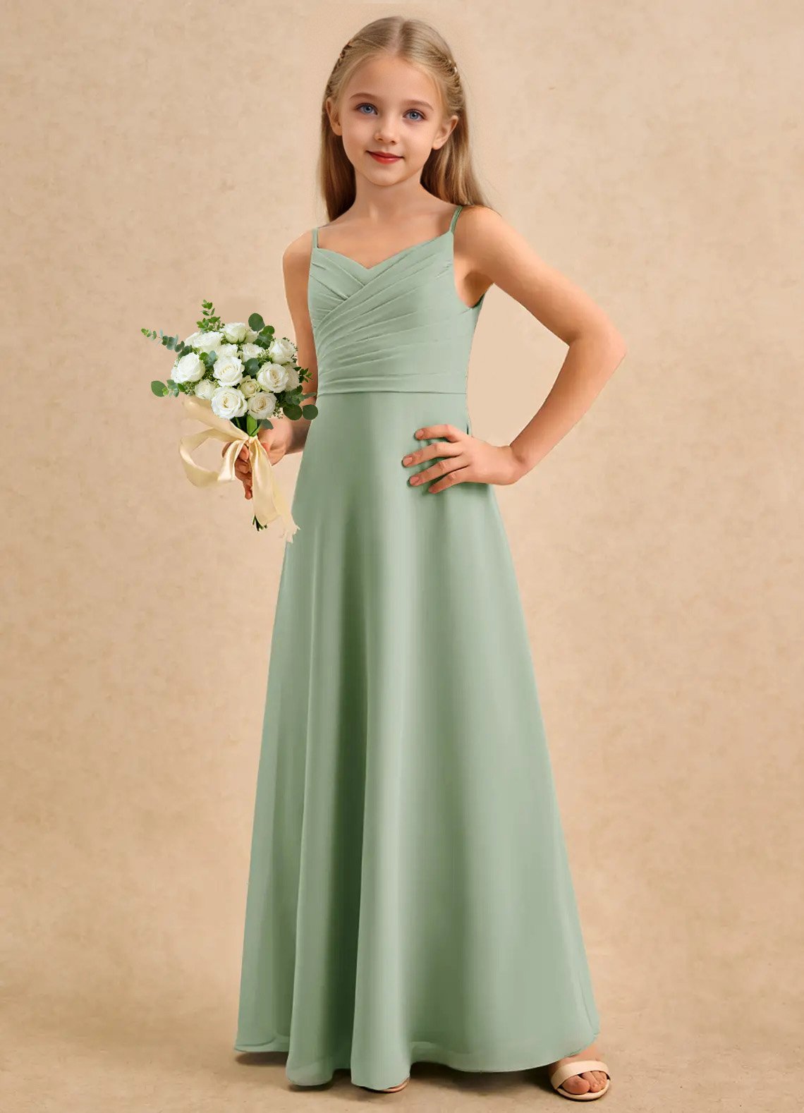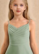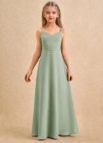 A graceful floor-length flower girl dress crafted from airy chiffon, featuring an A-line silhouette with a sweetheart neckline, pleated bodice, and adjustable spaghetti straps. A self-tie bow at the back waist adds a charming touch, while the loosely pleated skirt allows for soft, elegant movement.