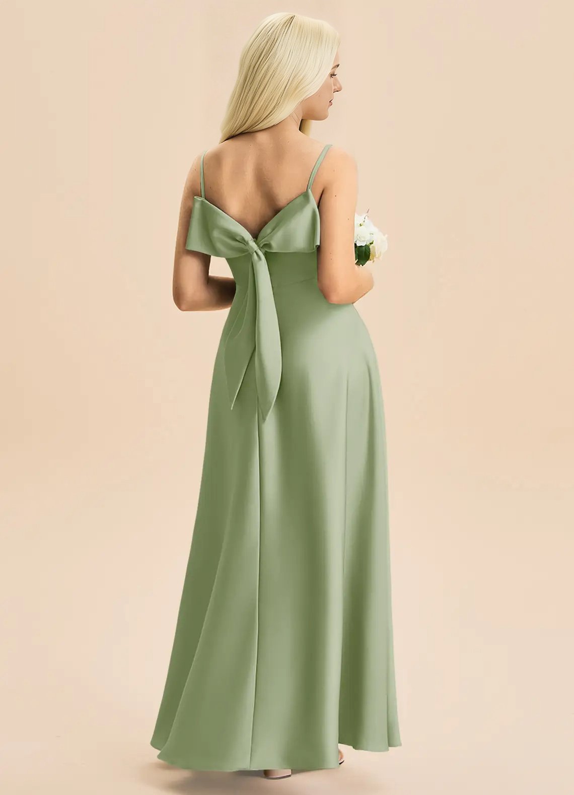 Isolde is a charming junior bridesmaid dress, exquisitely crafted from smooth, stretch satin fabric. The gown features an A-line silhouette, defined by a straight neckline and adjustable spaghetti straps. The bodice is adorned with delicate ruching details, while a striking bow accents the back waistline; the skirt flows into a relaxed, draped hem.