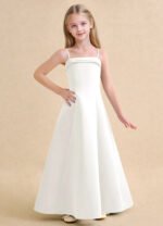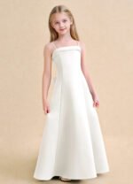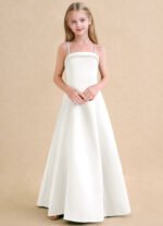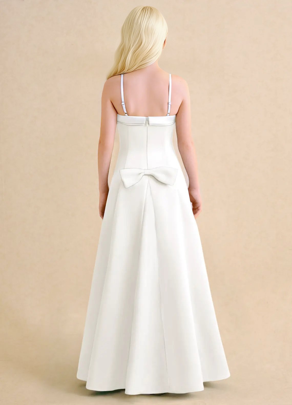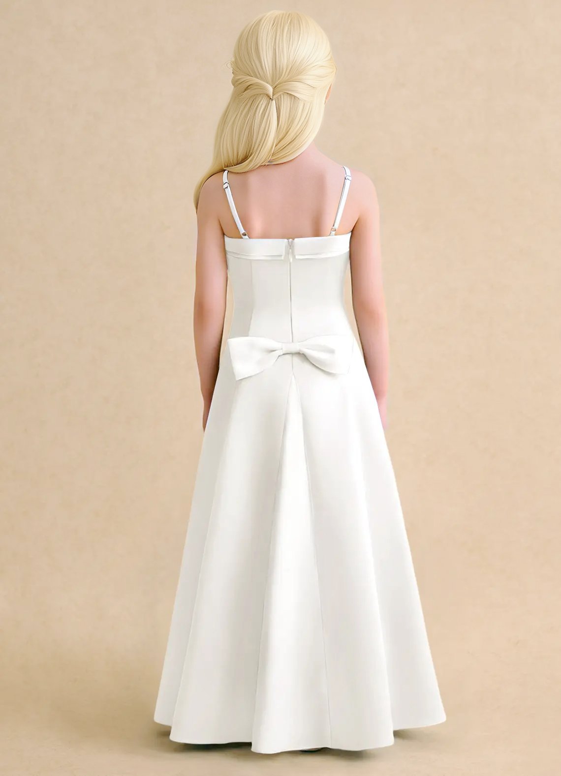 The Izel dress is a floor-length flower girl gown featuring an elegant A-line silhouette crafted from smooth matte satin. It showcases a sleeveless straight neckline with a fold-over detail and adjustable spaghetti straps for a customized fit. Structured pleats in the skirt and a statement bow at the back waist add sophistication and charm.