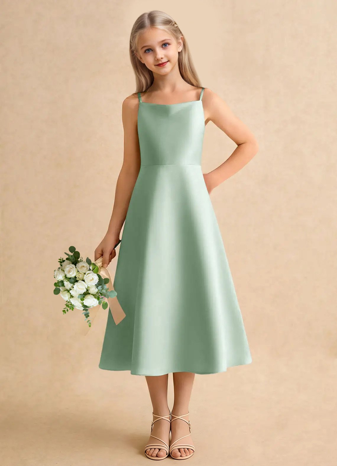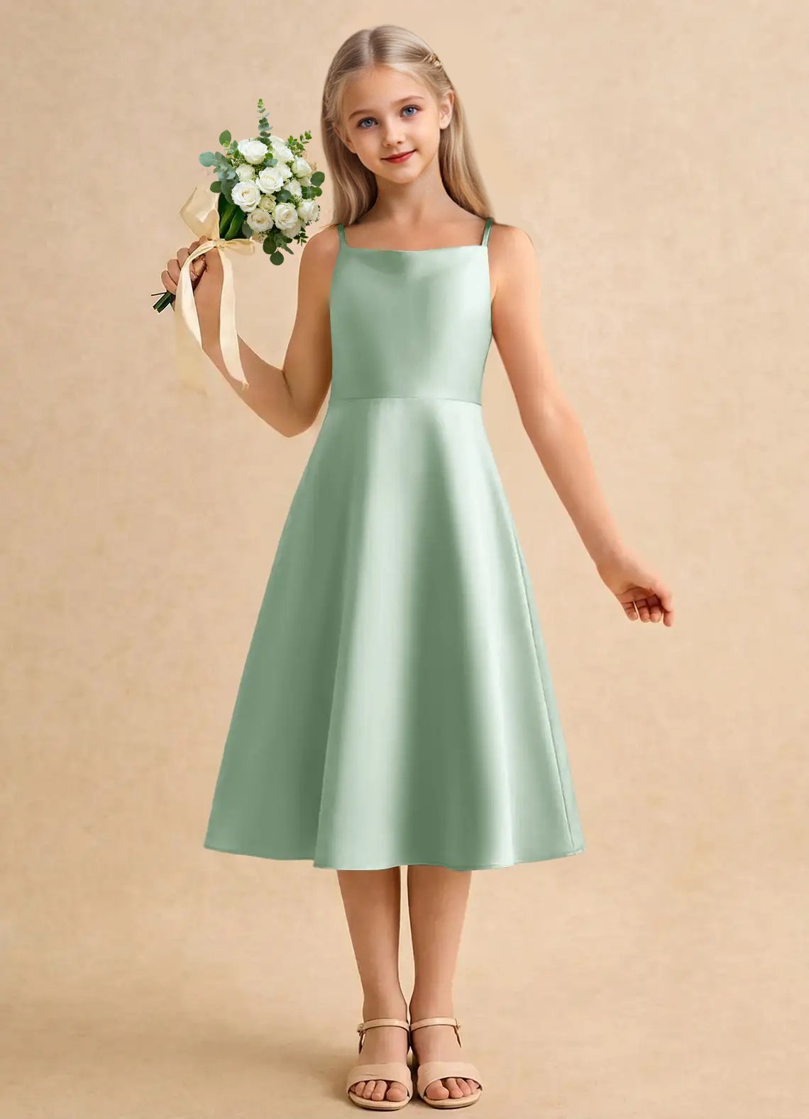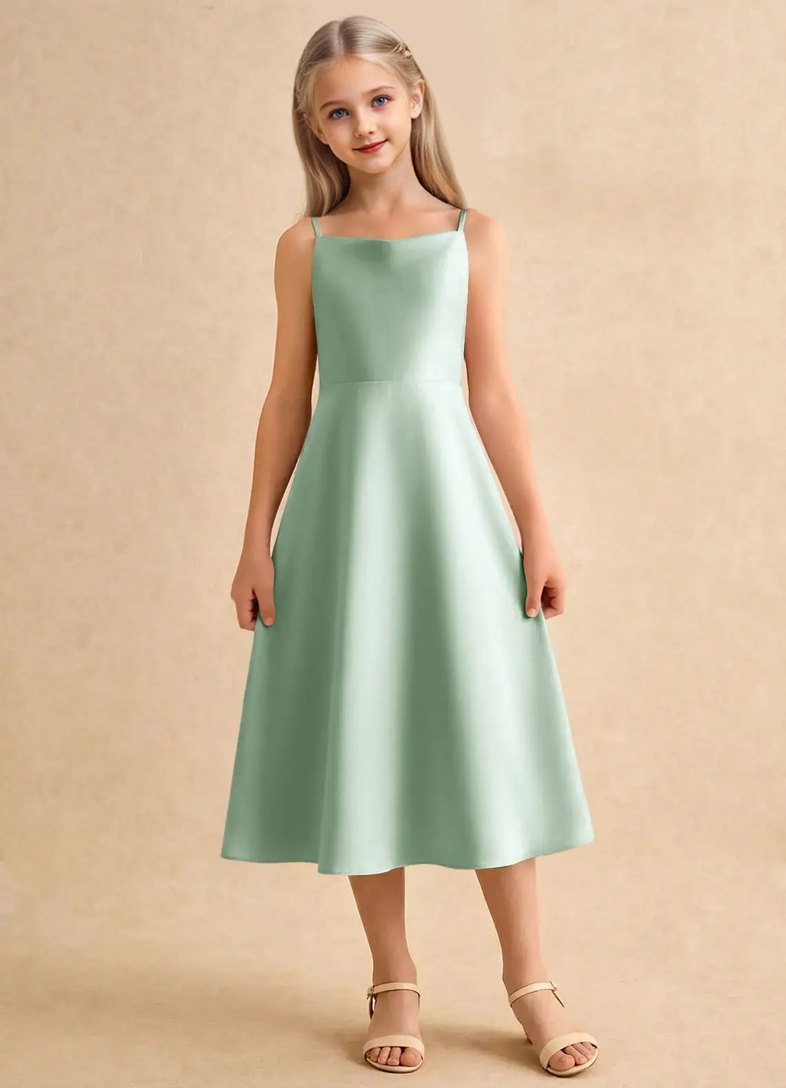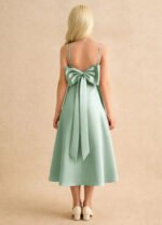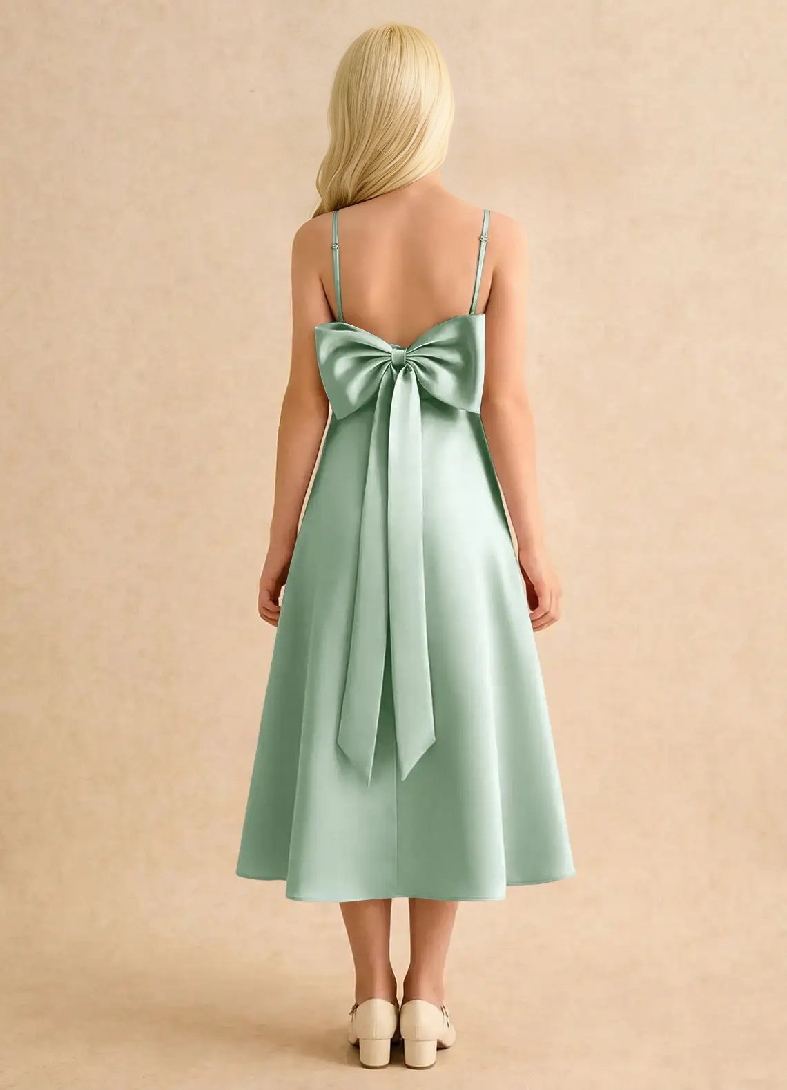 The name of the dress is Jaella. The dress is a Tea length A-line silhouette made of matte satin. The dress has a scoop neckline with spaghetti straps and a low back adorned with a statement bow at the back waist. The dress features a softly pleated skirt for movement.
