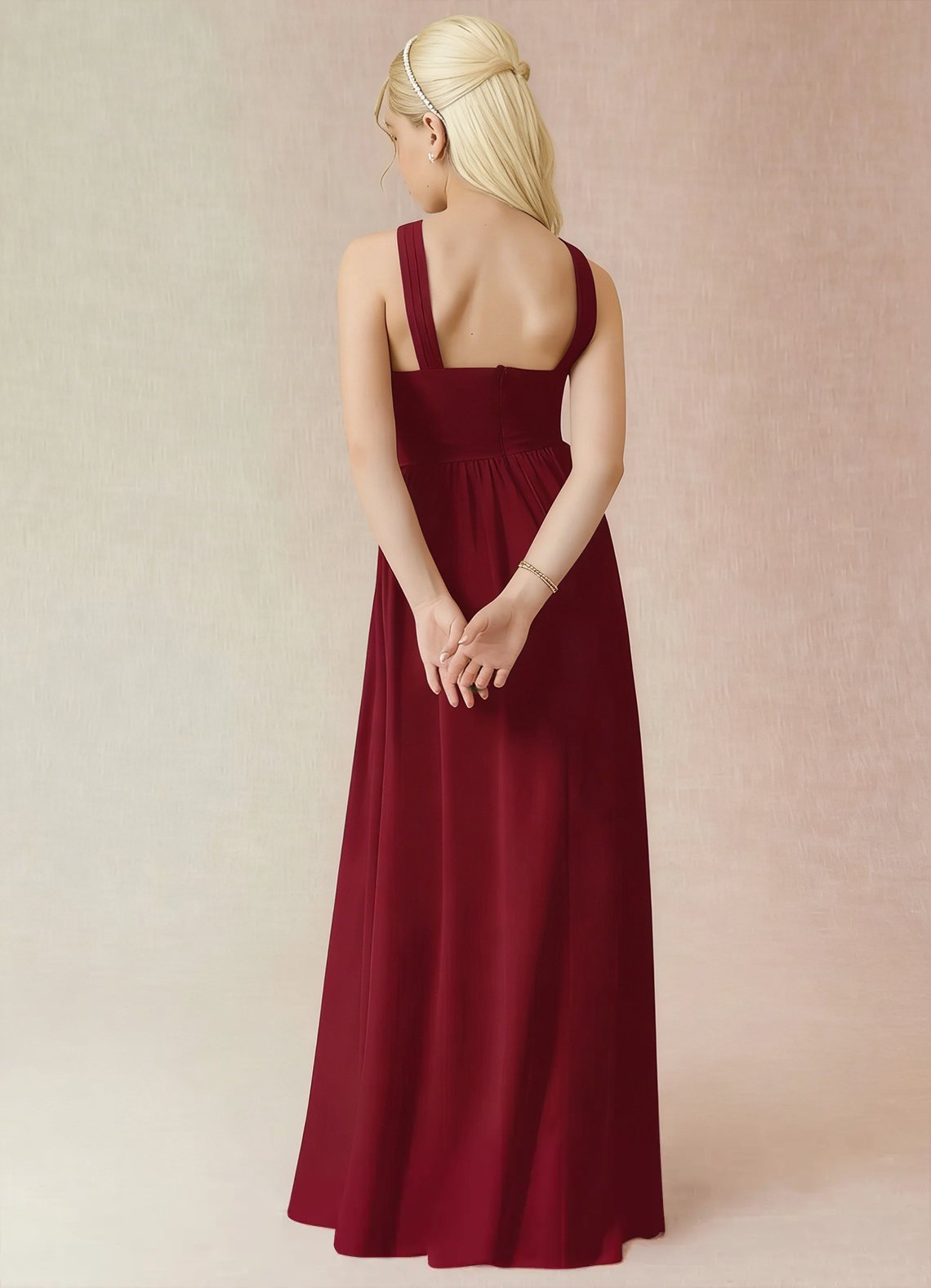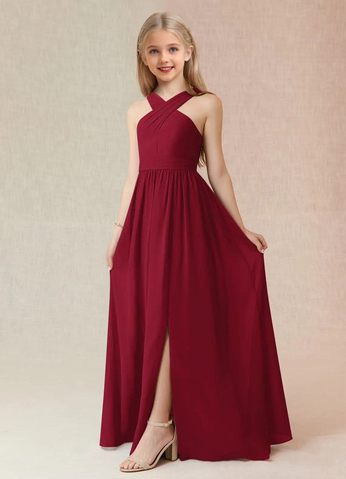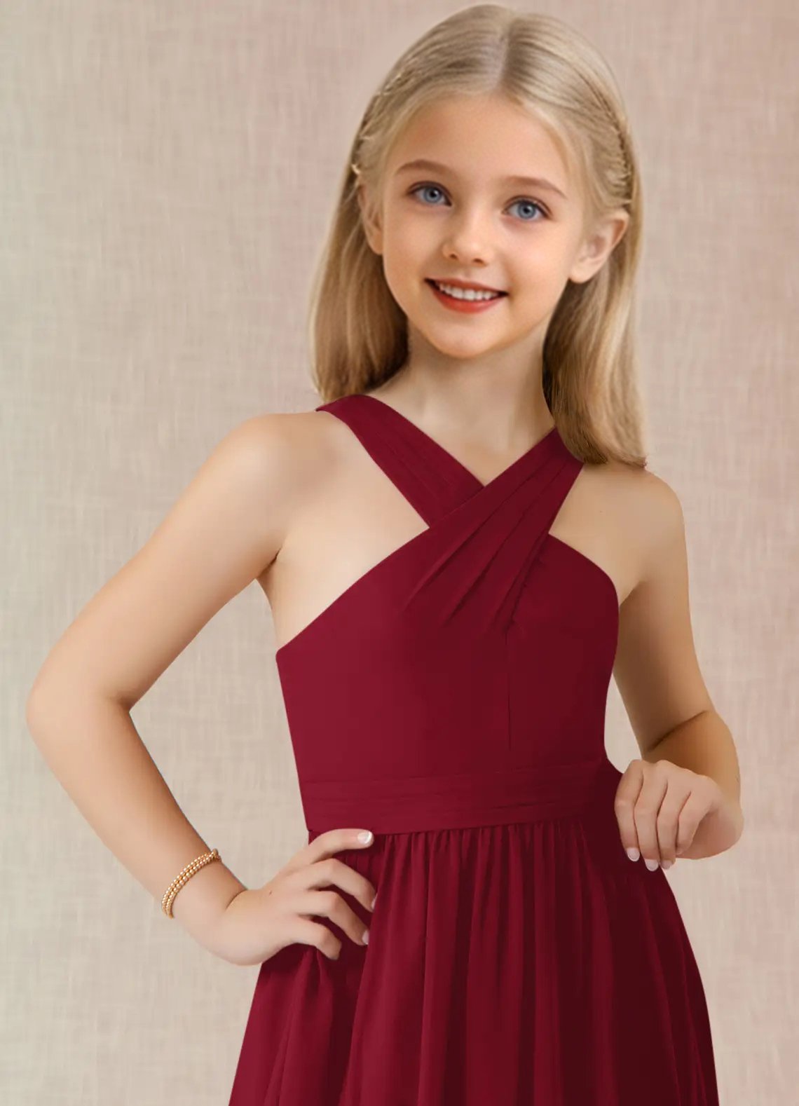 Jiya is a clean and cute choice for your junior bridal party. She features a modern overlapped halter V-neckline, decorated with pleats. Her chiffon, floor length skirt is cut in an A-line silhouette and embellished with delicate tucked pleats in front, and boxed pleats on the back. She is completed with a lovely waist sash to bring the look together.