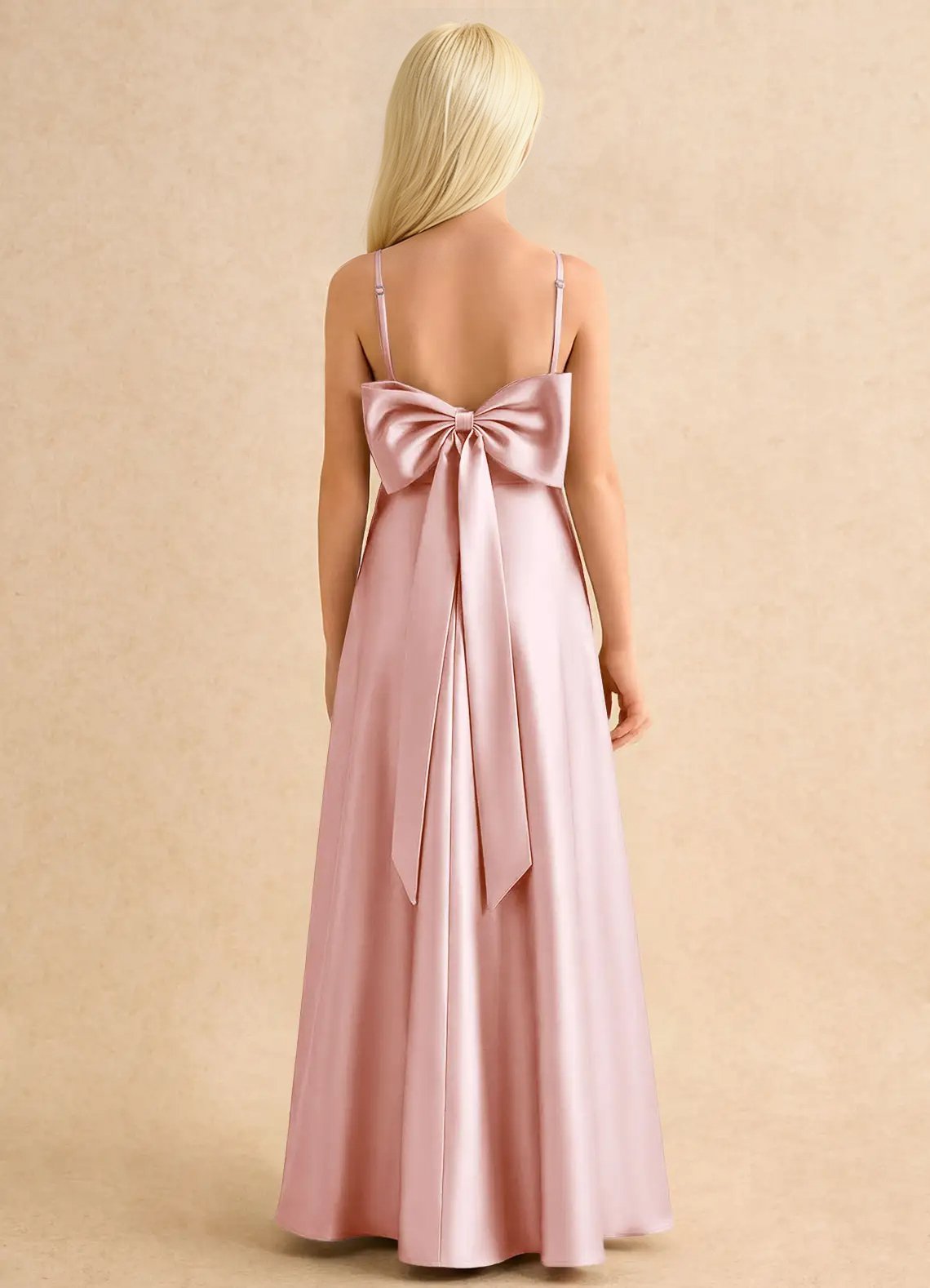 The name of the dress is Joella. The dress is a floor length A-line silhouette made of stretch satin. The dress has a scoop neckline with spaghetti straps and a low back adorned with a statement bow at the back waist. The dress features a softly pleated skirt for movement.