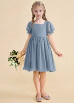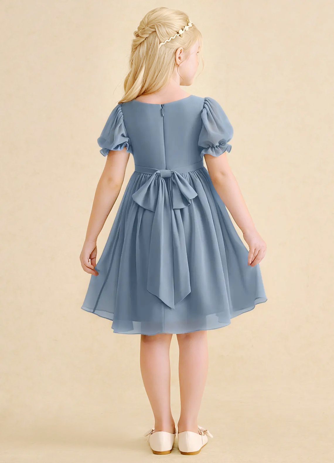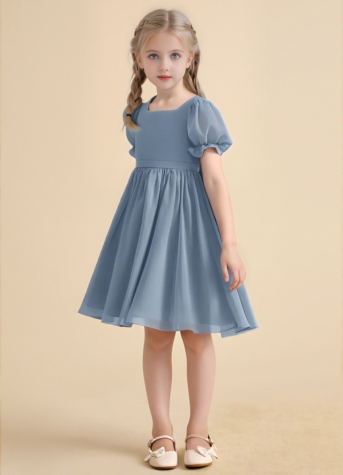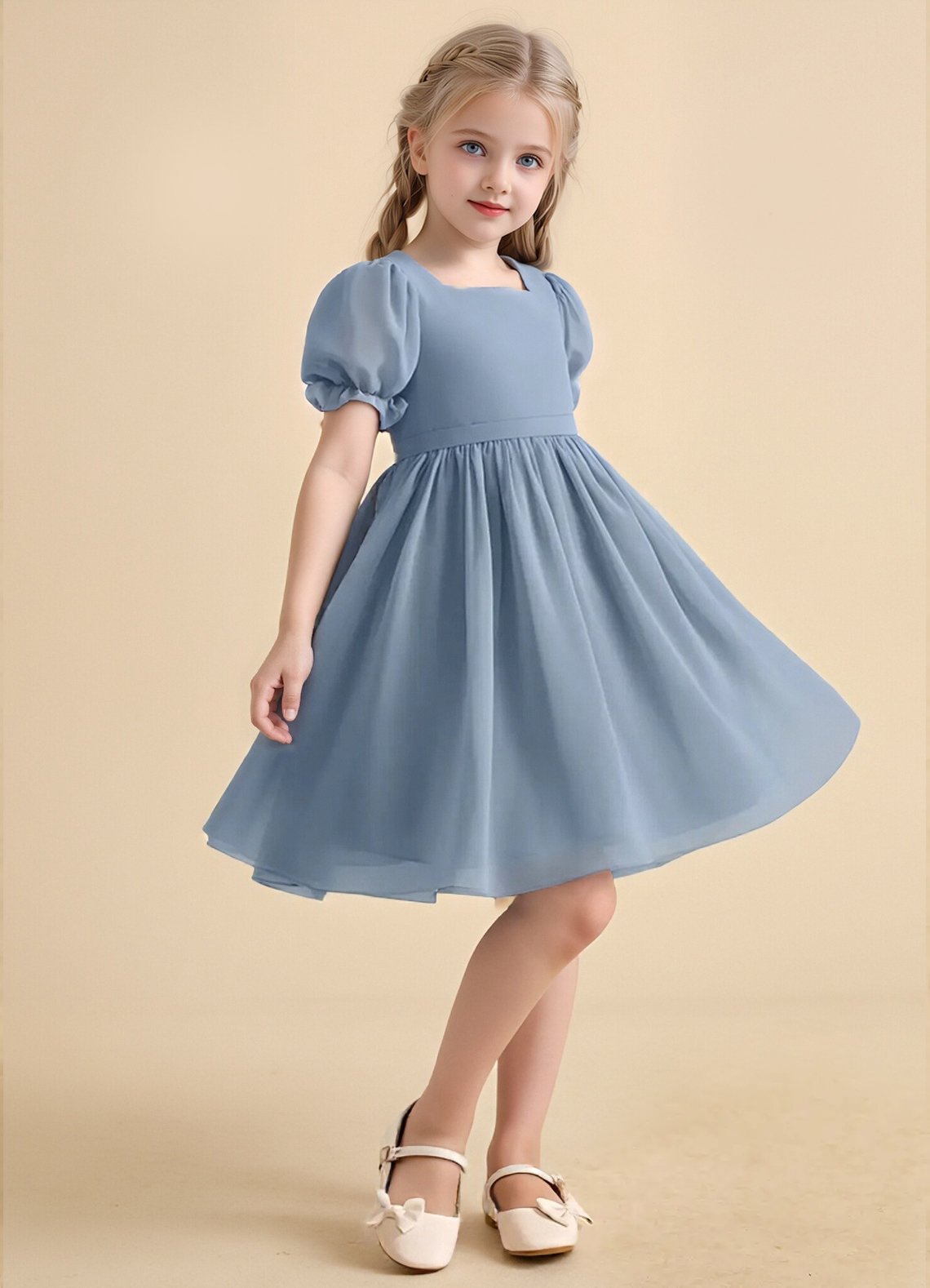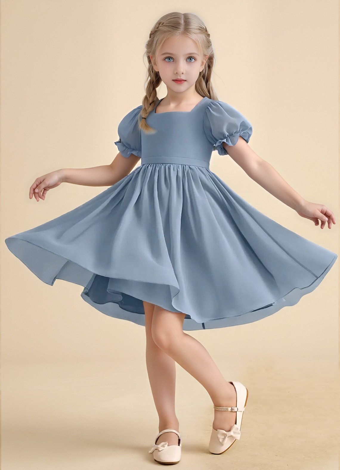 This charming knee-length A-line dress is crafted from soft chiffon, featuring a square neckline, puff sleeves with delicate ruffle details, and a pleated skirt that flows beautifully with every step. The added belt with a sweet bow at the back completes this adorable look.