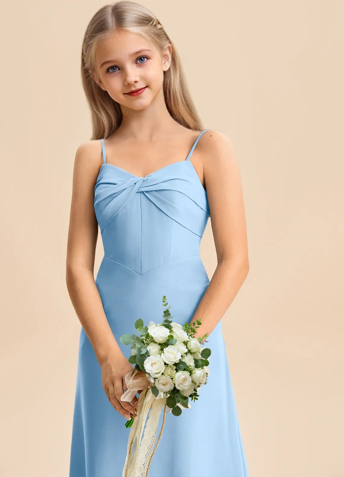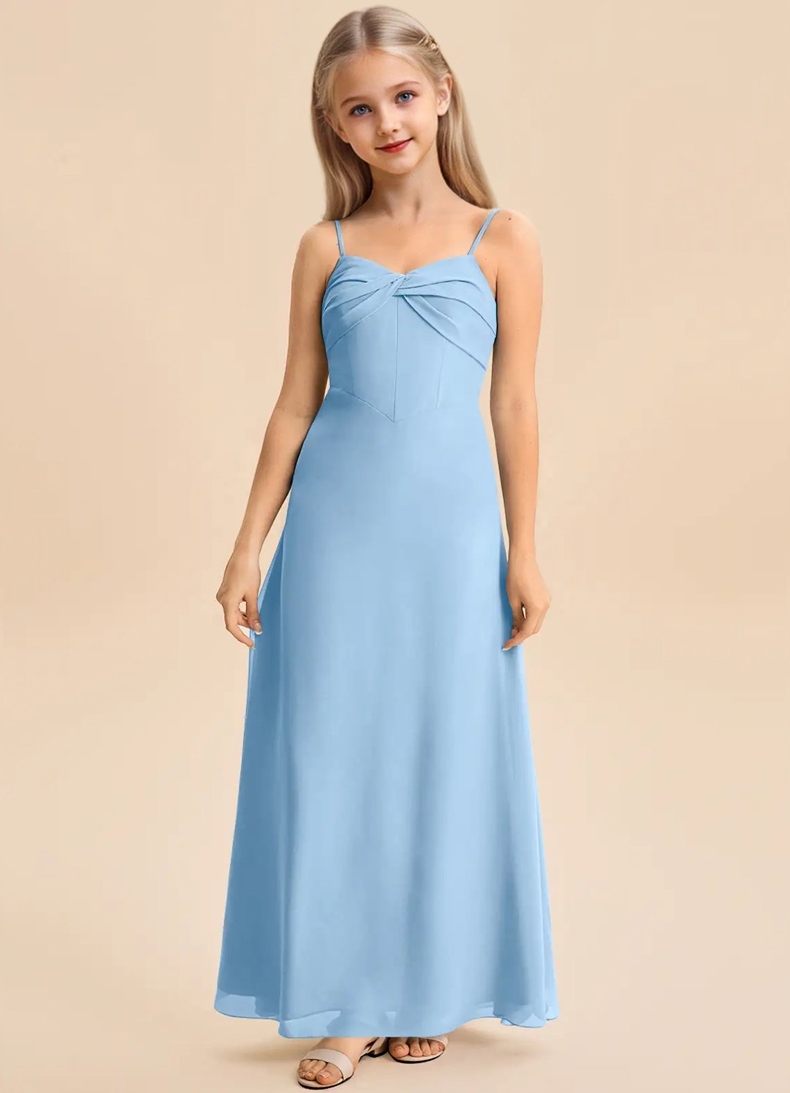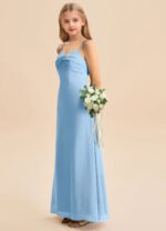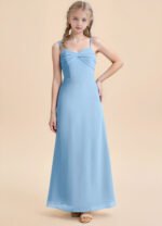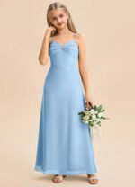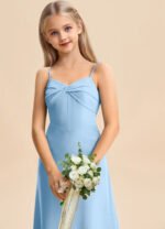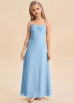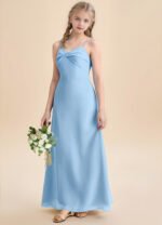 The Jordyn junior bridesmaid dress is a floor-length A-line gown in soft chiffon, featuring a sweetheart neckline with a twisted bow detail across the bodice and delicate spaghetti straps. The sleeveless design flows into a smooth, untextured skirt for a simple and elegant look.