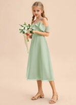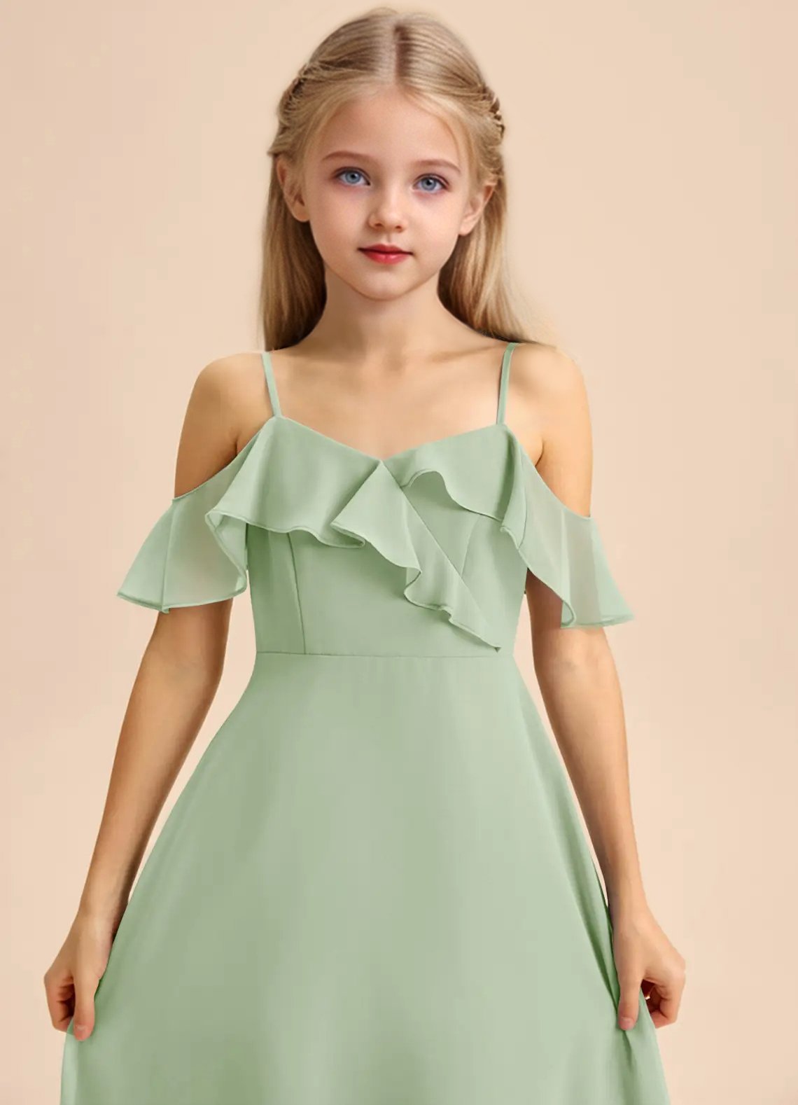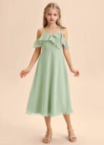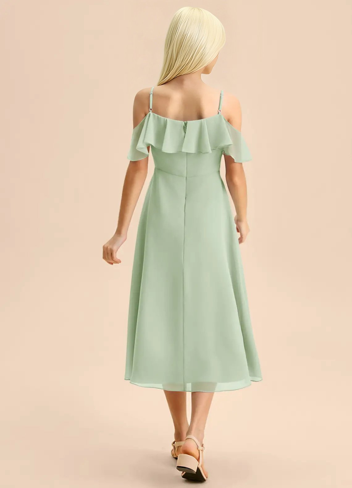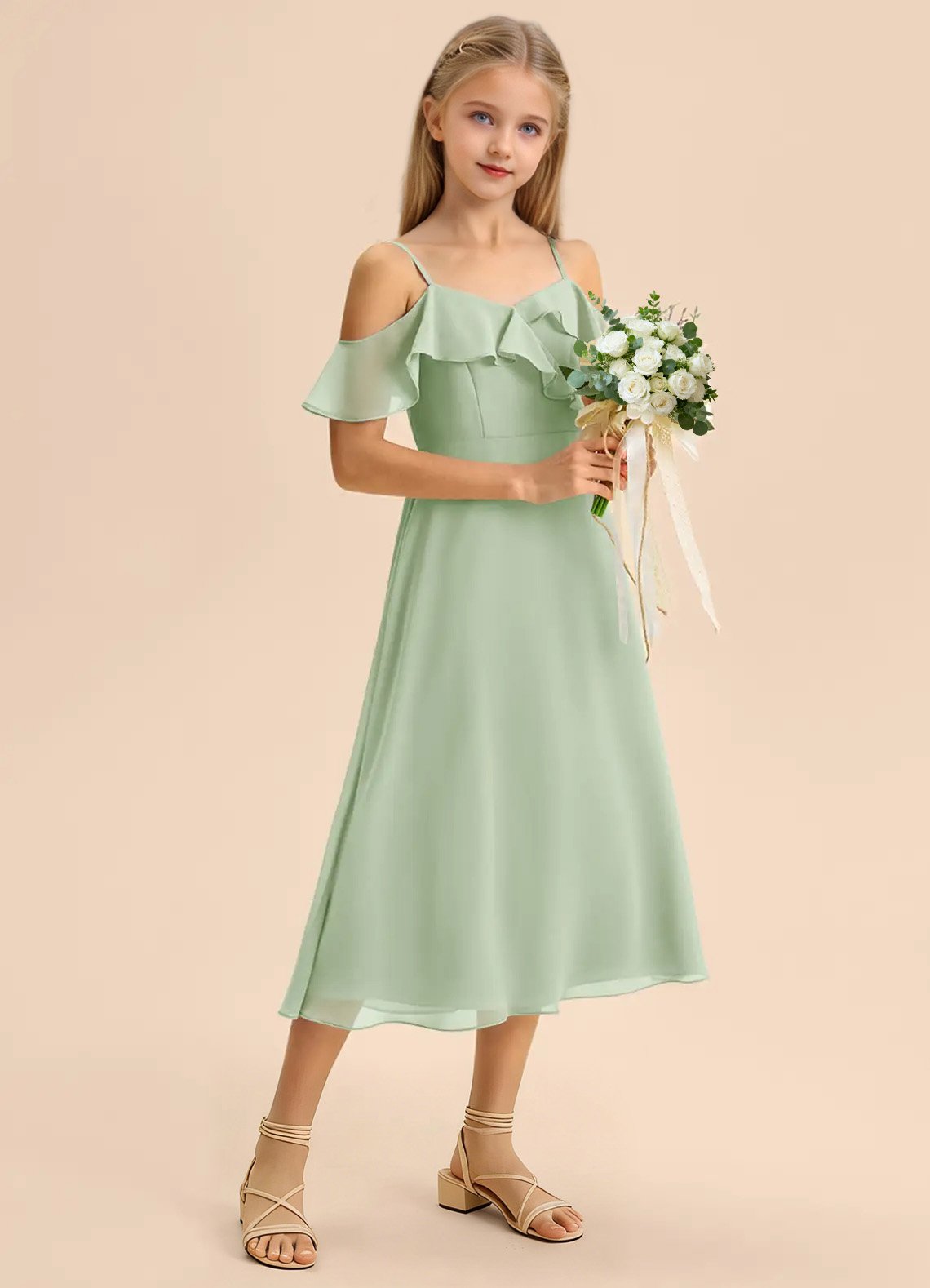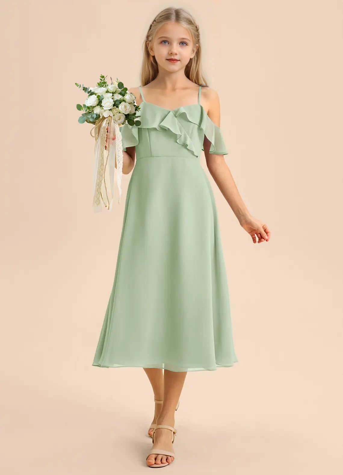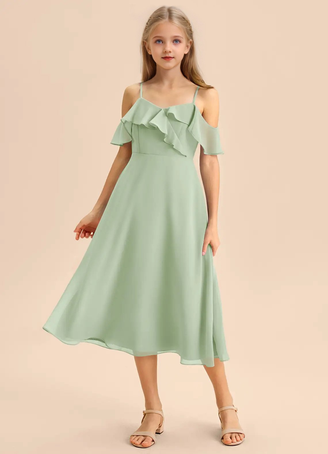 This tea-length junior bridesmaids dress features a soft A-line silhouette crafted from airy chiffon. The sleeveless design highlights a ruffled V-neckline with spaghetti straps and off-shoulder ruffle sleeves for a graceful cold-shoulder effect. A softly pleated skirt adds light, effortless movement.