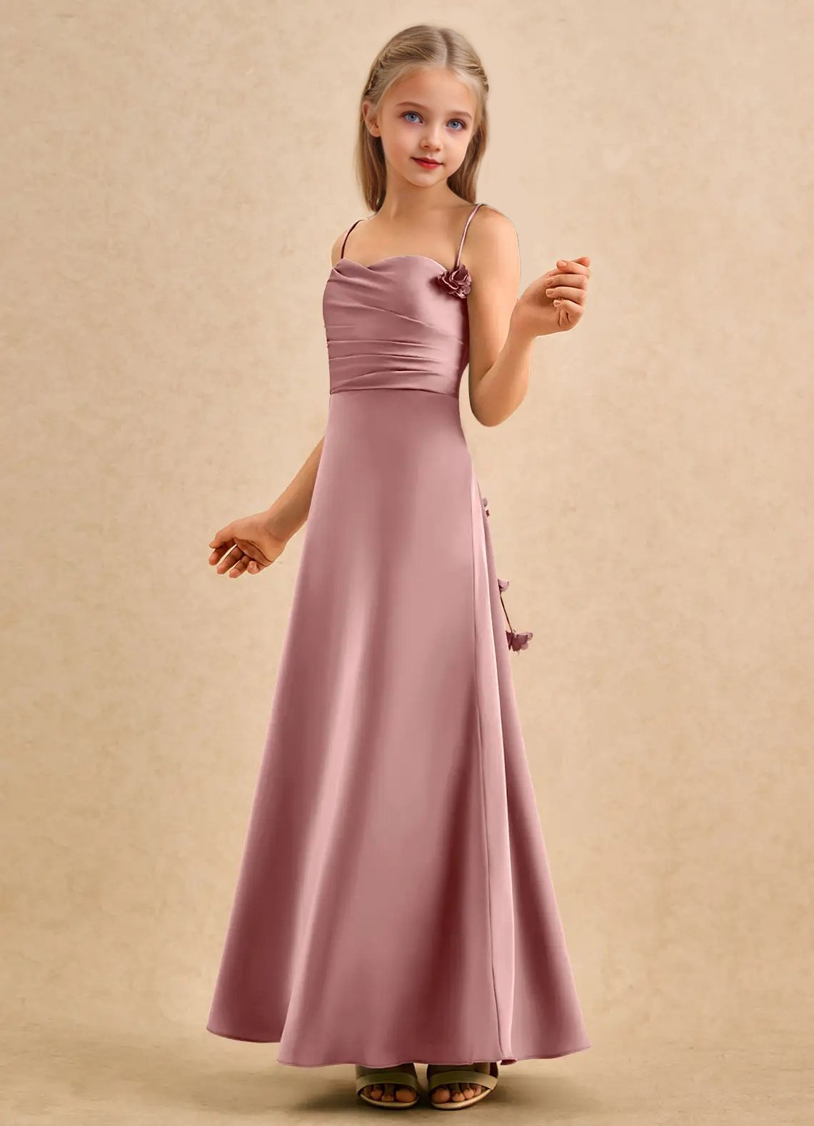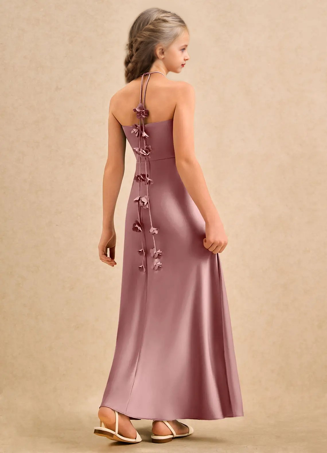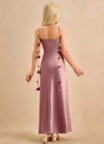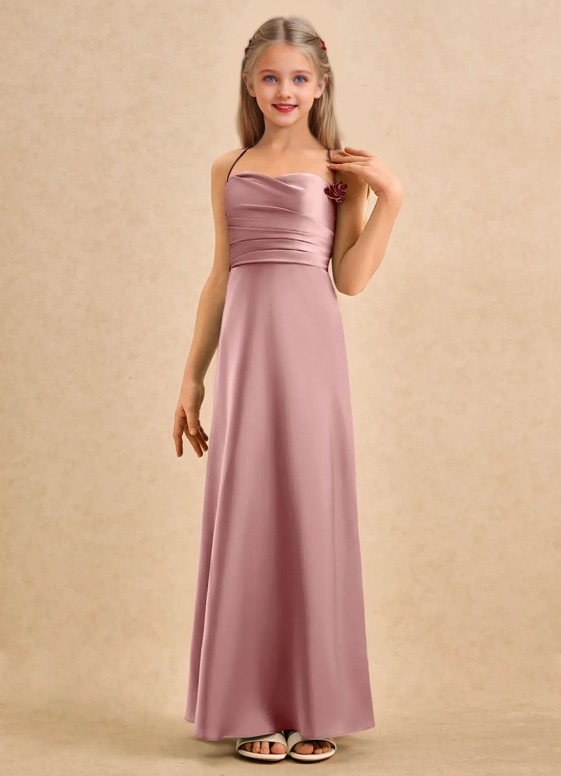 The Kandi dress is a floor-length A-line gown for young girls, crafted from smooth stretch satin. It features a sweetheart neckline with a pleated bodice for added detail. The halter design has spaghetti straps that tie into a bow at the nape of the neck, finished with delicate 3D flowers. The softly pleated skirt flows gracefully, allowing easy movement, perfect for a flower girl.