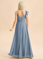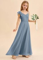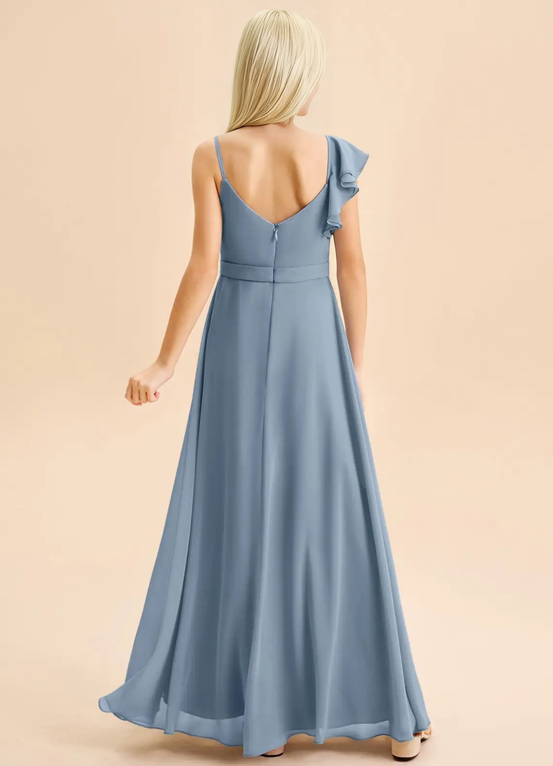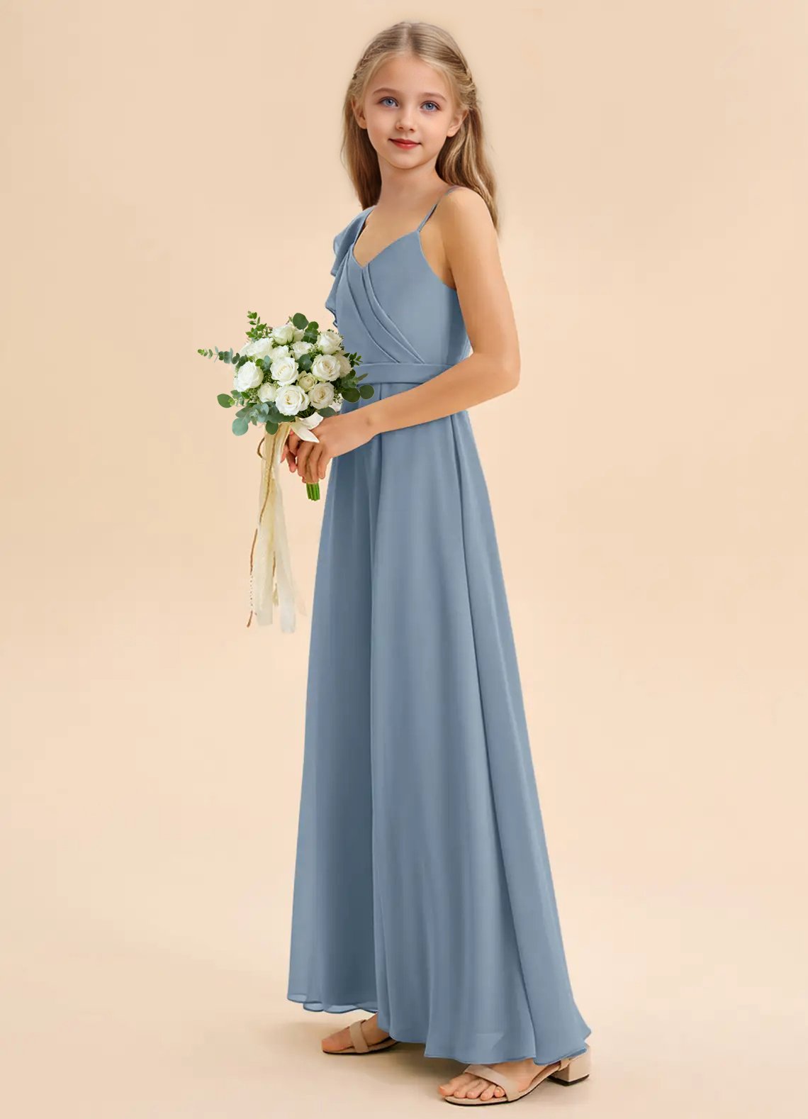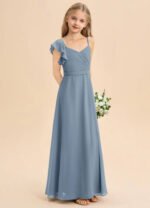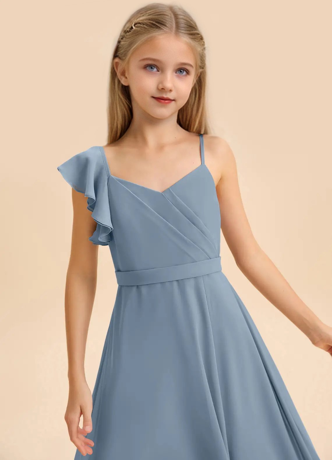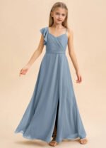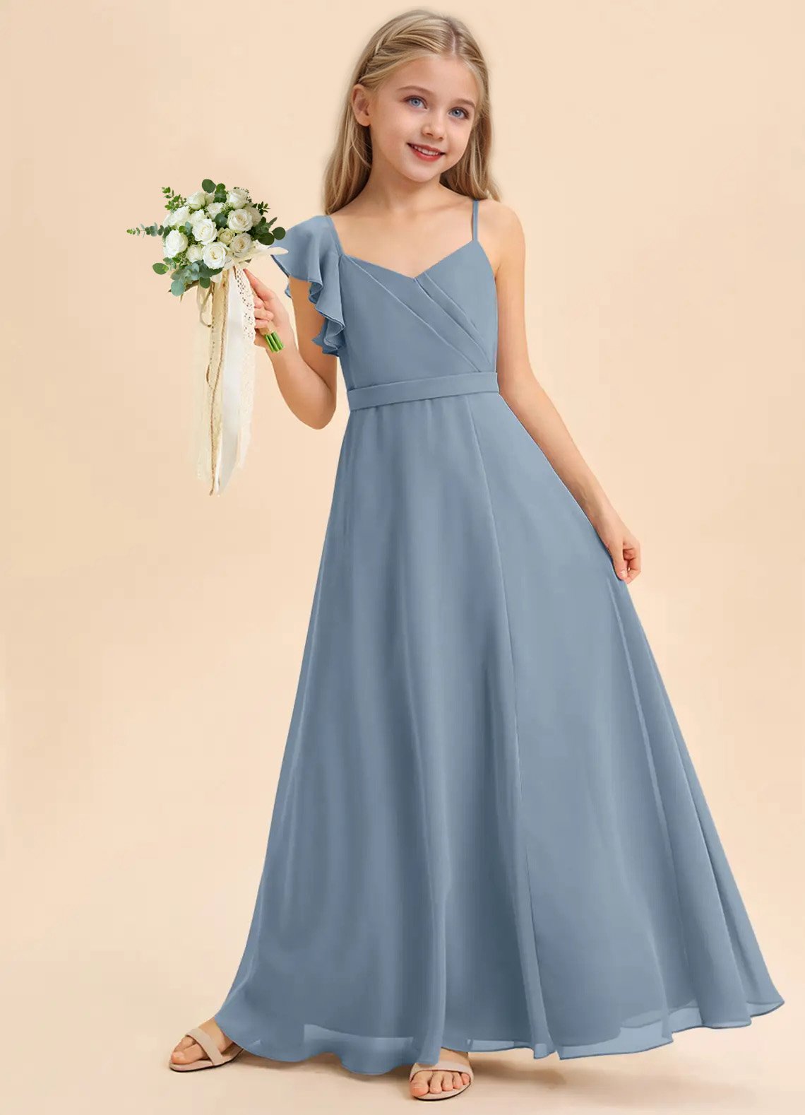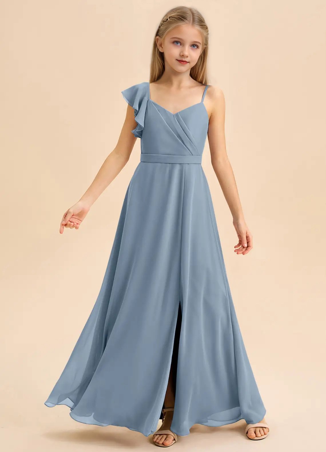 This floor-length junior bridesmaids dress features a flattering A-line silhouette crafted from lightweight chiffon. A V-neckline with adjustable spaghetti straps and removable flutter sleeves offers versatile styling, while a belted waist enhances the silhouette. The softly pleated skirt with a leg slit adds graceful movement and ease.