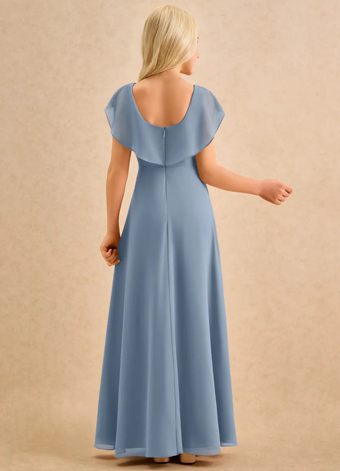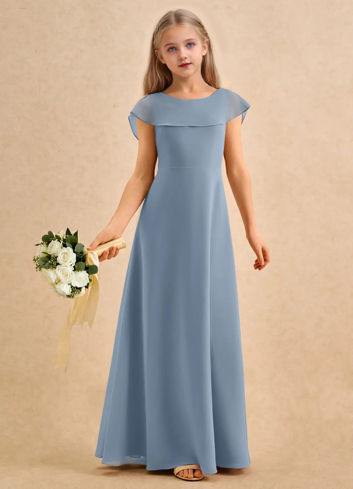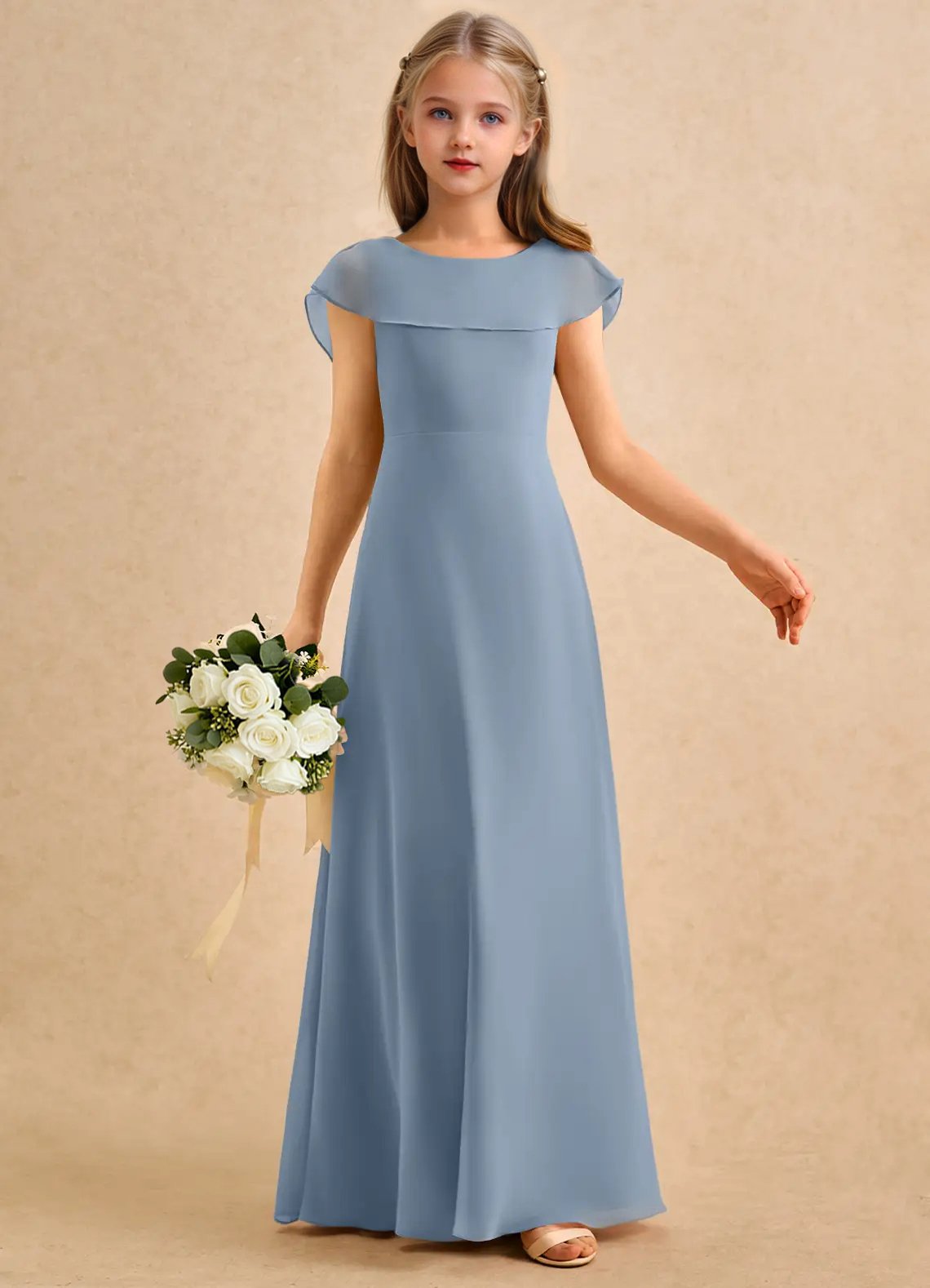 Kittie is a floor-length flower girl dress crafted from soft chiffon, featuring an A-line silhouette with a scoop neckline and delicate flutter sleeves attached to a ruffled neckline panel. The loosely pleated skirt creates graceful movement, making it a charming choice for special occasions.