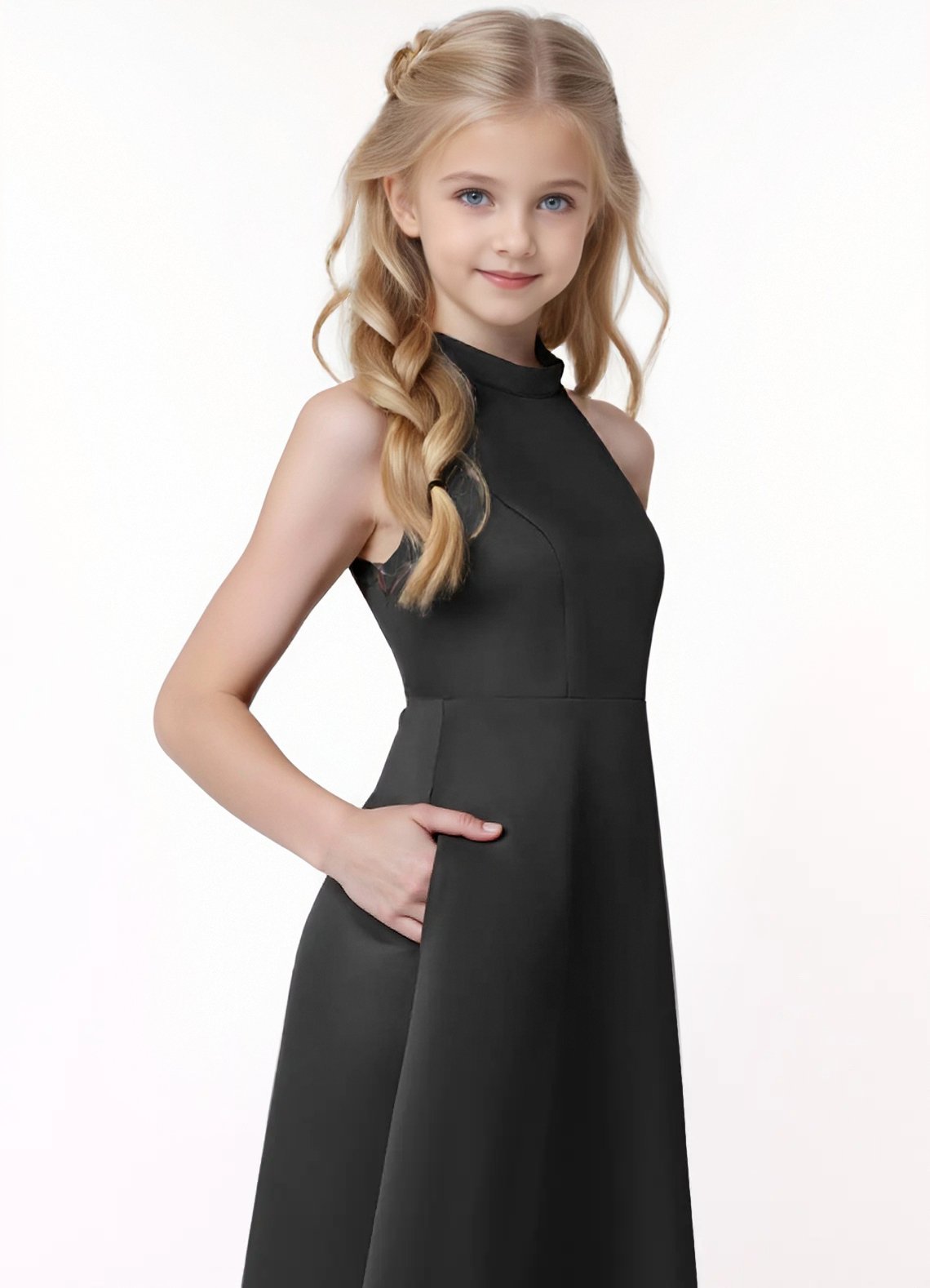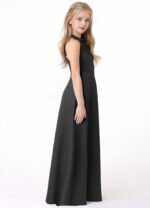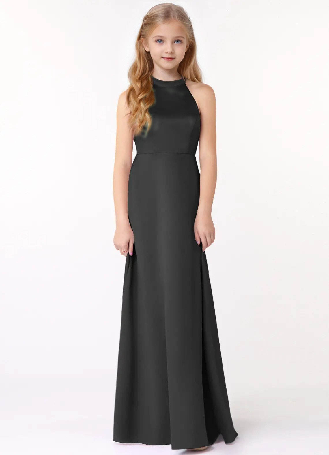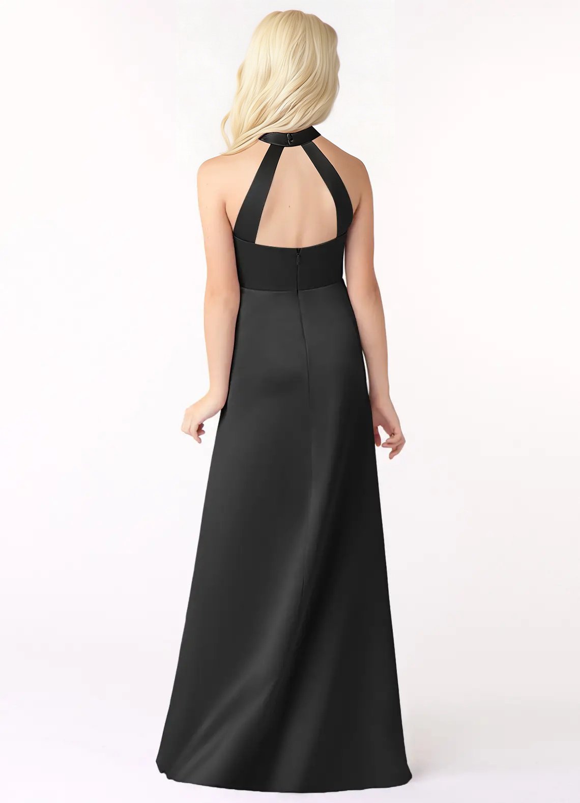 Go for a classic and timeless look in Laurel, our junior bridesmaid dress cut from stretch satin. She features a halter neckline paired with a keyhole back. The look is complete with a floor length A line skirt.