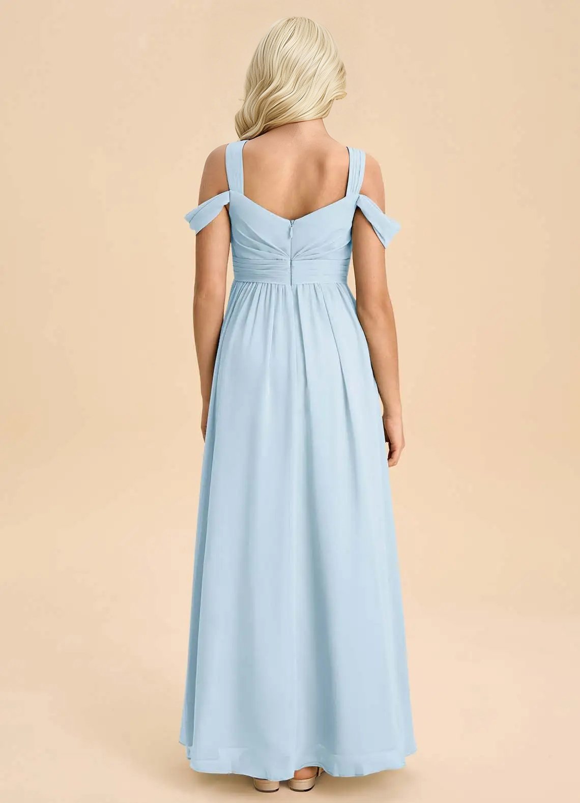 Have your junior bridesmaids look exquisite wearing Lianne. Made from chiffon, she features a sweetheart neckline with elegant pleating details and tank straps that are joined by pleated off-the-shoulder straps. Additional pleating delicately encircles an empire waistline, and leads to a flattering floor-length skirt styled with a side leg slit.
