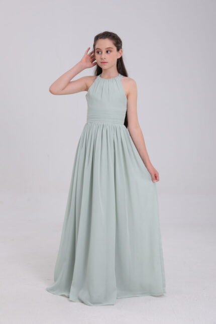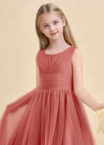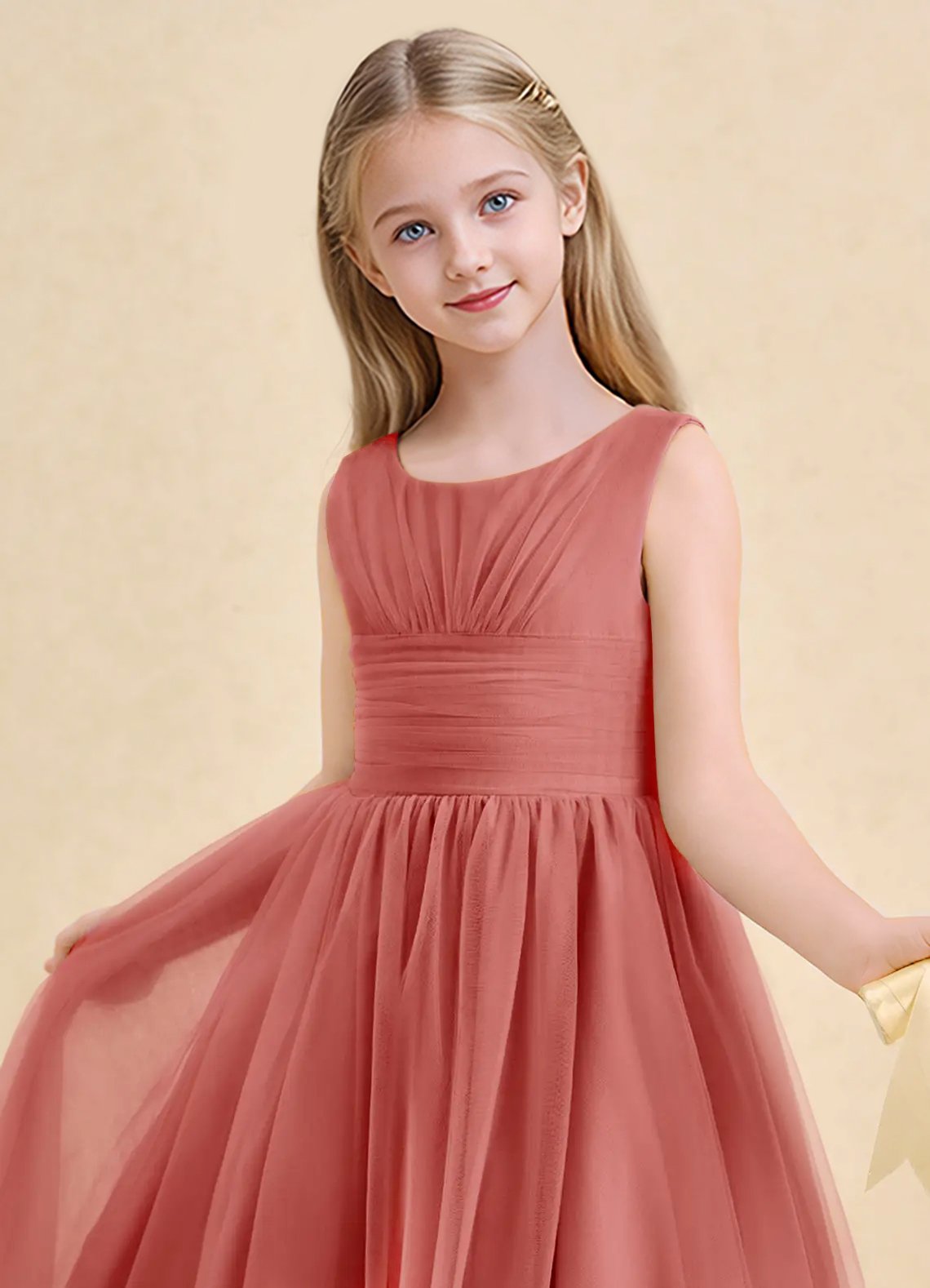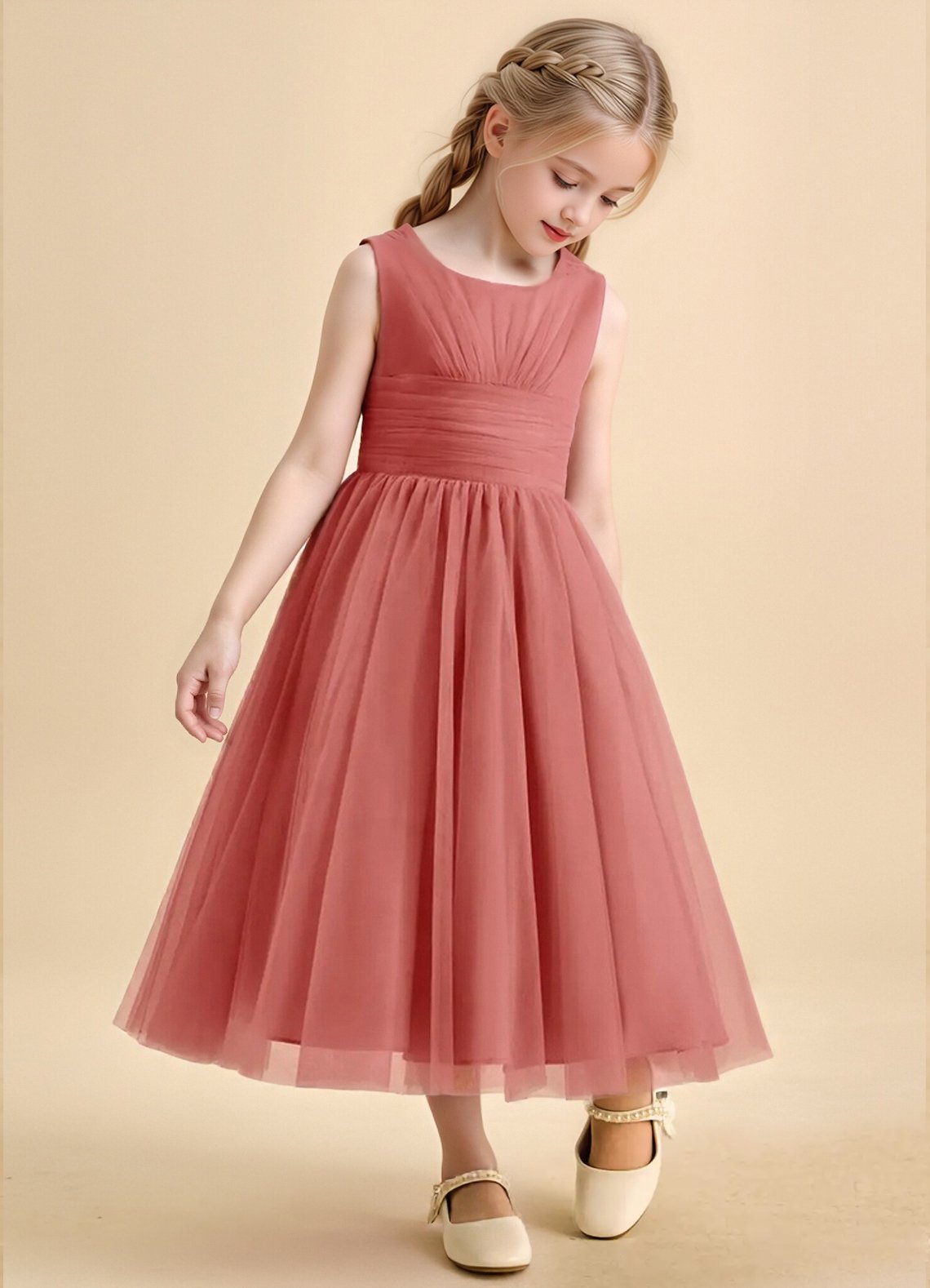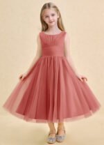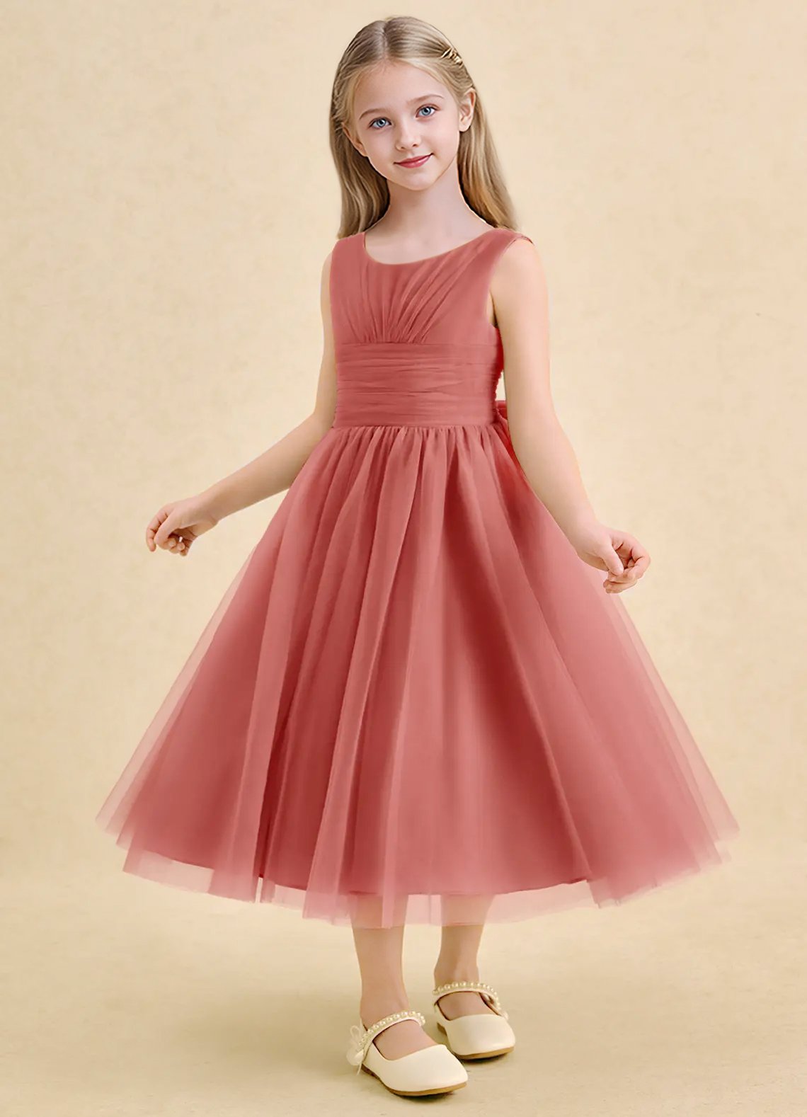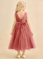 The Macaron flower girl dress is a charming tea-length tulle gown featuring a soft A-line silhouette with a scoop neckline and elegant V-back. The pleated bodice flows into a pleated waistband accented by a statement bow at the back, while the full skirt adds beautiful volume and movement for a sweet, timeless look.