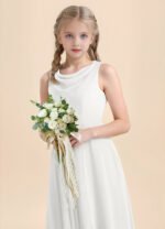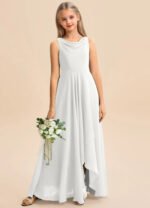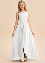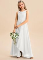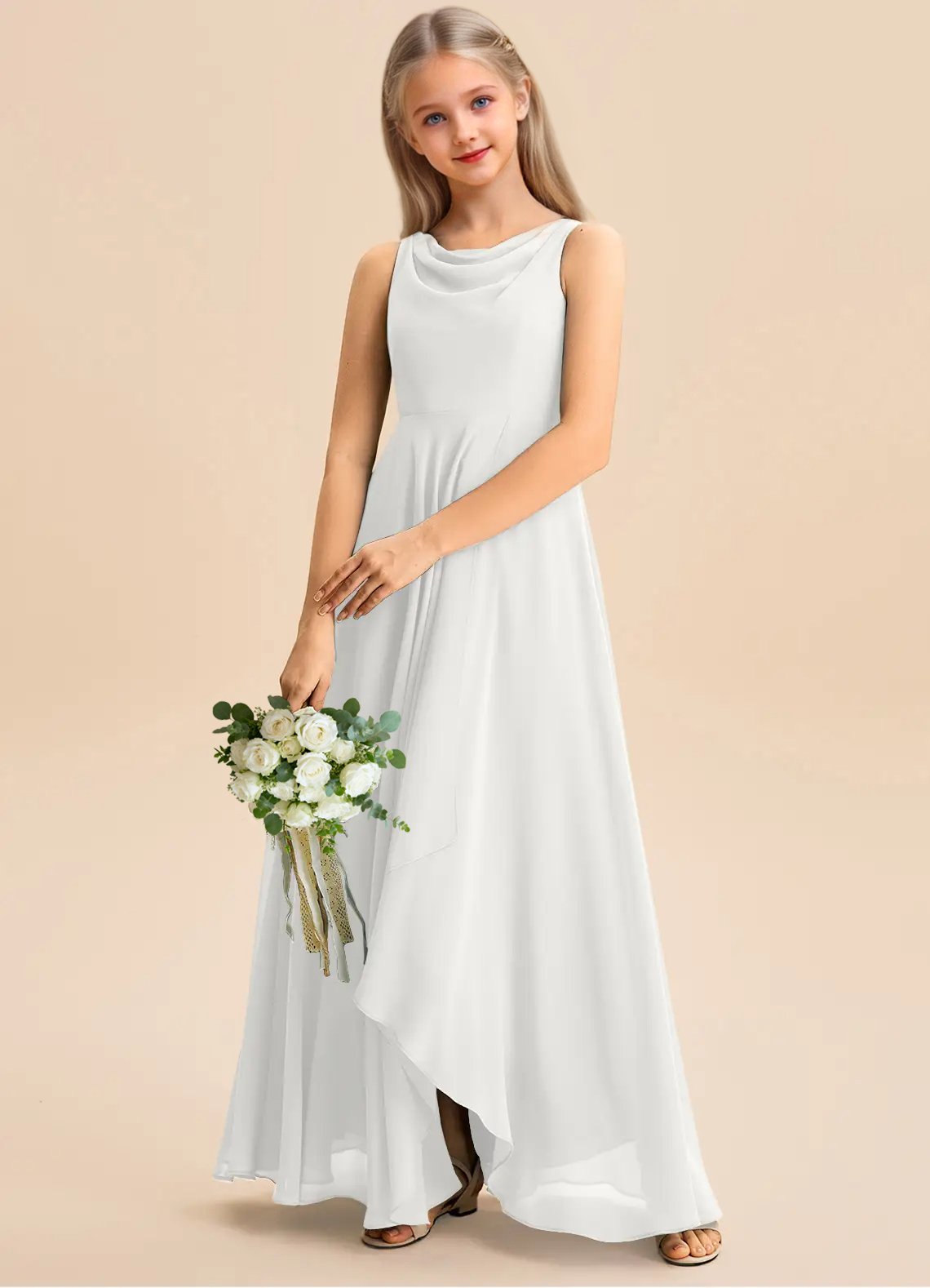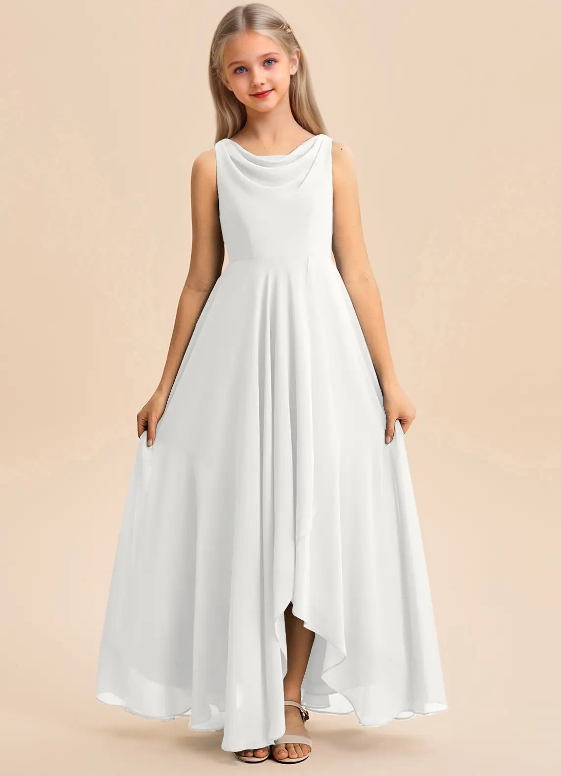 Mannie is a stylish asymmetrical junior bridesmaid dress crafted from airy chiffon in a flattering A-line silhouette. The sleeveless design features a soft cowl neckline and a self-tie bow at the back waist for a perfect cinched fit. A tightly pleated skirt adds texture and modern movement.