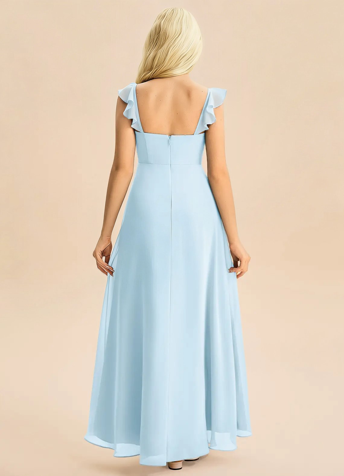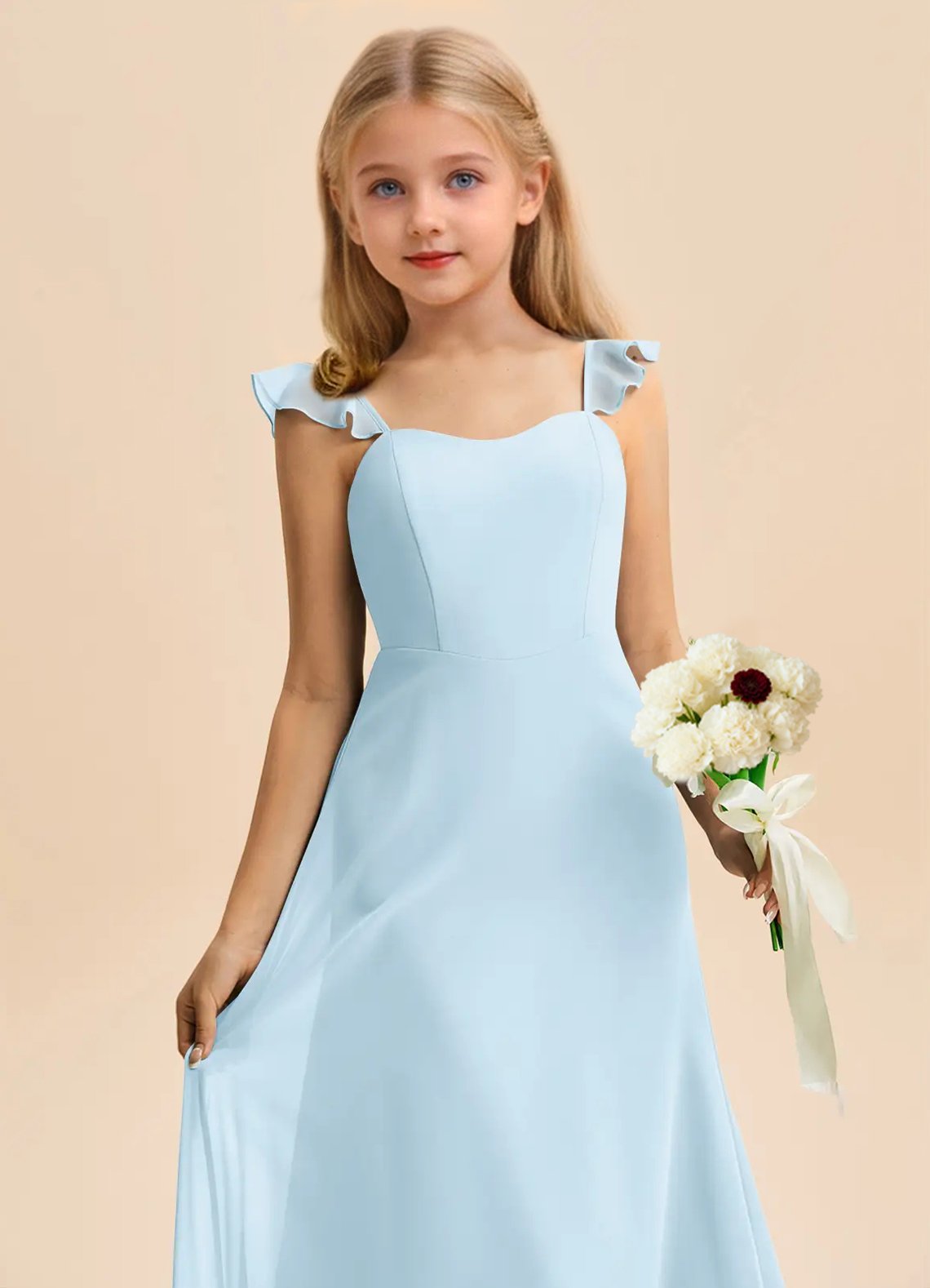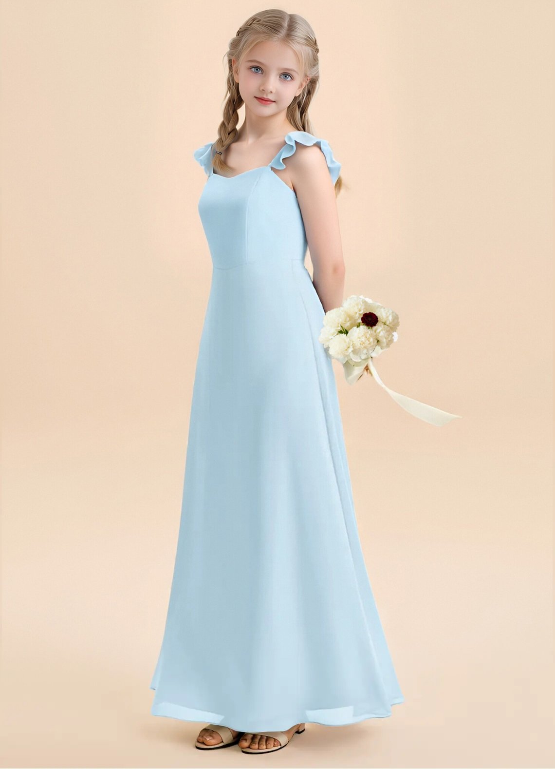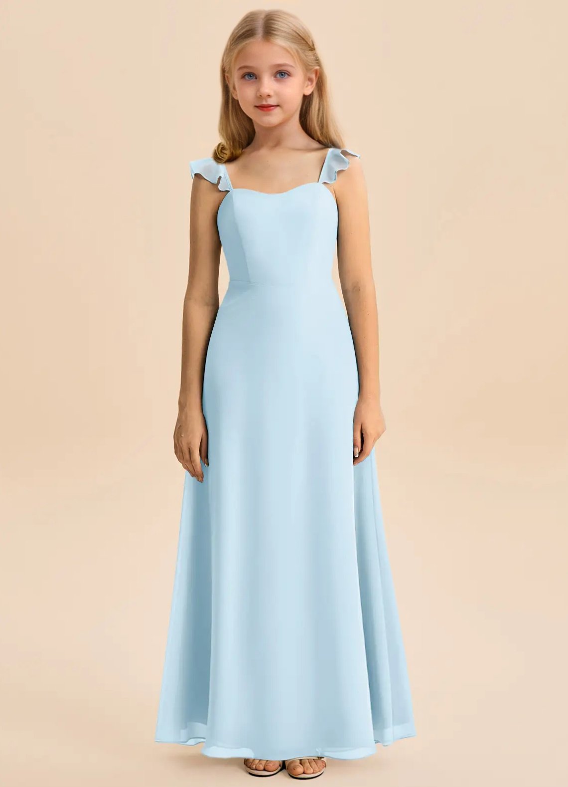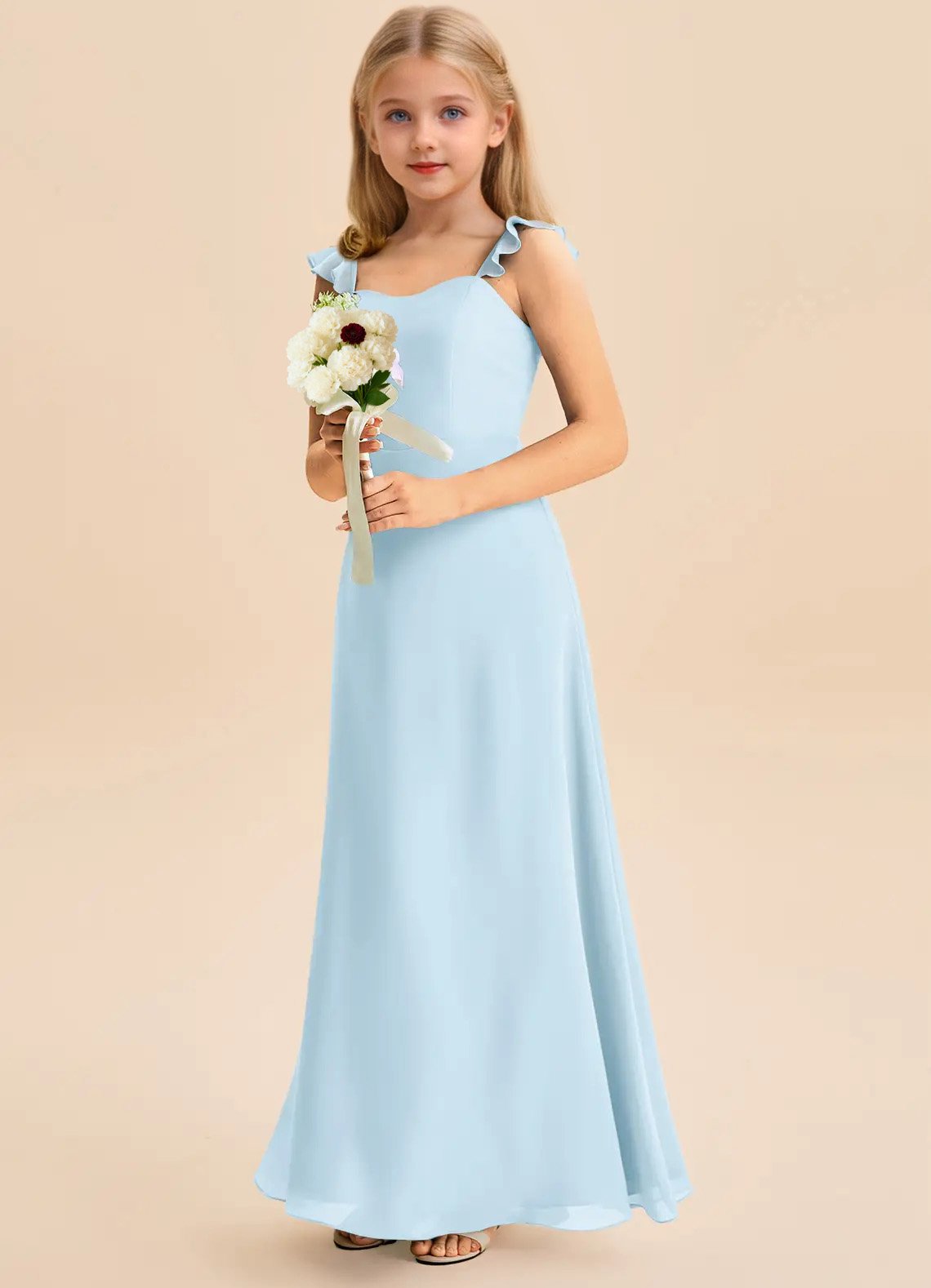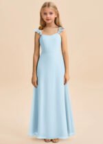 Soft as a whisper, this chiffon ruffle strap A-line junior dress floats like a cloud with its delicate straps and airy silhouette. The lightweight fabric moves beautifully, creating an ethereal look that’s both elegant and playful. Whether twirling on the dance floor at a wedding or making a statement at a formal event, this dress promises graceful movement and understated charm. Perfect for junior bridesmaids, but equally stunning for or any occasion.