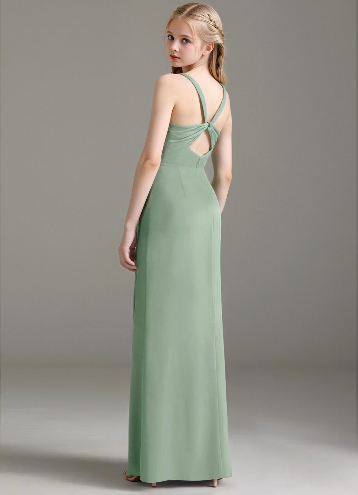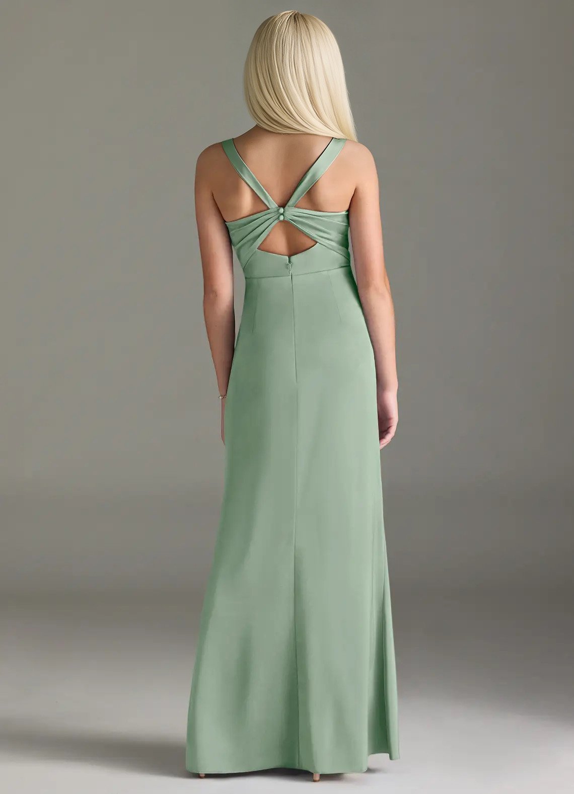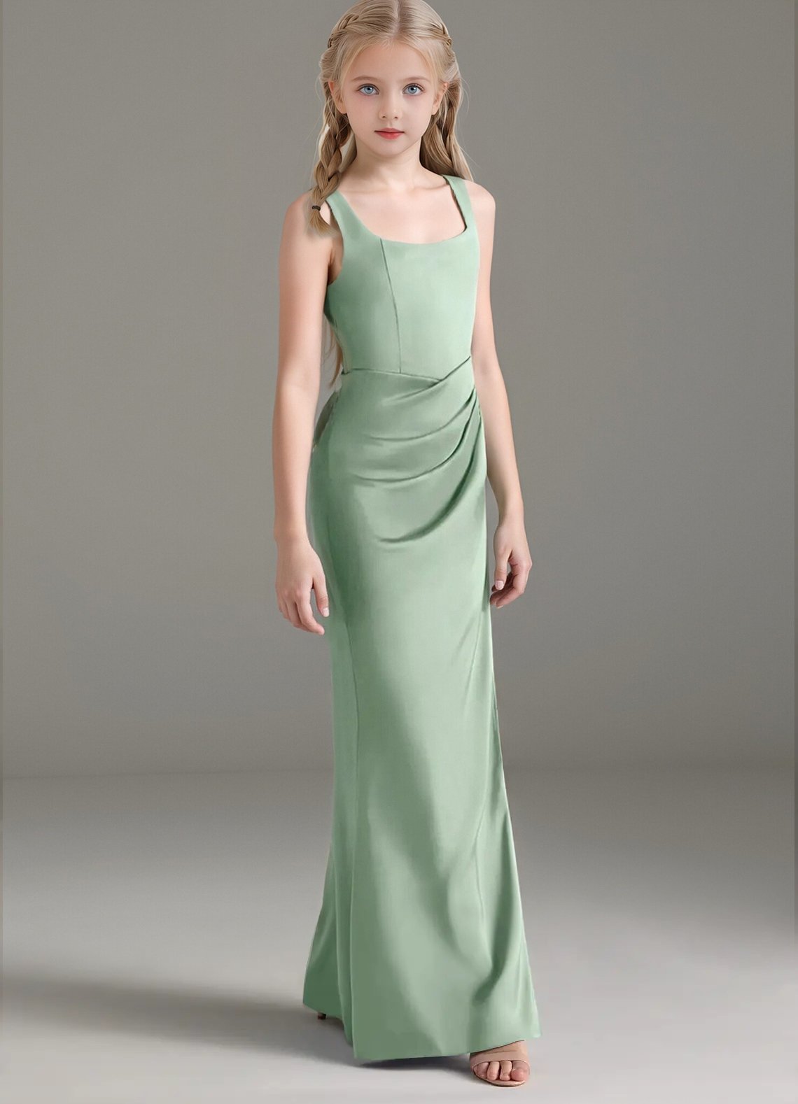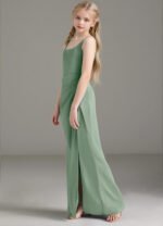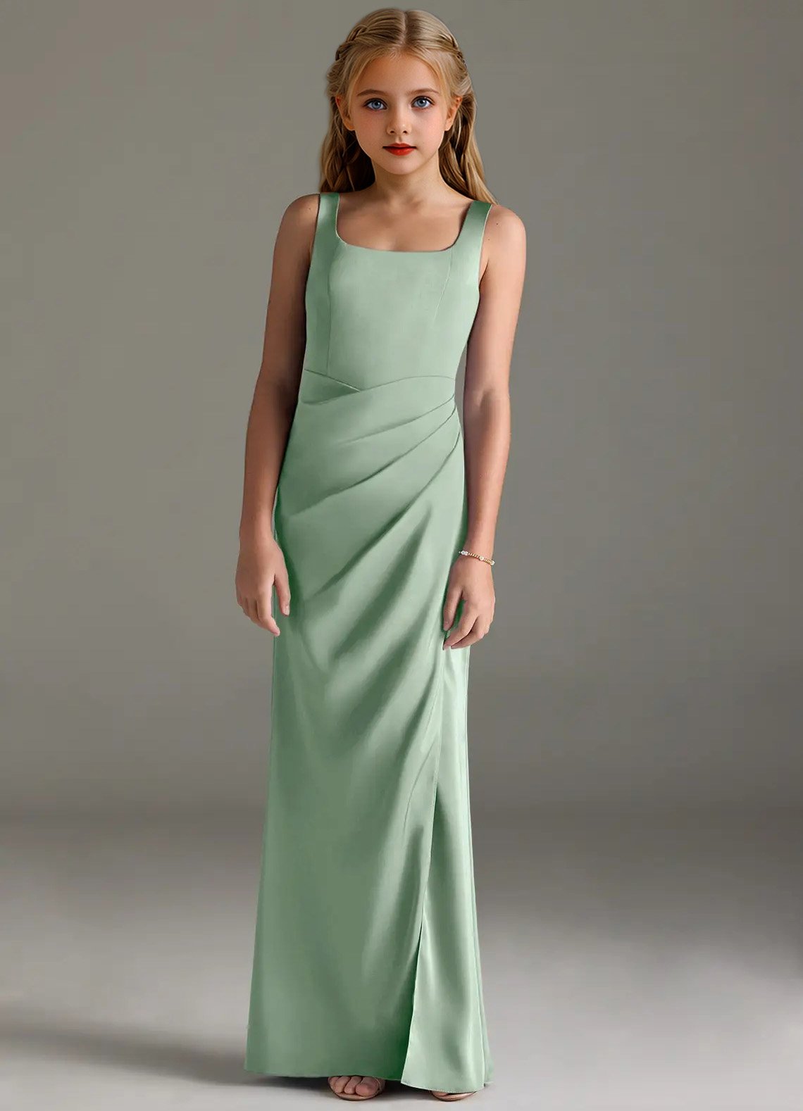 Mero is our stunning junior bridesmaid dress crafted from stretch satin. She features a square neckline paired with straps leading to a keyhole back. The look is complete with a pleated floor length sheath skirt.