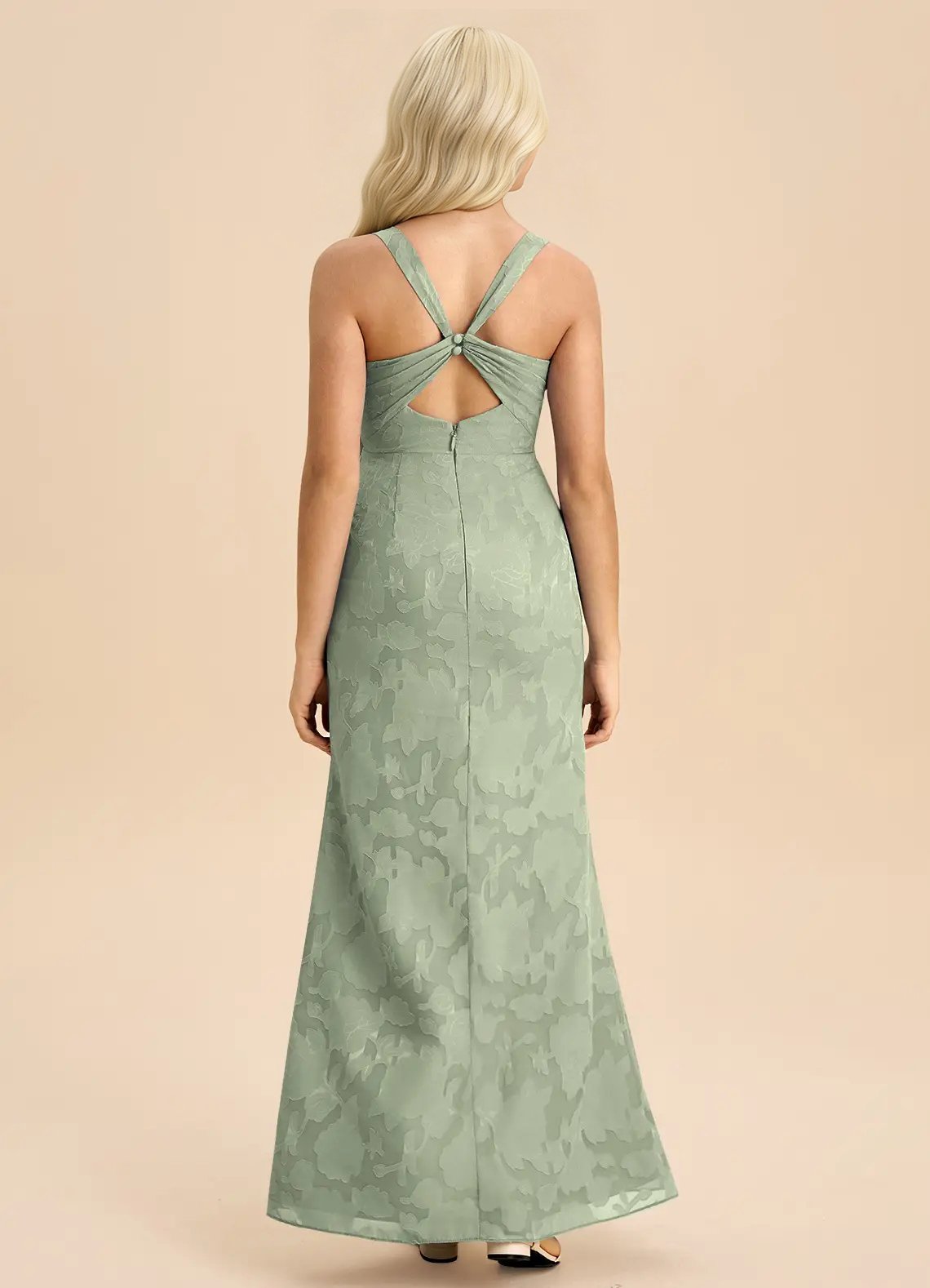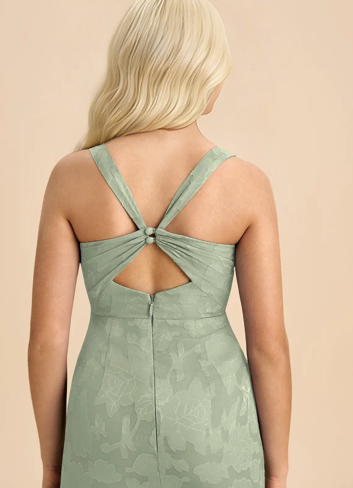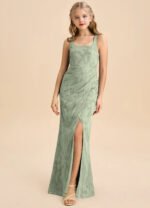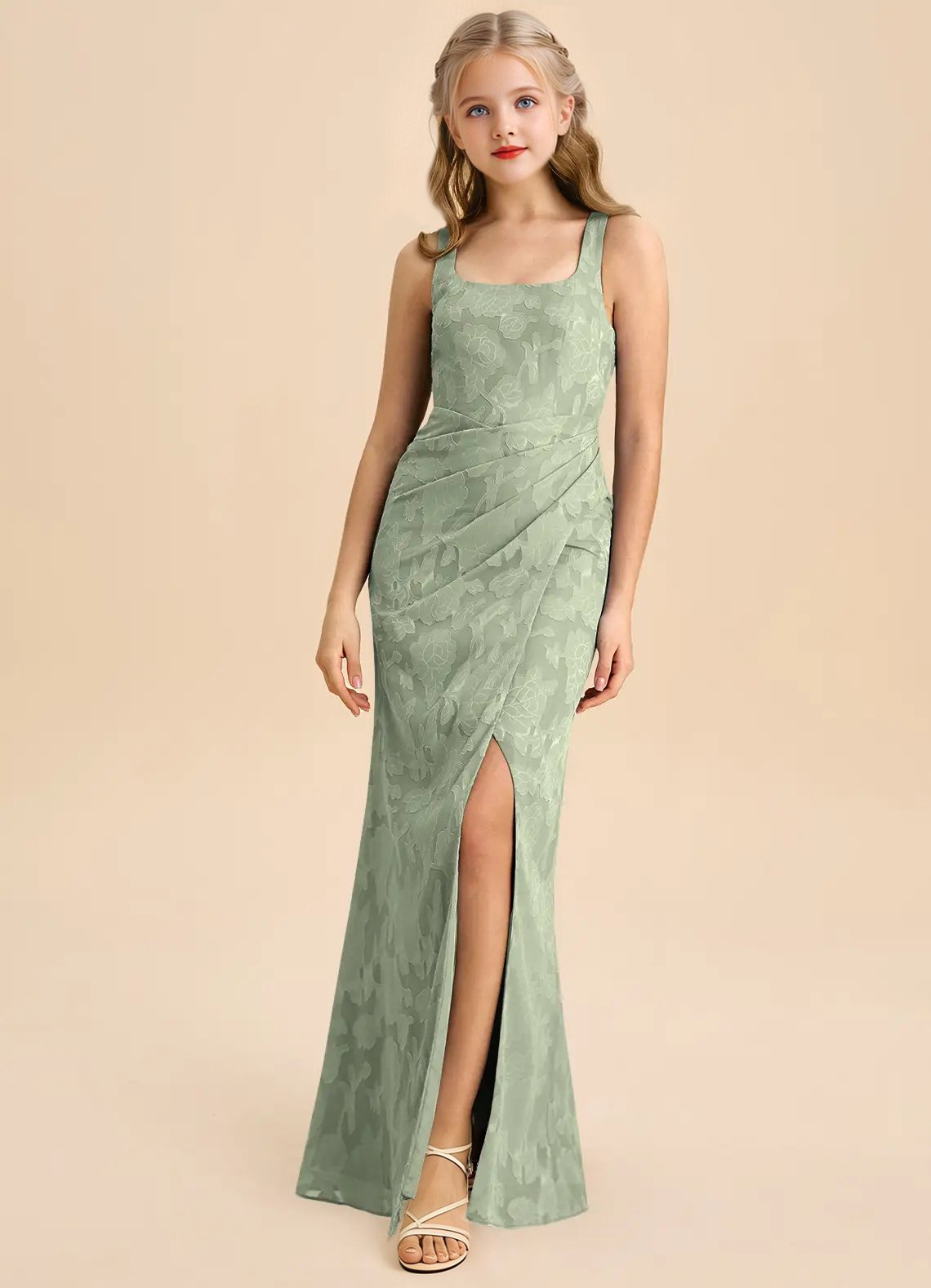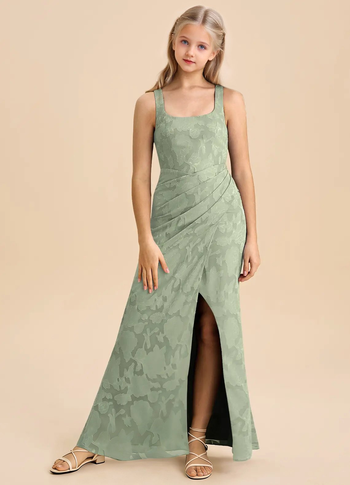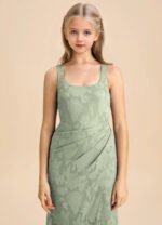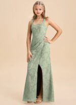 Mero is our stunning junior bridesmaid dress crafted from floral burnout fabric. She features a square neckline paired with straps leading to a keyhole back. The look is complete with a pleated floor length sheath skirt.
