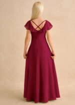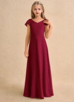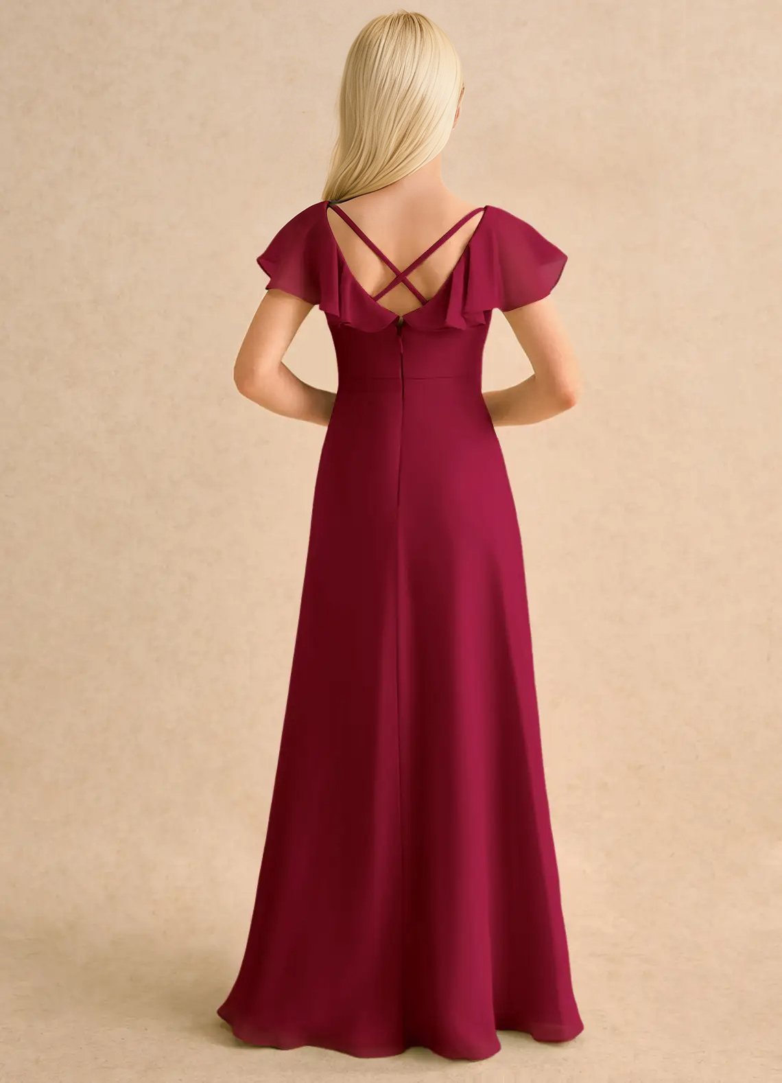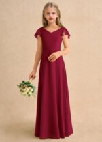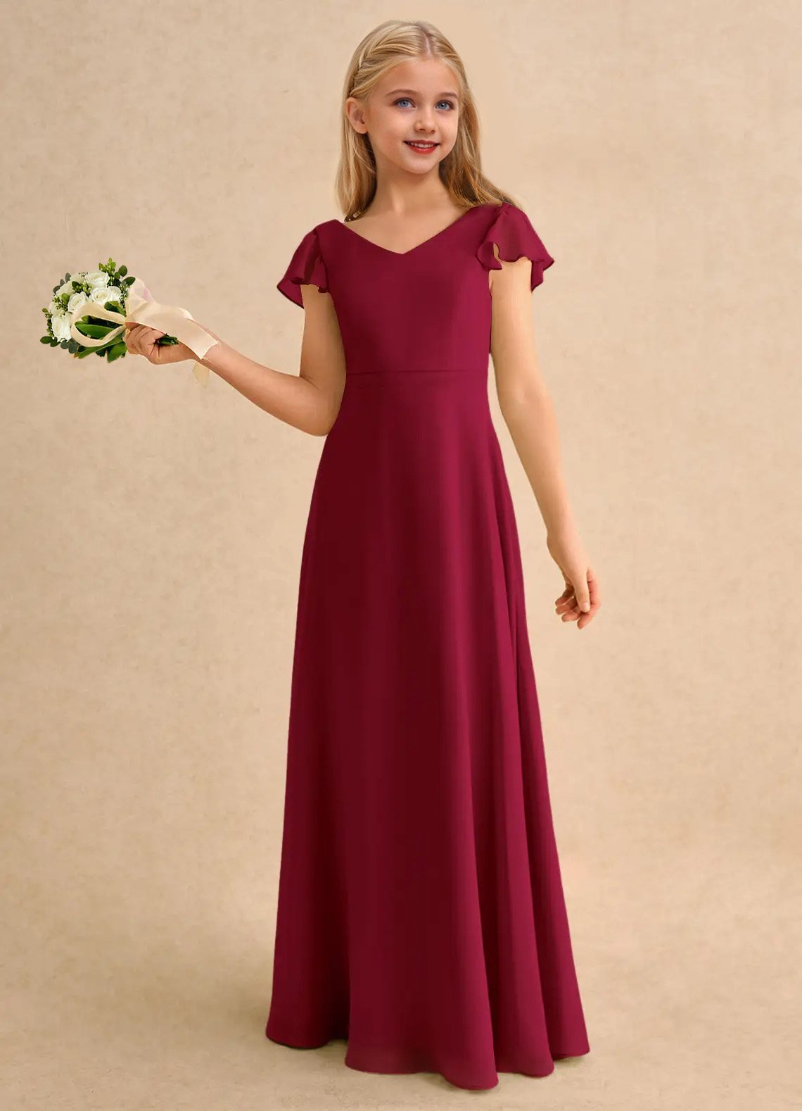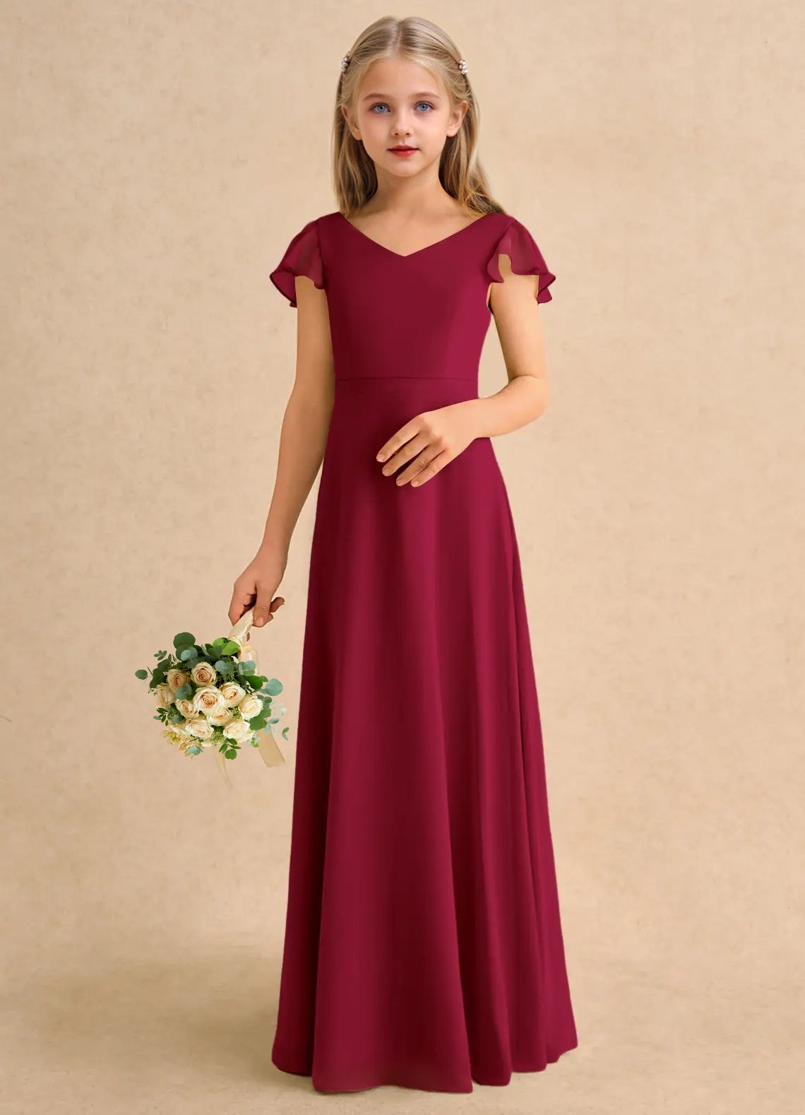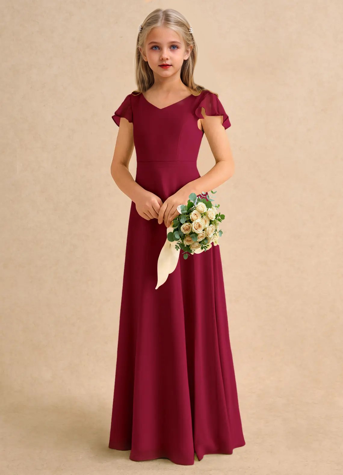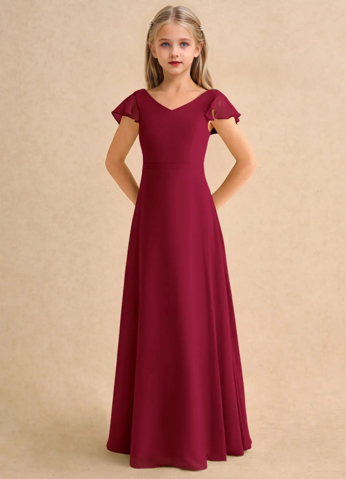 The Nari dress is a floor-length flower girl gown with a graceful A-line silhouette crafted from soft chiffon. It features a V-neckline, short flutter sleeves, and a V-back accented with delicate crisscross straps. The softly pleated skirt flows beautifully, creating effortless movement and a charming, elegant look for any special occasion.