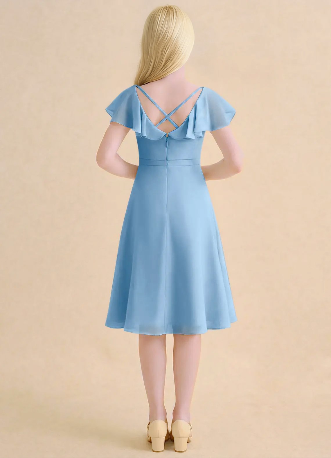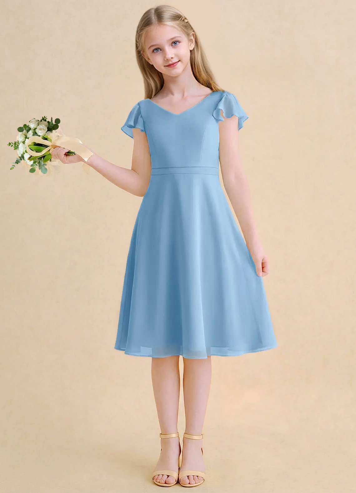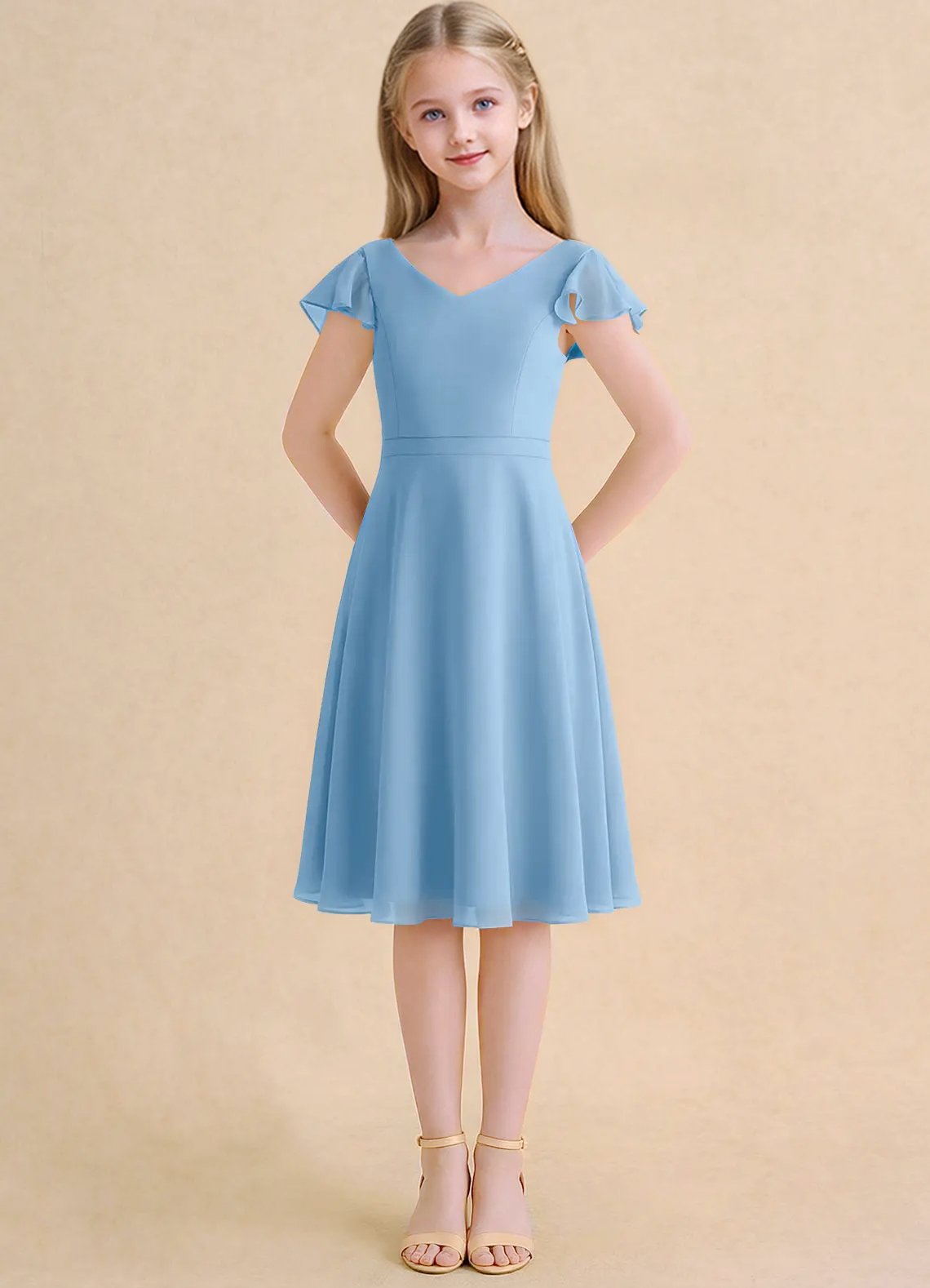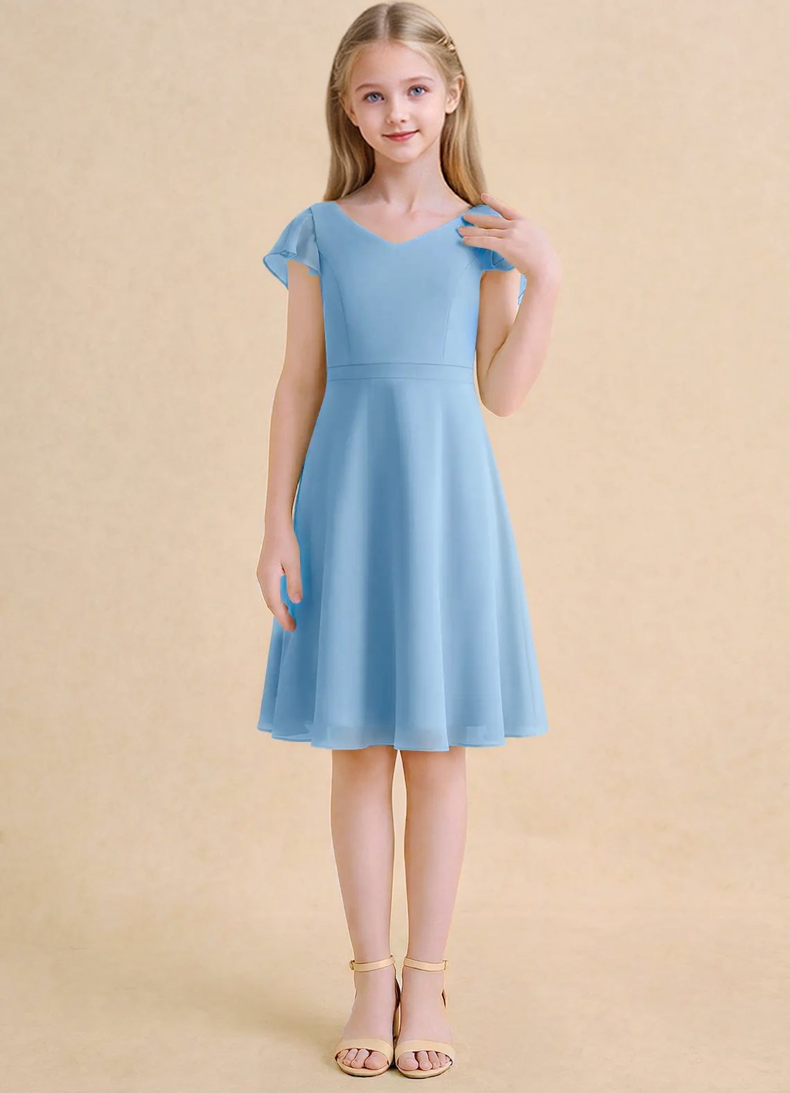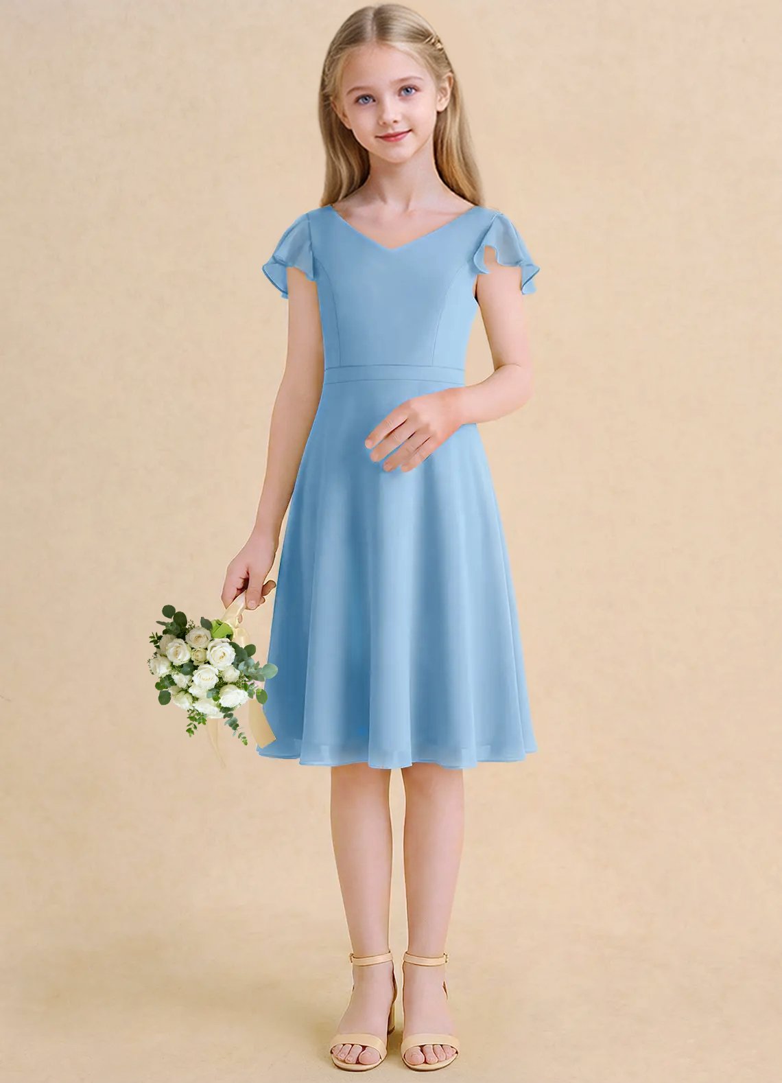 The Narin dress is a knee-length flower girl gown with a graceful A-line silhouette crafted from soft chiffon. It features a V-neckline, short flutter sleeves, and a V-back accented with delicate crisscross straps. The softly pleated skirt flows beautifully, creating effortless movement and a charming, elegant look for any special occasion.