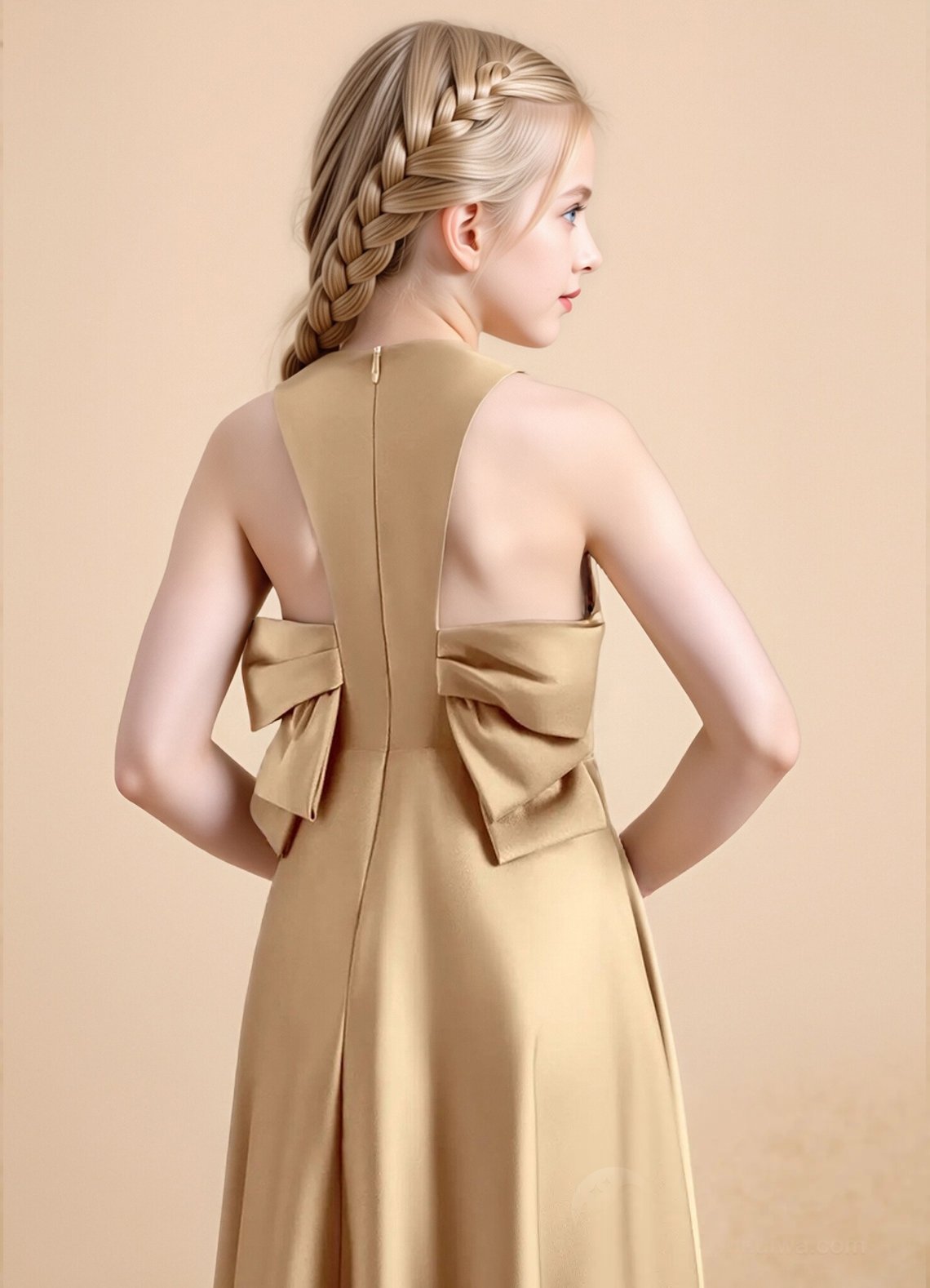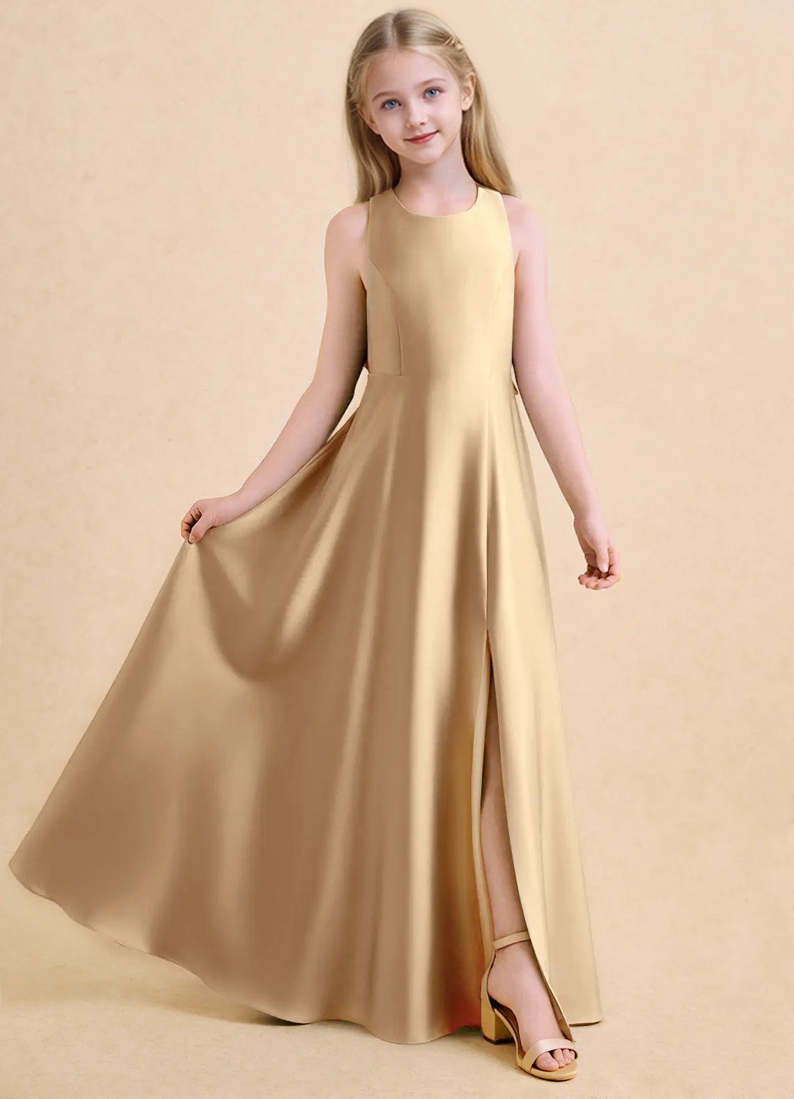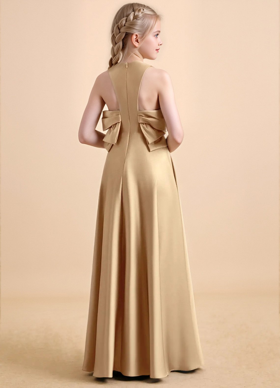 The floor-length Nisha girls’ formal dress features a graceful A-line silhouette in lustrous stretch satin with a sleek, polished finish. It has a round neckline with sleek sleeveless straps and a pair of oversized, structured bows at the back that frame a delicate racerback cutout detail. The skirt is finished with a subtle side slit for graceful movement and refined elegance.