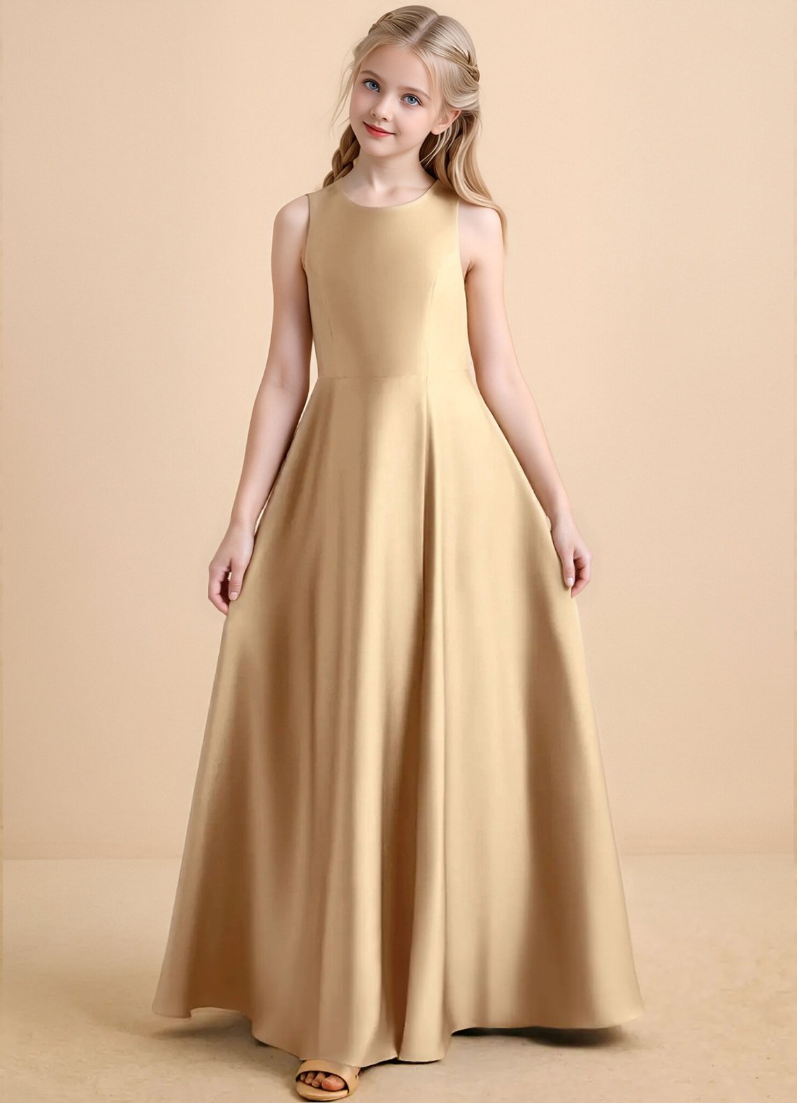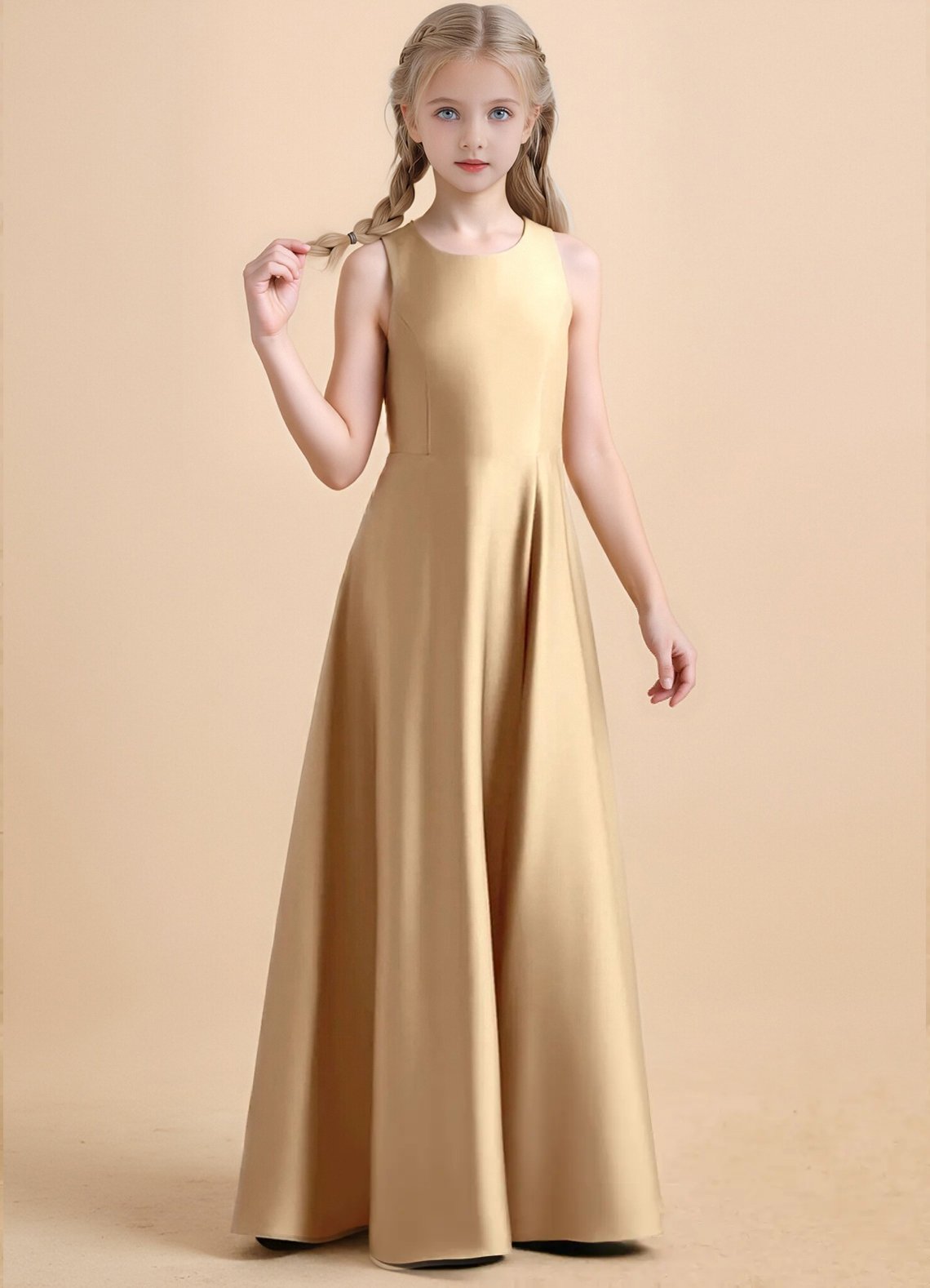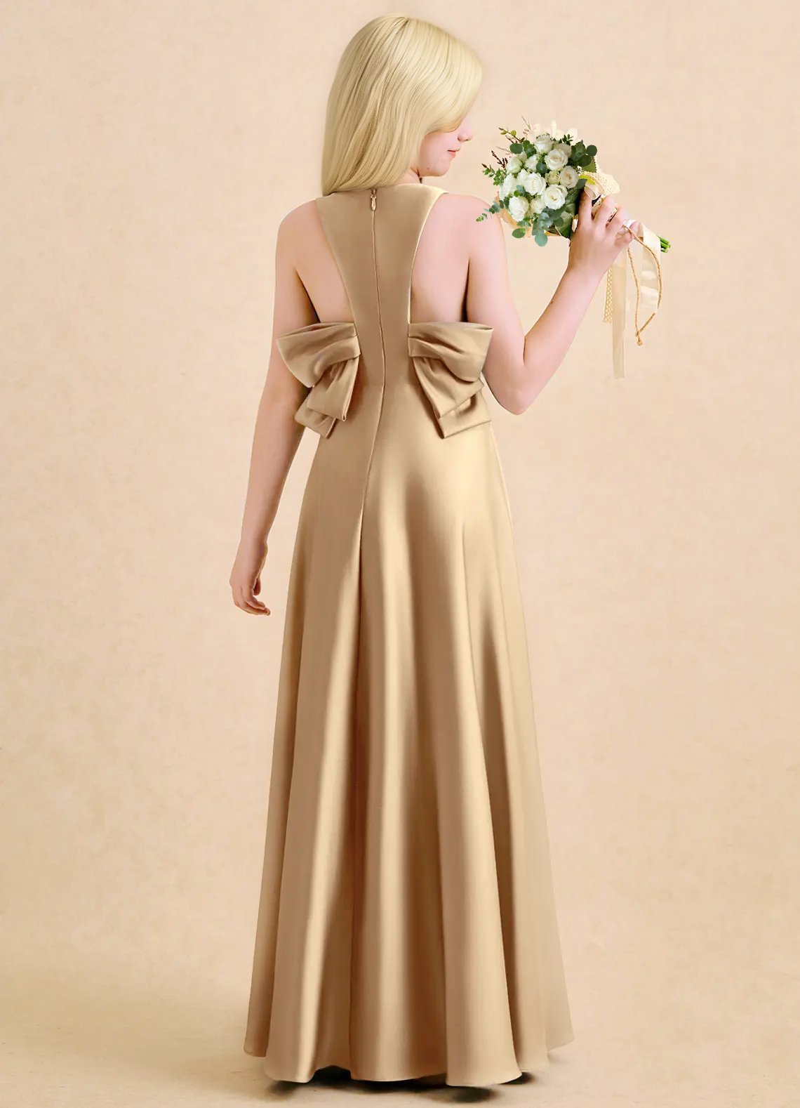 The floor-length Nisha girls’ formal dress features a graceful A-line silhouette in lustrous stretch satin with a sleek, polished finish. It has a round neckline with sleek sleeveless straps and a pair of oversized, structured bows at the back that frame a delicate racerback cutout detail. The skirt is finished with a subtle side slit for graceful movement and refined elegance.