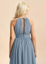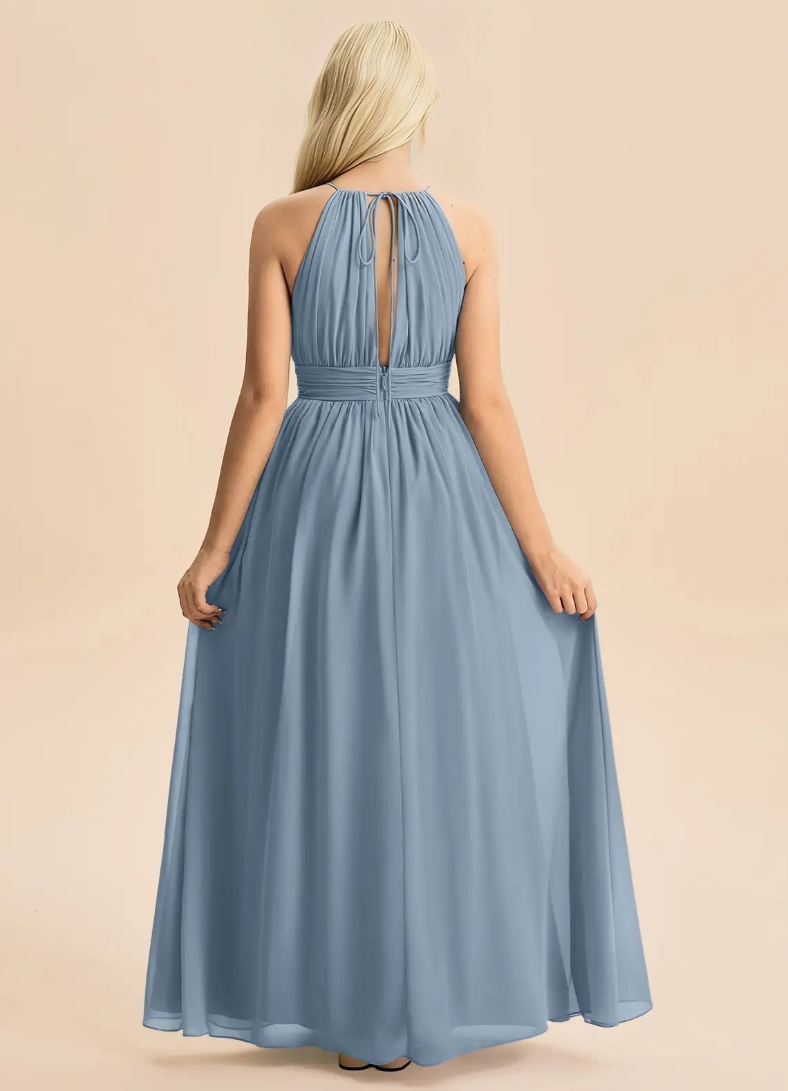 Introducing our JBD Noelle! This gown draws inspiration from our best-selling Ginger and Ginger Allure styles. Crafted from chiffon, it features a floor-length A-line silhouette. Key details include a crisscross pleated halter neckline, a decorative bow tie at the back of the neck, and a keyhole cutout with ruching details on the bodice. With the JBD Noelle, you can dance the night away with absolute freedom!