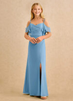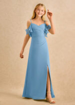 Pippy is a floor-length flower girl dress crafted from airy chiffon, featuring an A-line silhouette with a pleated sweetheart neckline, delicate spaghetti straps, and off-shoulder flutter sleeves. The skirt falls with soft pleats through the hips, creating graceful movement for a romantic, elegant look.
