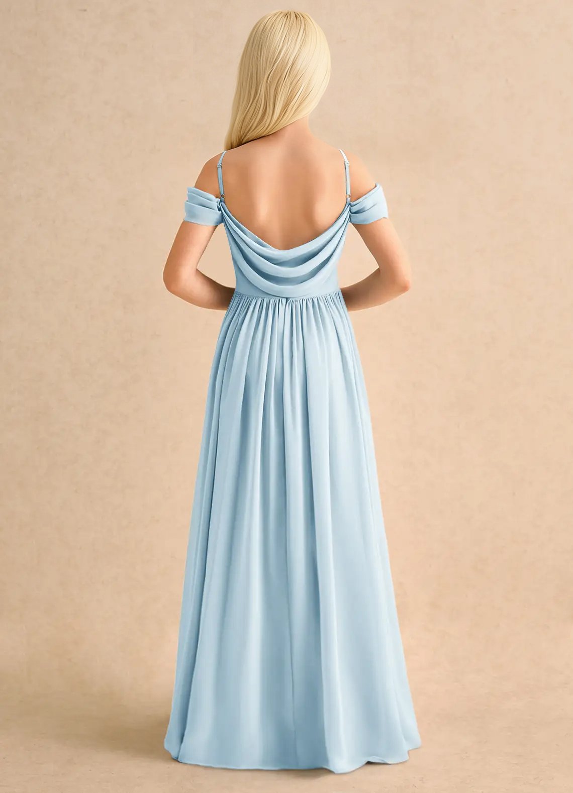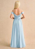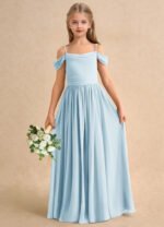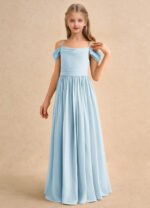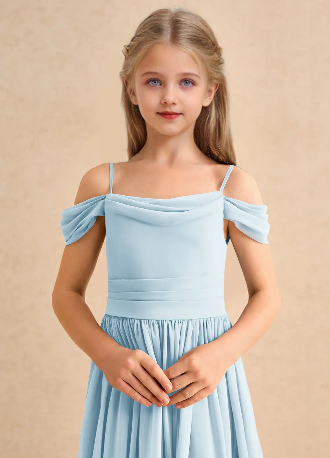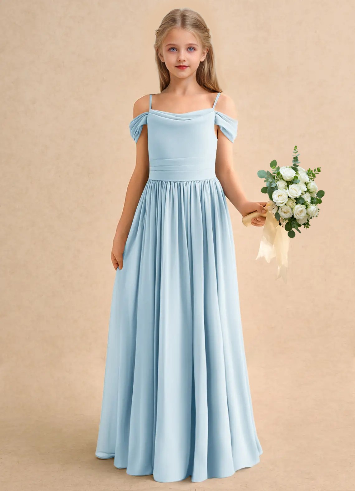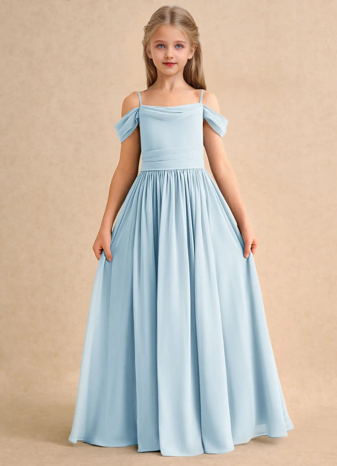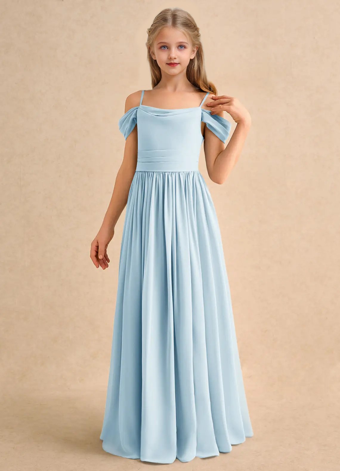 The Shia dress is a floor-length flower girl gown with a graceful A-line silhouette crafted from soft chiffon. It features a cowl off-the-shoulder neckline with spaghetti straps, a deep cowl back, and a pleated waistline that flows seamlessly into a pleated skirt. Elegant and effortlessly flowing, Shia is perfect for creating a dreamy, timeless look.