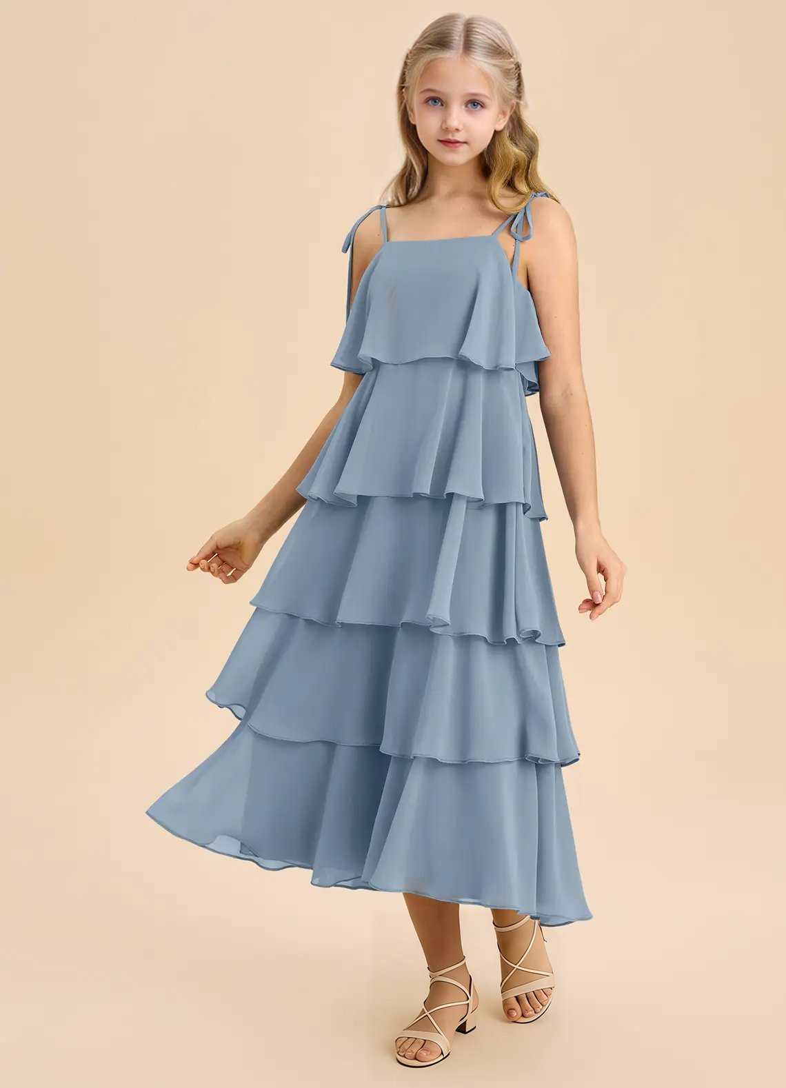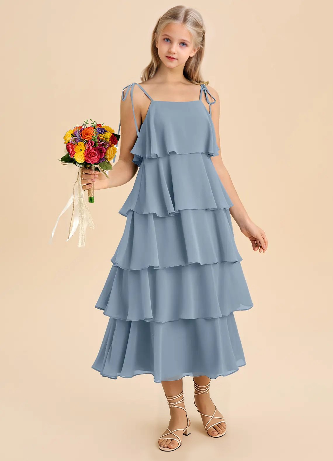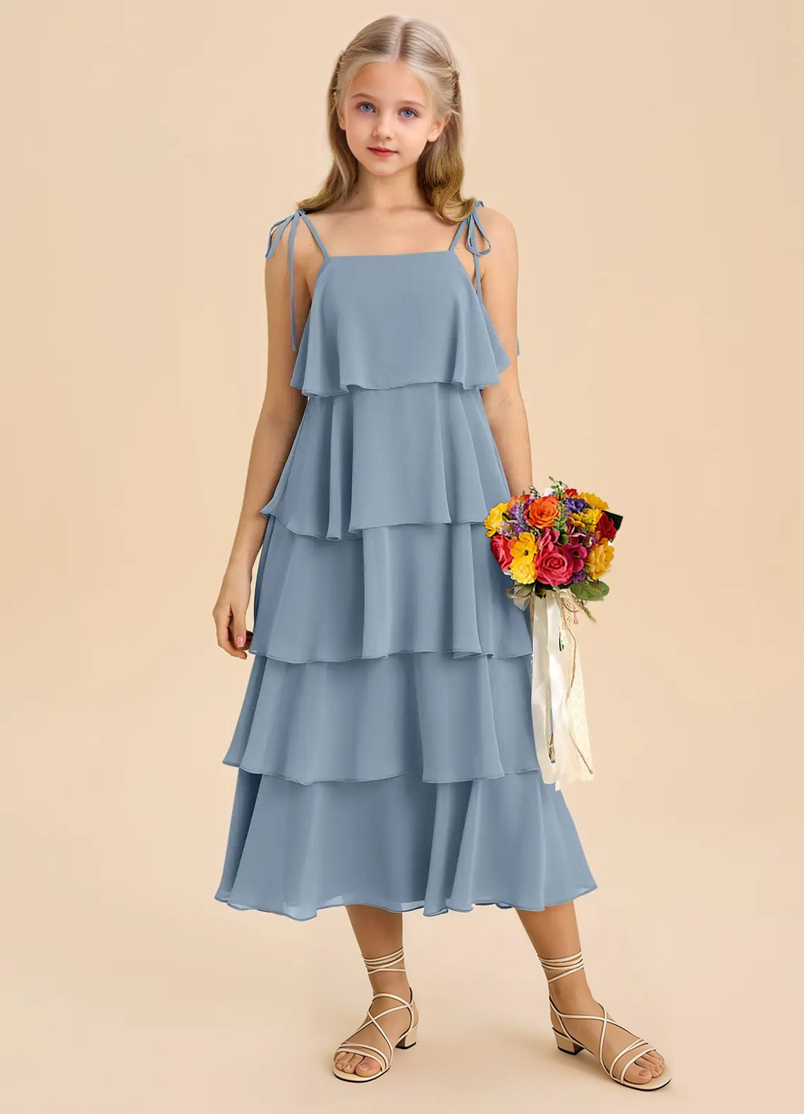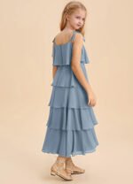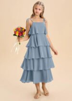 Sweet and effortlessly elegant, the Shortcake junior bridesmaids dress features an airy tea-length A-line silhouette crafted from soft chiffon. Designed with a straight neckline, spaghetti straps adorned with dainty self-tie bows, a scoop back, and five tiers of cascading ruffles, it’s perfect for twirling down the aisle in style.
