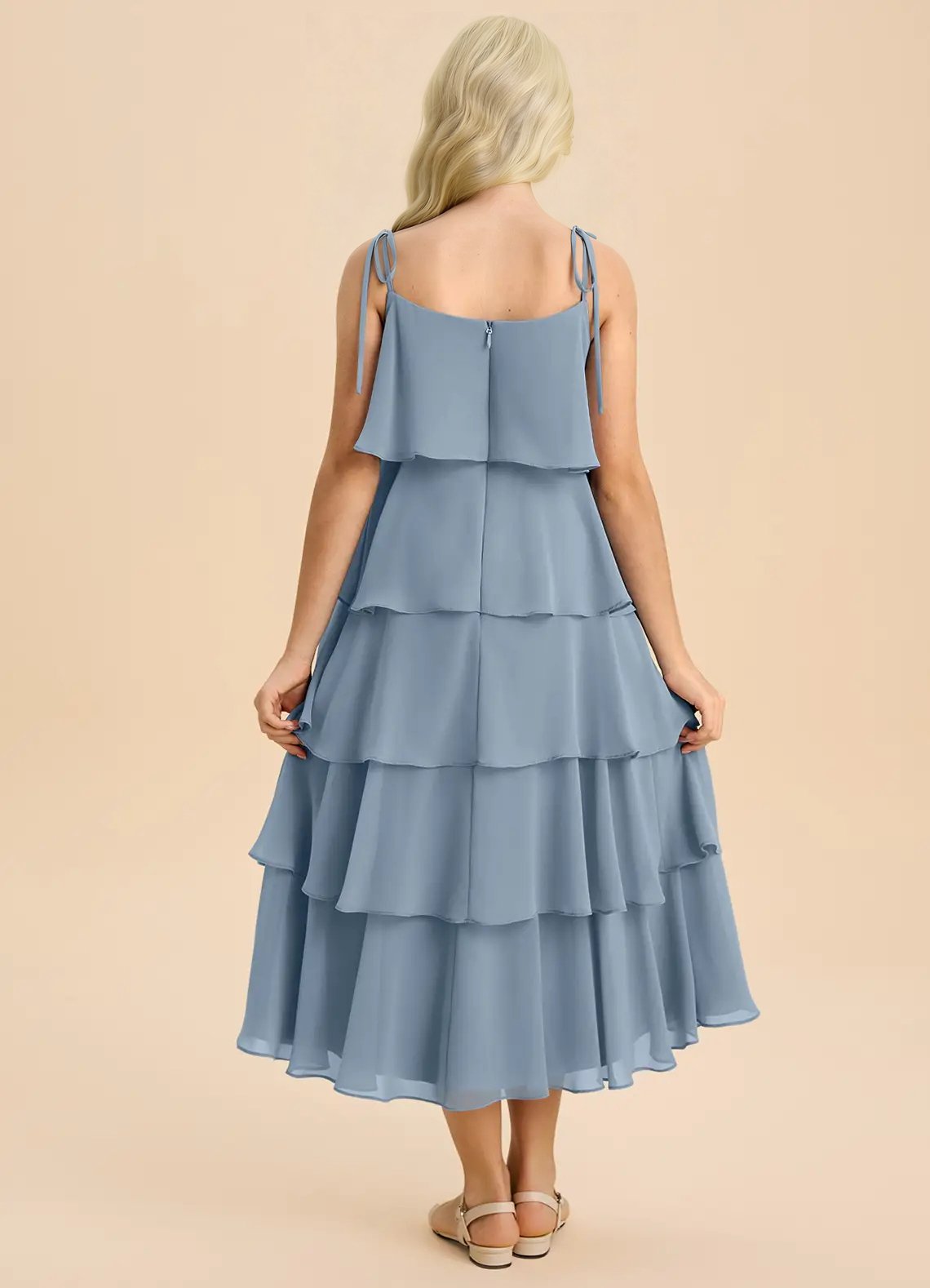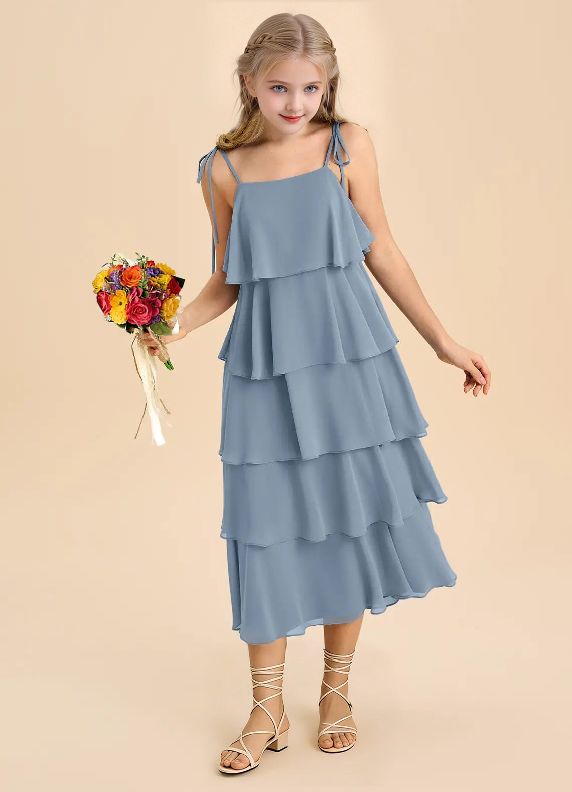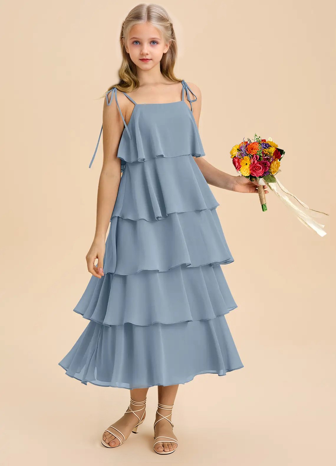Sweet and effortlessly elegant, the Shortcake junior bridesmaids dress features an airy tea-length A-line silhouette crafted from soft chiffon. Designed with a straight neckline, spaghetti straps adorned with dainty self-tie bows, a scoop back, and five tiers of cascading ruffles, it’s perfect for twirling down the aisle in style.