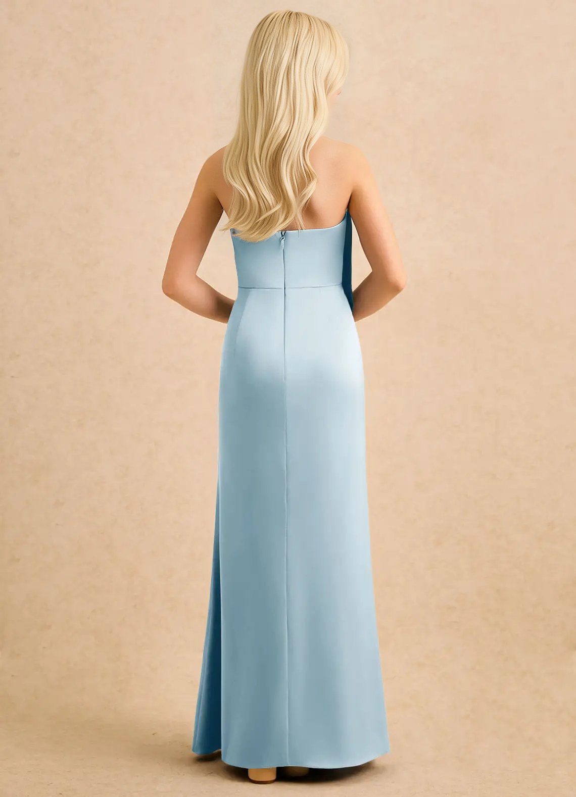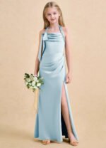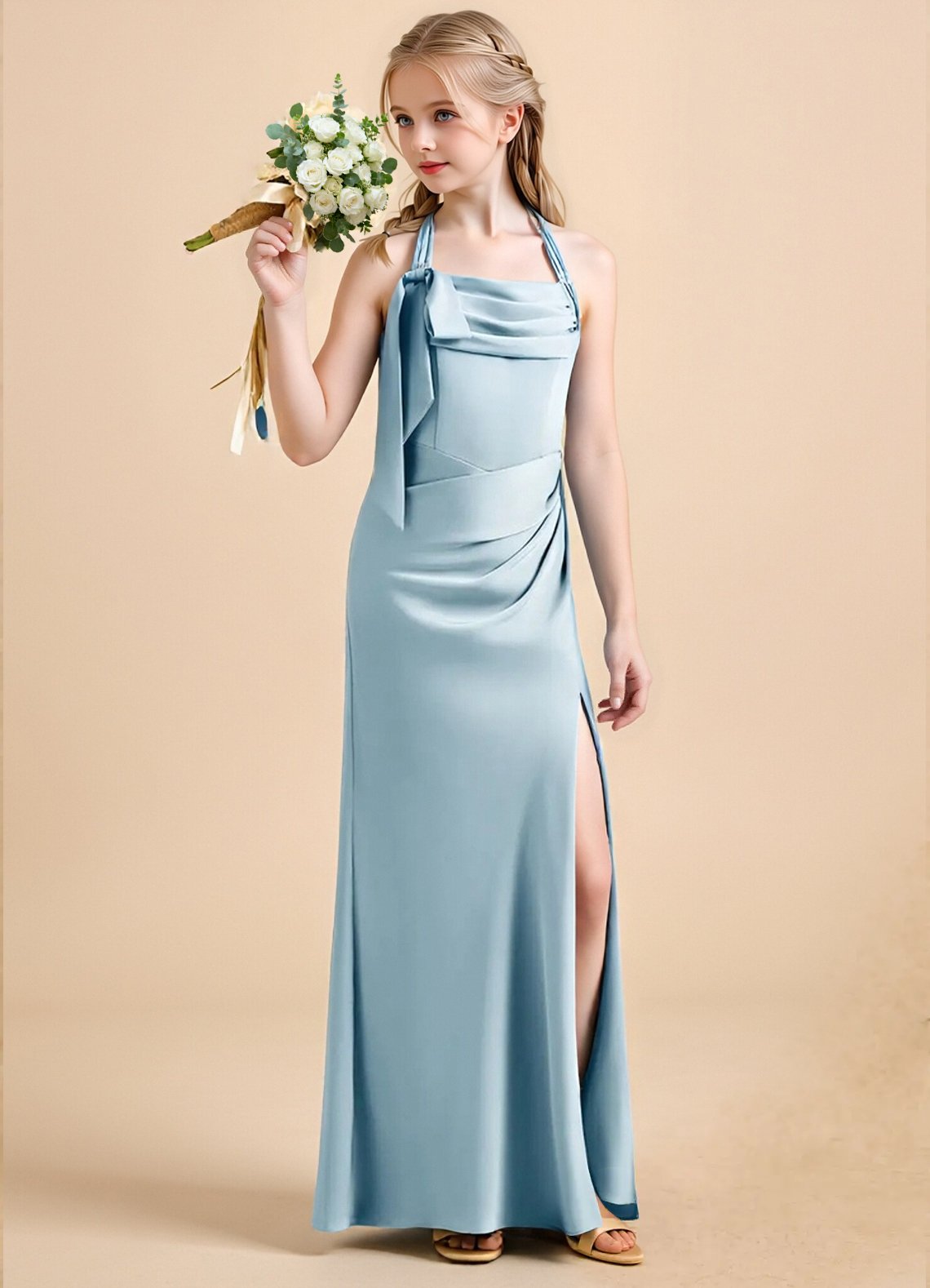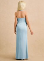 The floor-length snow is crafted from stretch satin with a soft. Designed with a draped cowl neckline and elegant halter straps, the bodice features delicate pleating that enhances its structured yet romantic look. The gently gathered waist flows into a sleek skirt with a subtle side slit, adding movement and a modern touch of sophistication.