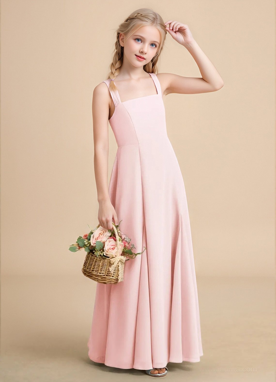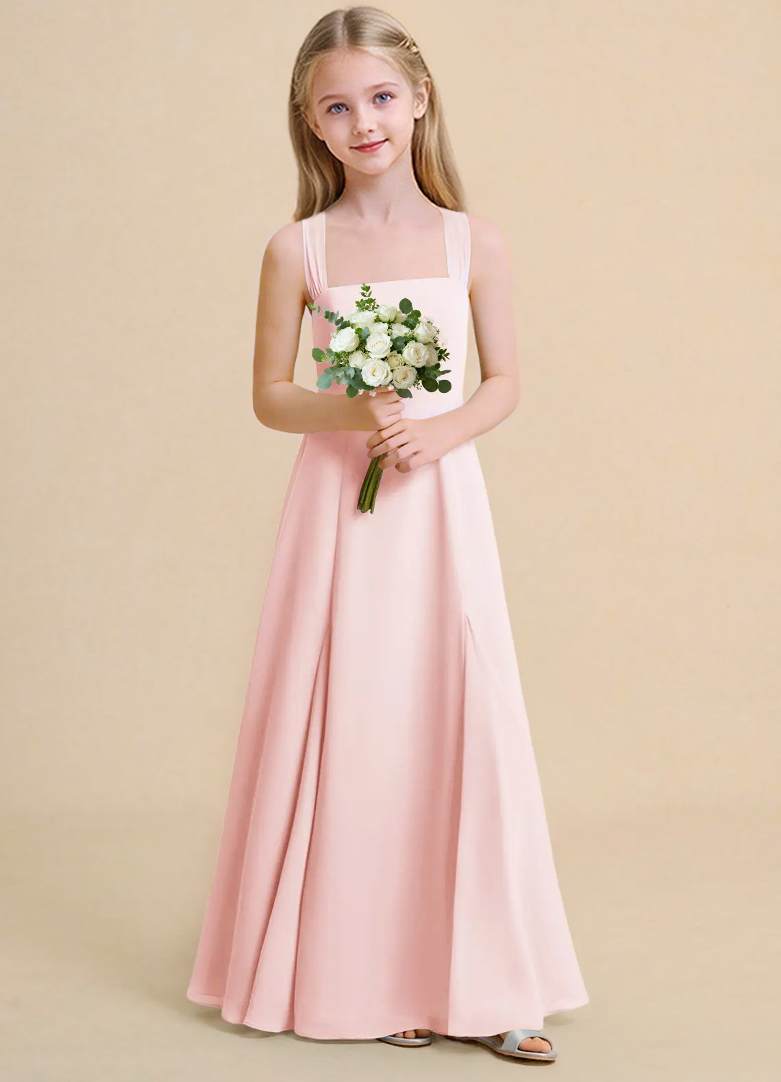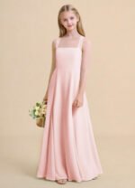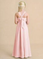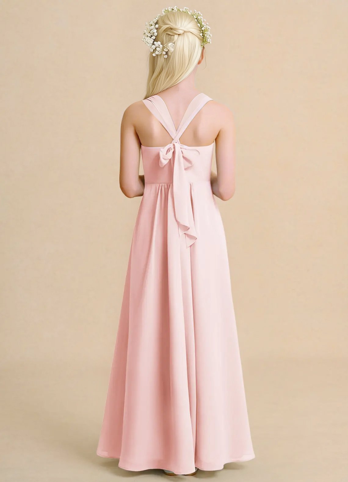The Tater flower girl dress delights with its airy chiffon A-line silhouette and floor-length grace. Featuring a sleeveless halter neckline with cross-back straps that tie into a sweet bow, the softly pleated skirt adds effortless movement and charm.