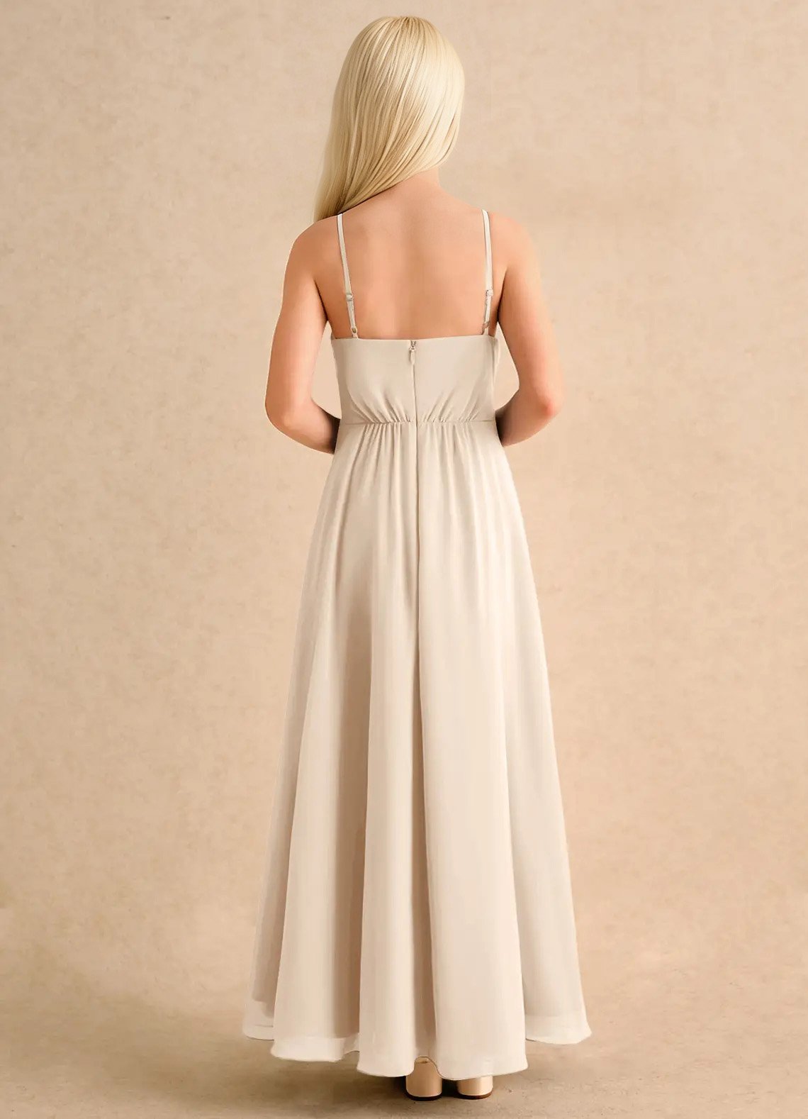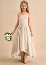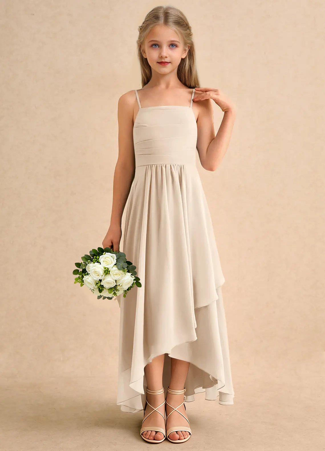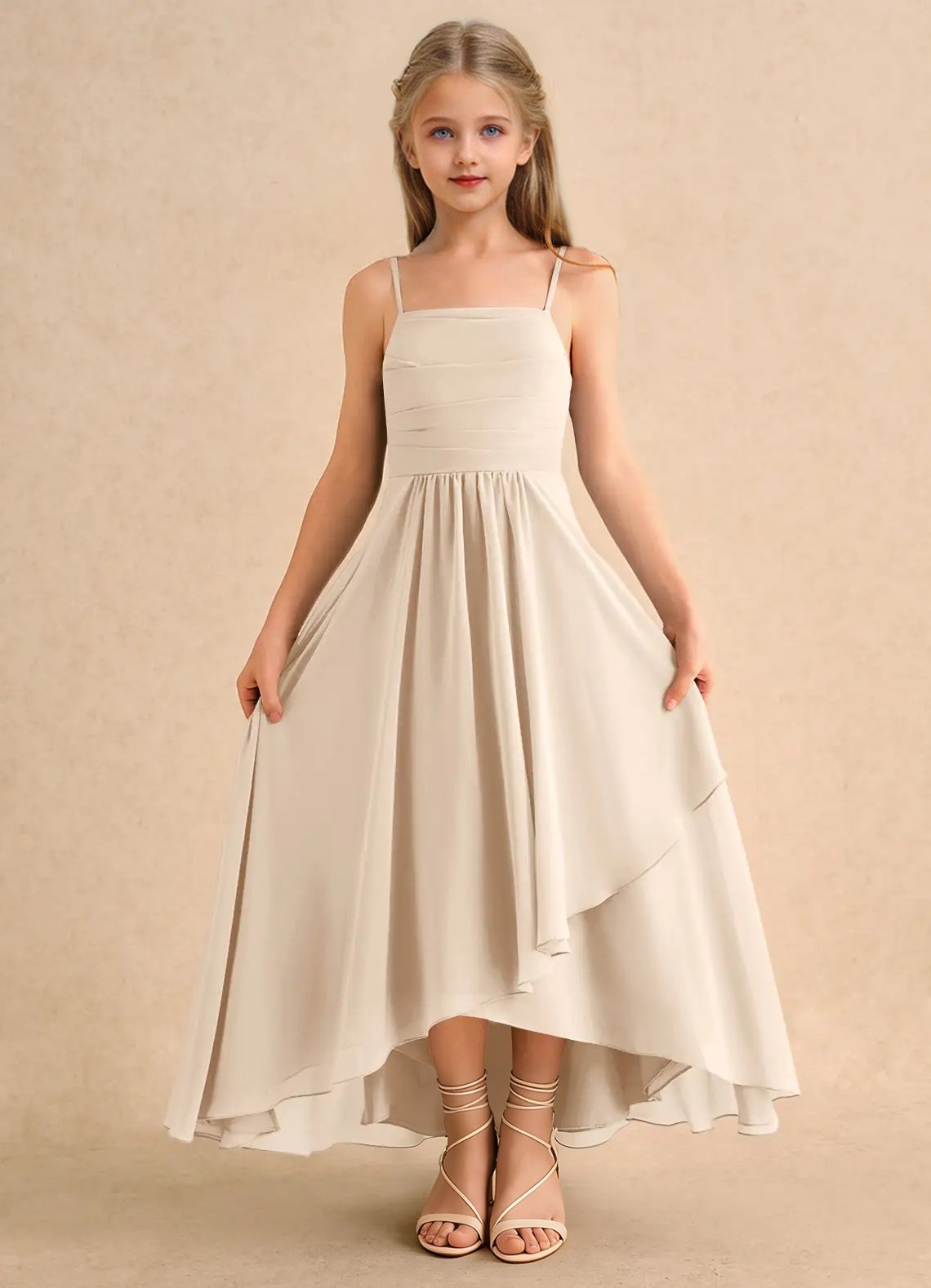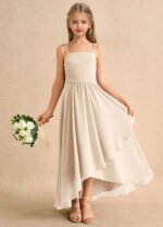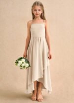 Twilight Dance is a light and graceful dress designed for timeless charm. Featuring a softly pleated bodice with delicate spaghetti straps, this style flows into a layered A-line skirt with gentle movement and an airy finish. The high-low hem adds a touch of modern elegance.