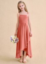 Mai is a charming junior bridesmaid dress featuring a soft cowl neckline, adjustable straps, and a sweet bow at the back. With gentle pleats and a smooth satin finish, it’s perfect for twirling through any special day in style.