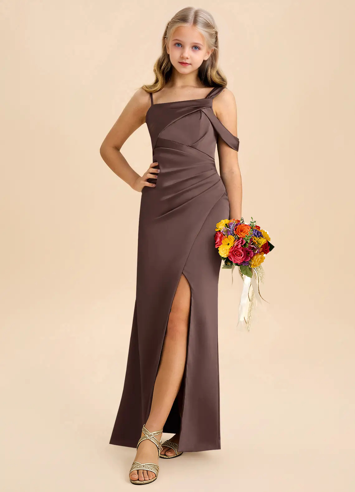 The Wynter junior bridesmaid dress is a one-shoulder design with double straps, side pleating, and a leg slit. This beautiful stretch satin sheath exudes effortless elegance.