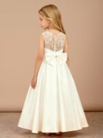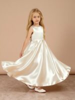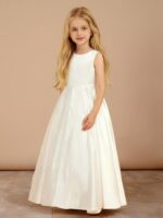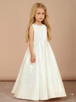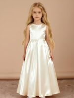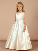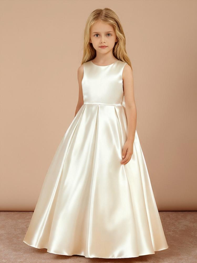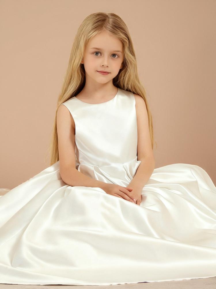 - This elegant Off-the-Shoulder Long Flower Girl Dress is made from luxurious satin and features a flattering A-line silhouette with a sweep/brush train. The sleeveless design showcases a lovely bow at the waist and secures with a back zipper, making it perfect for weddings and special occasions.