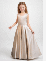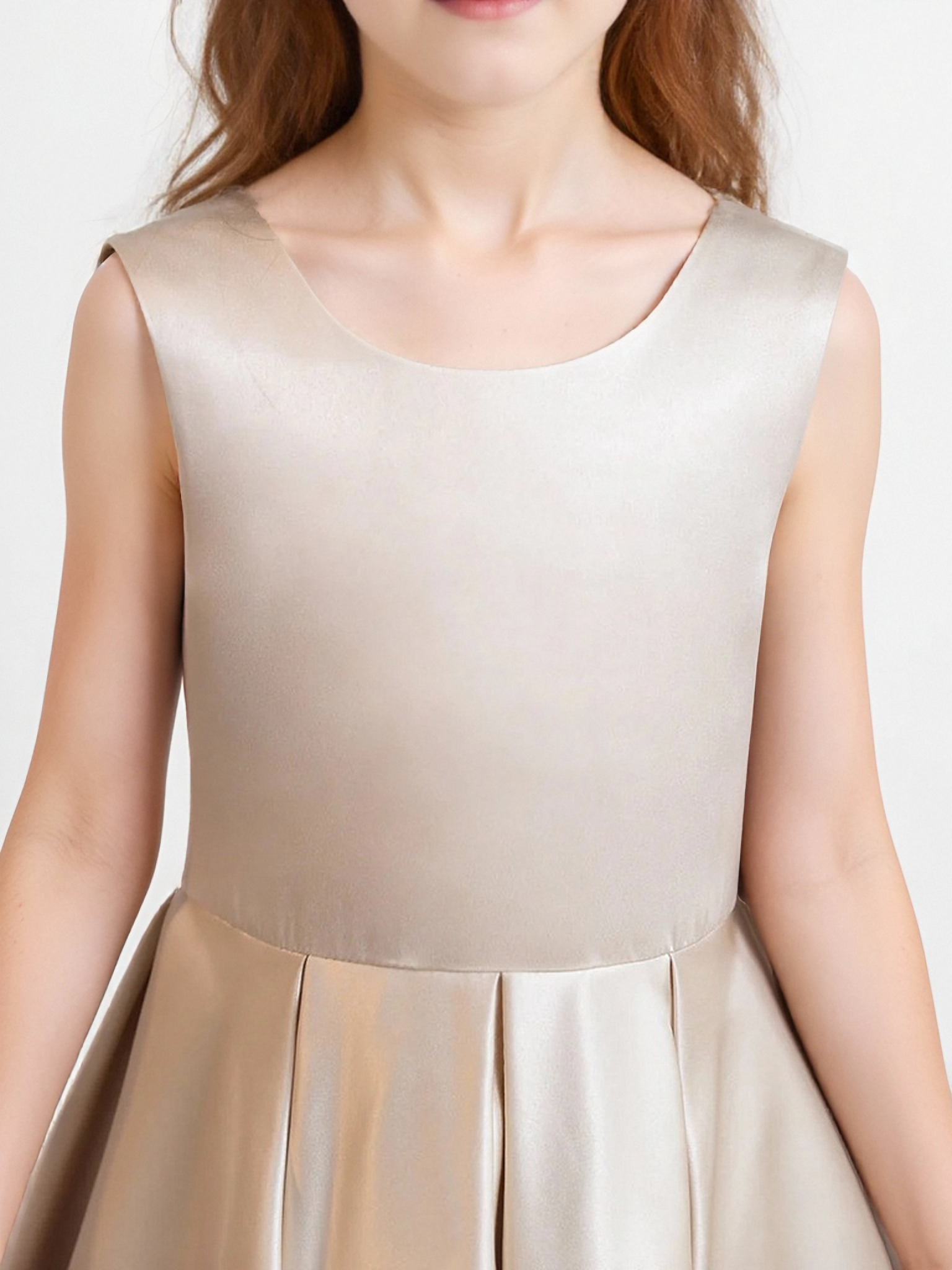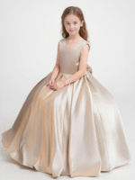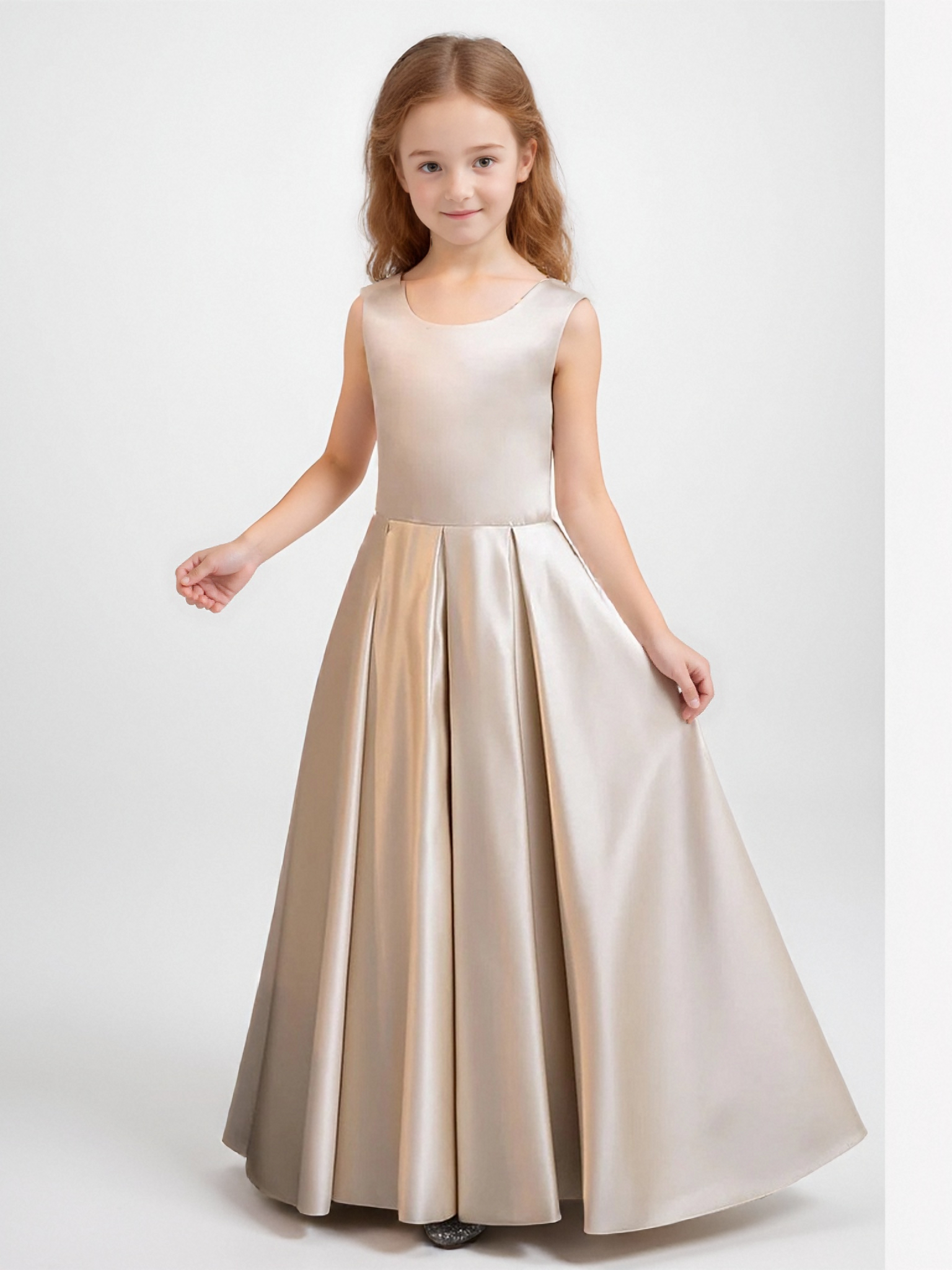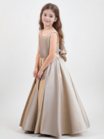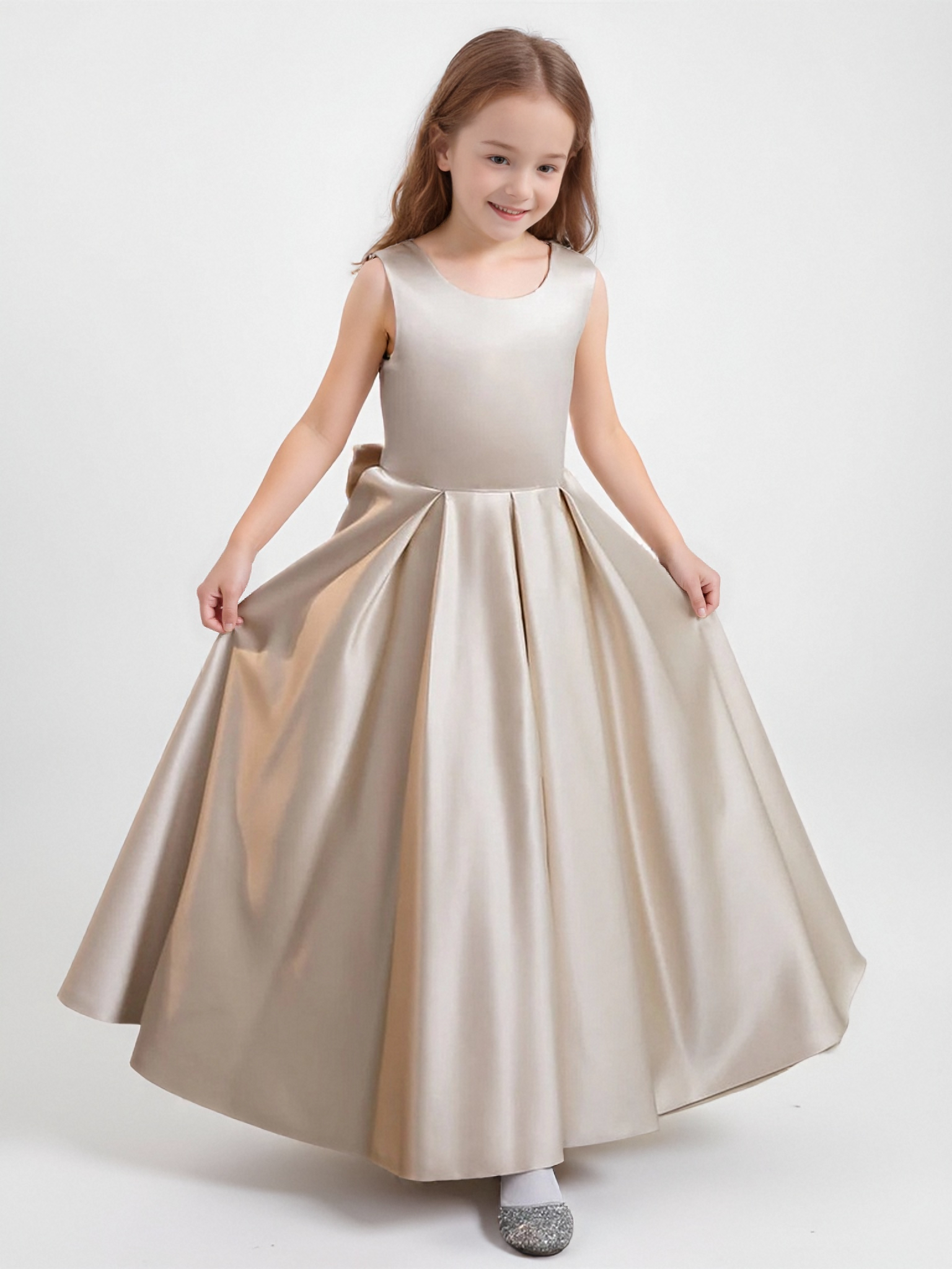 This elegant flower girl dress is made from high-quality satin with a smooth, glossy finish. The fabric feels soft and comfortable while giving a beautiful, flowing shape.