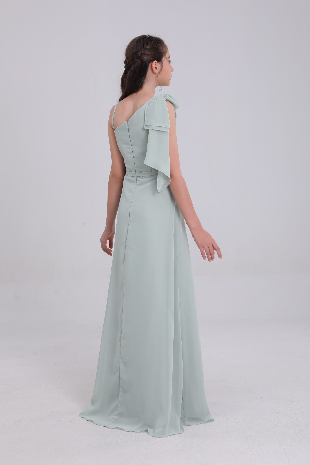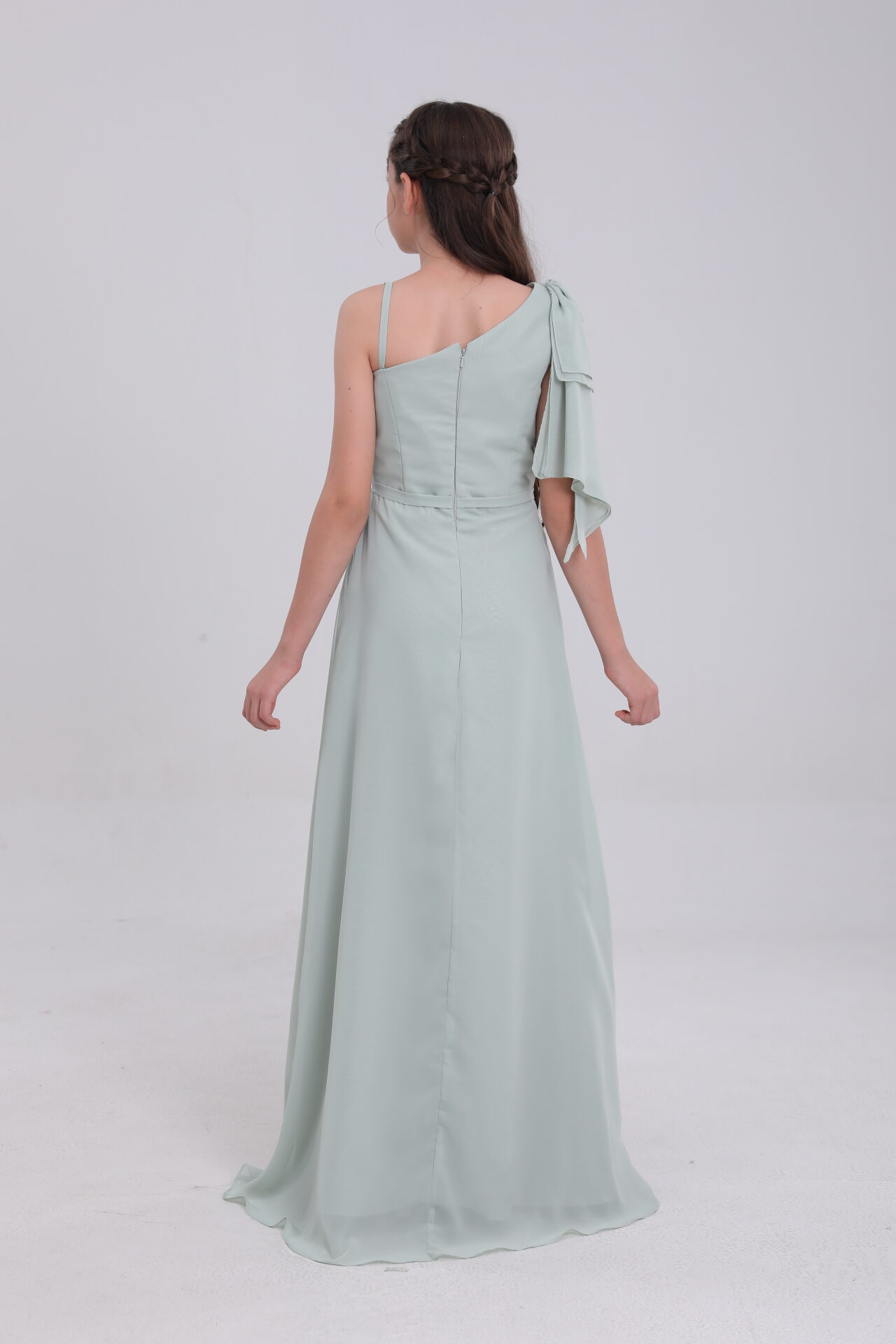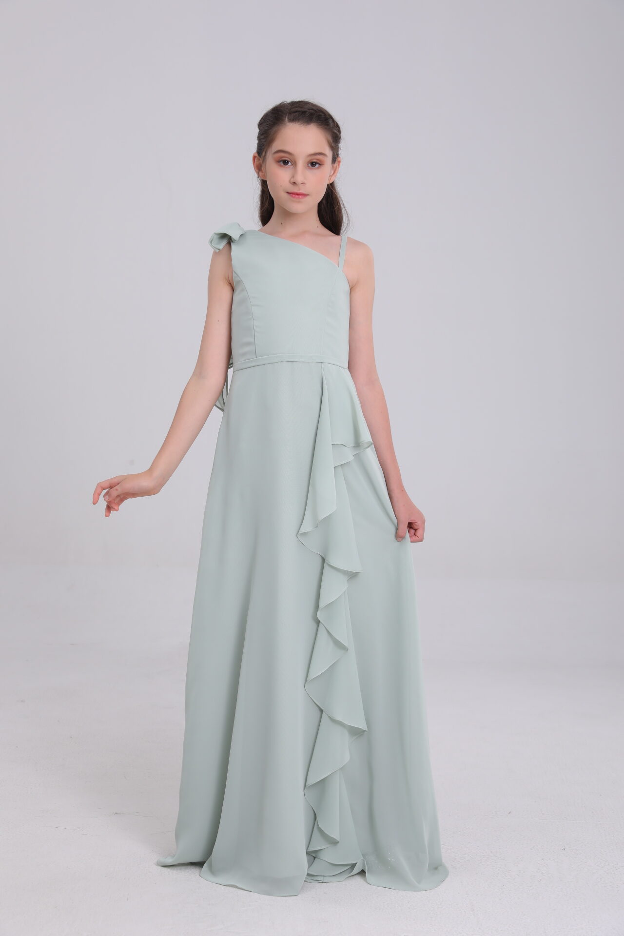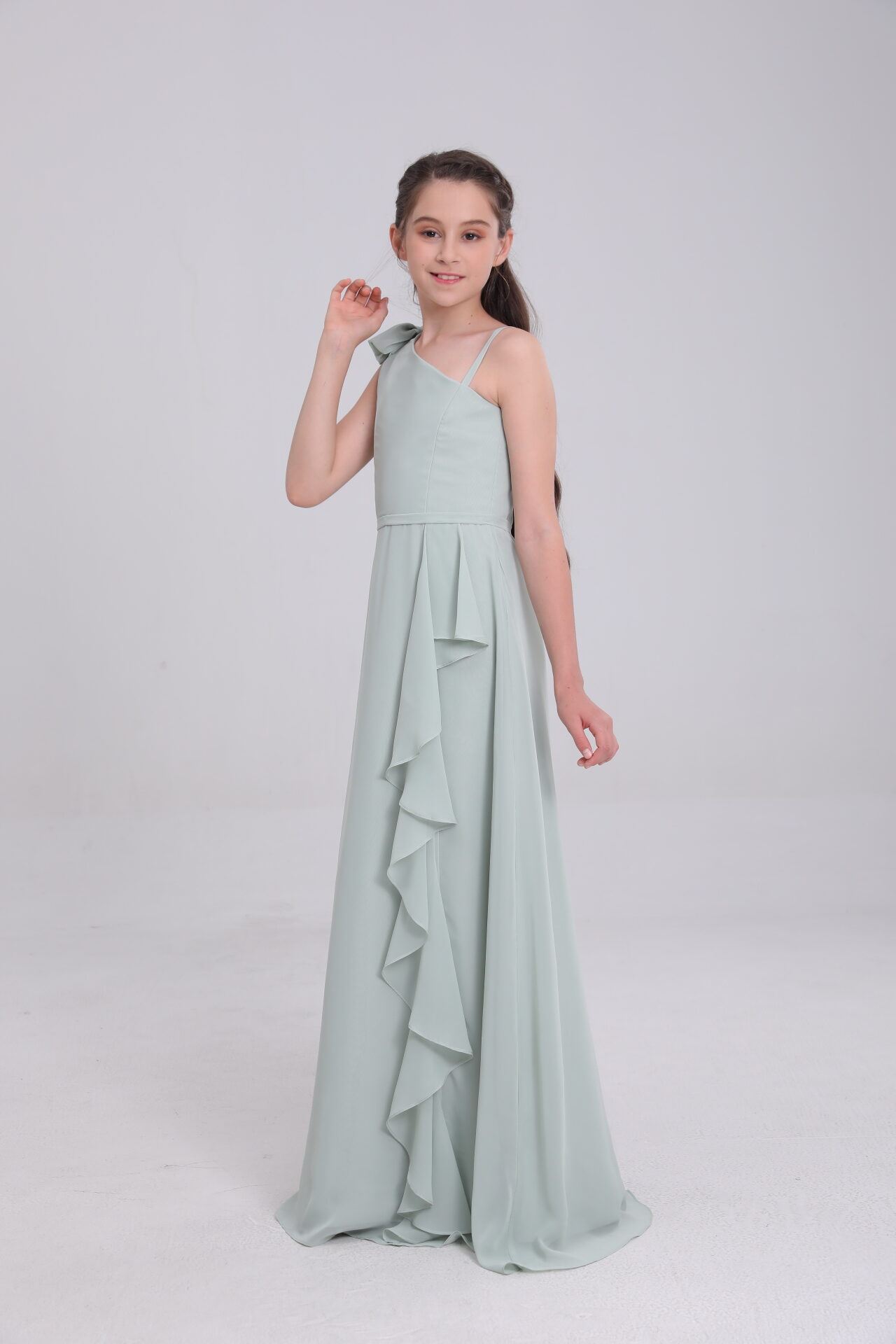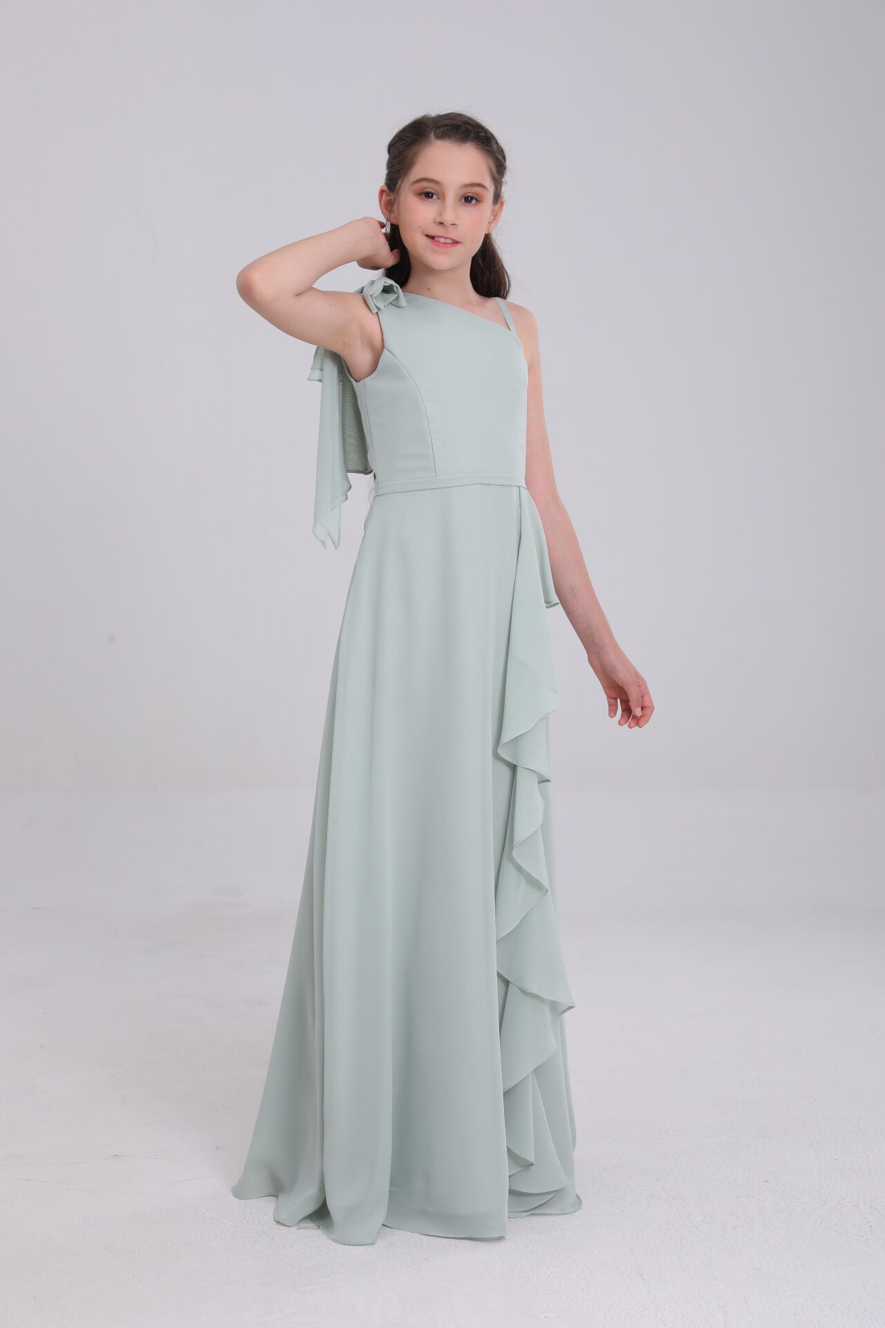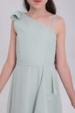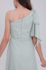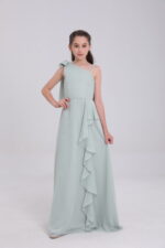 Sage green satin gown: asymmetric, ruffled, mixes whimsy & grace for occasions.