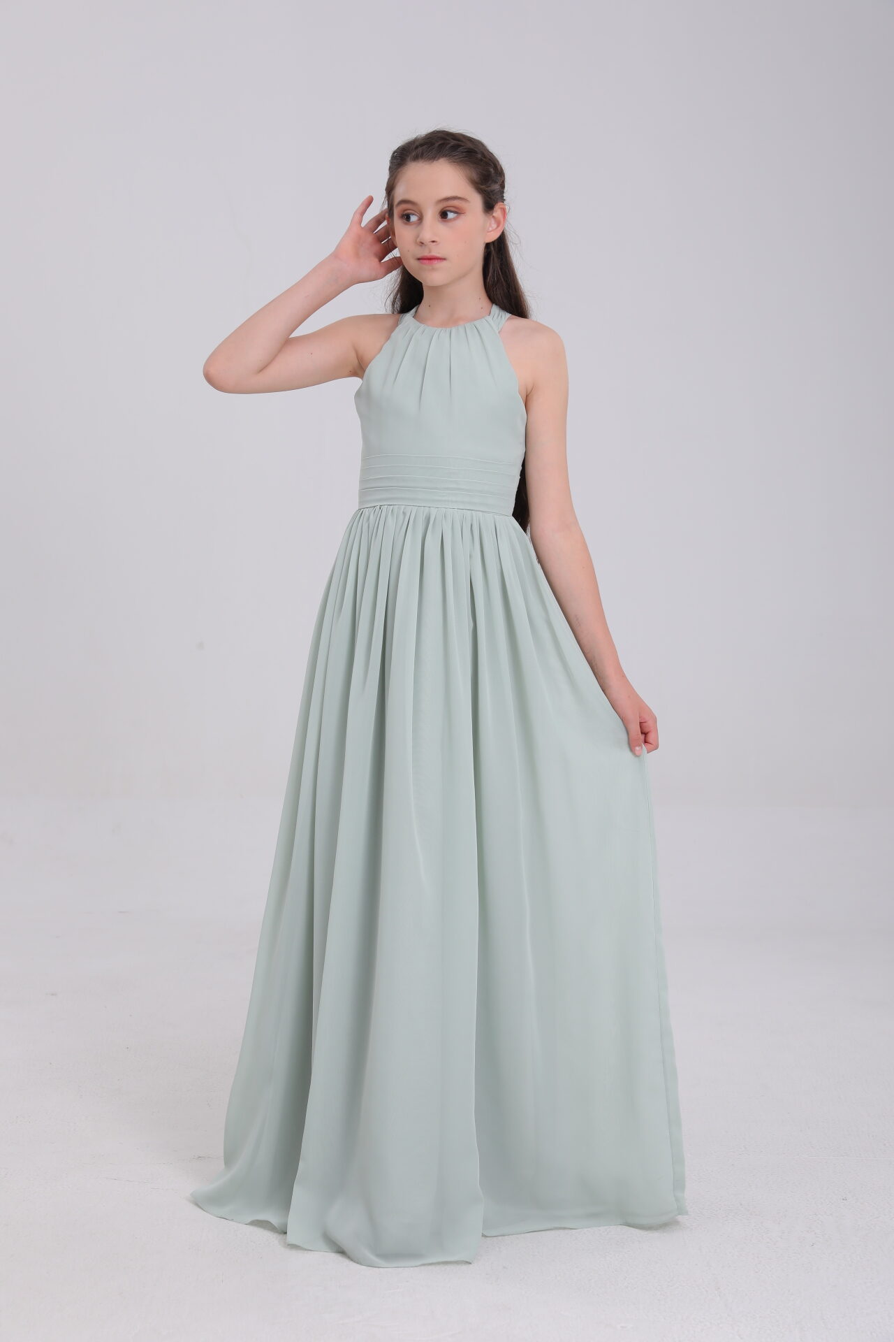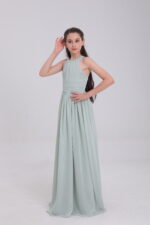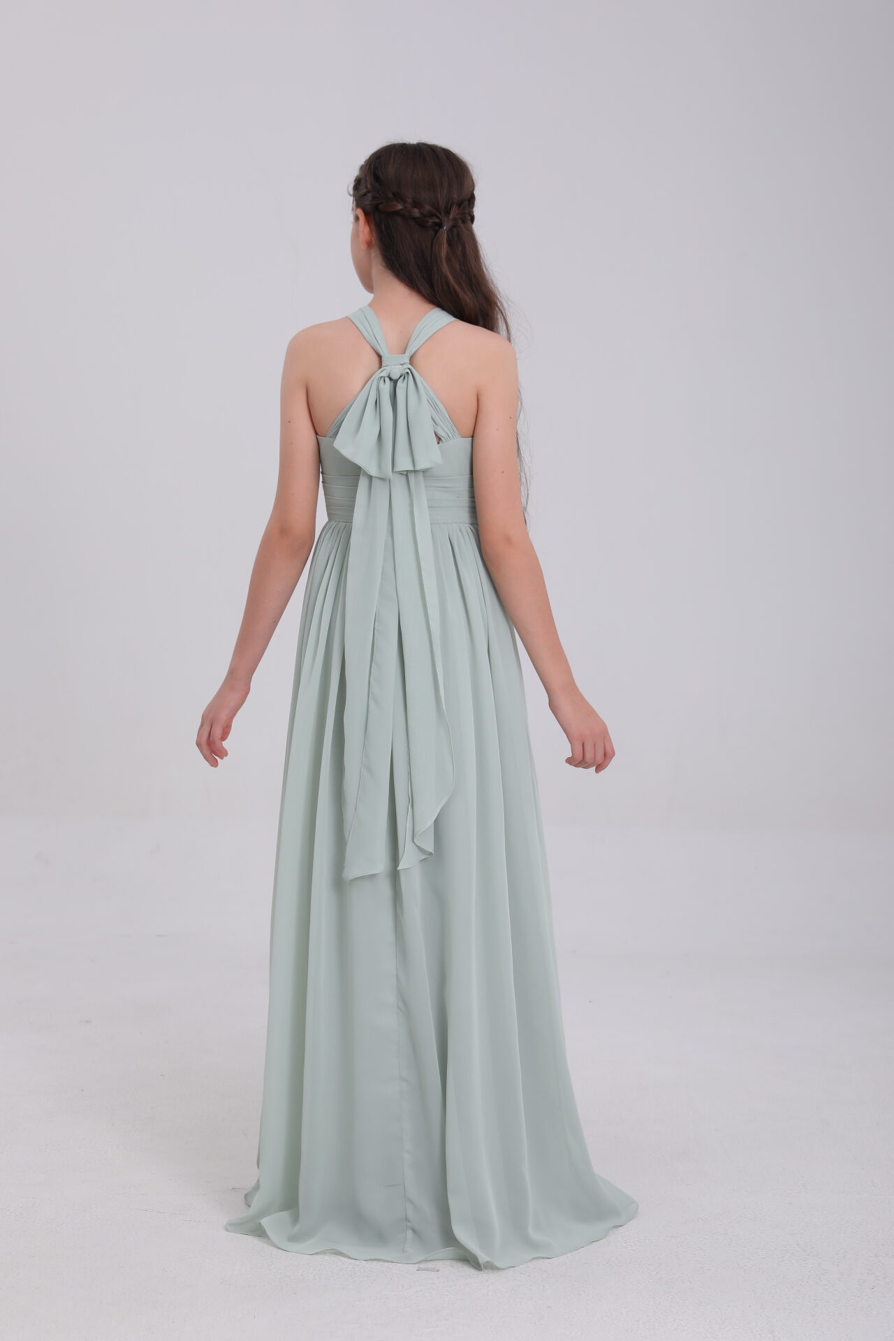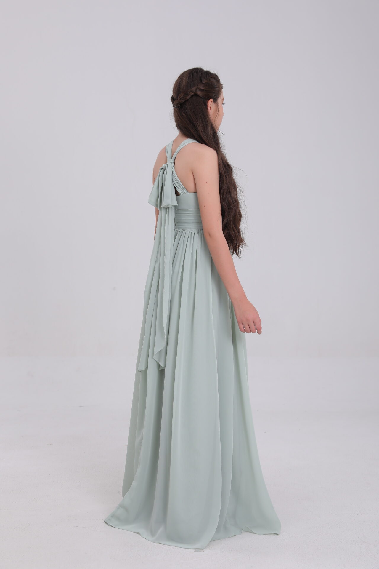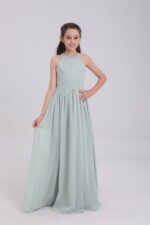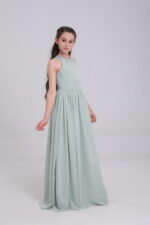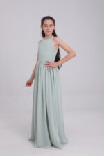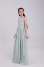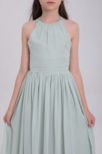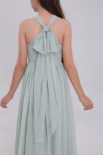 This sage green satin gown, with halter neck, bow back, flowy skirt and waist detail, blends elegance and innovation for magical moments.