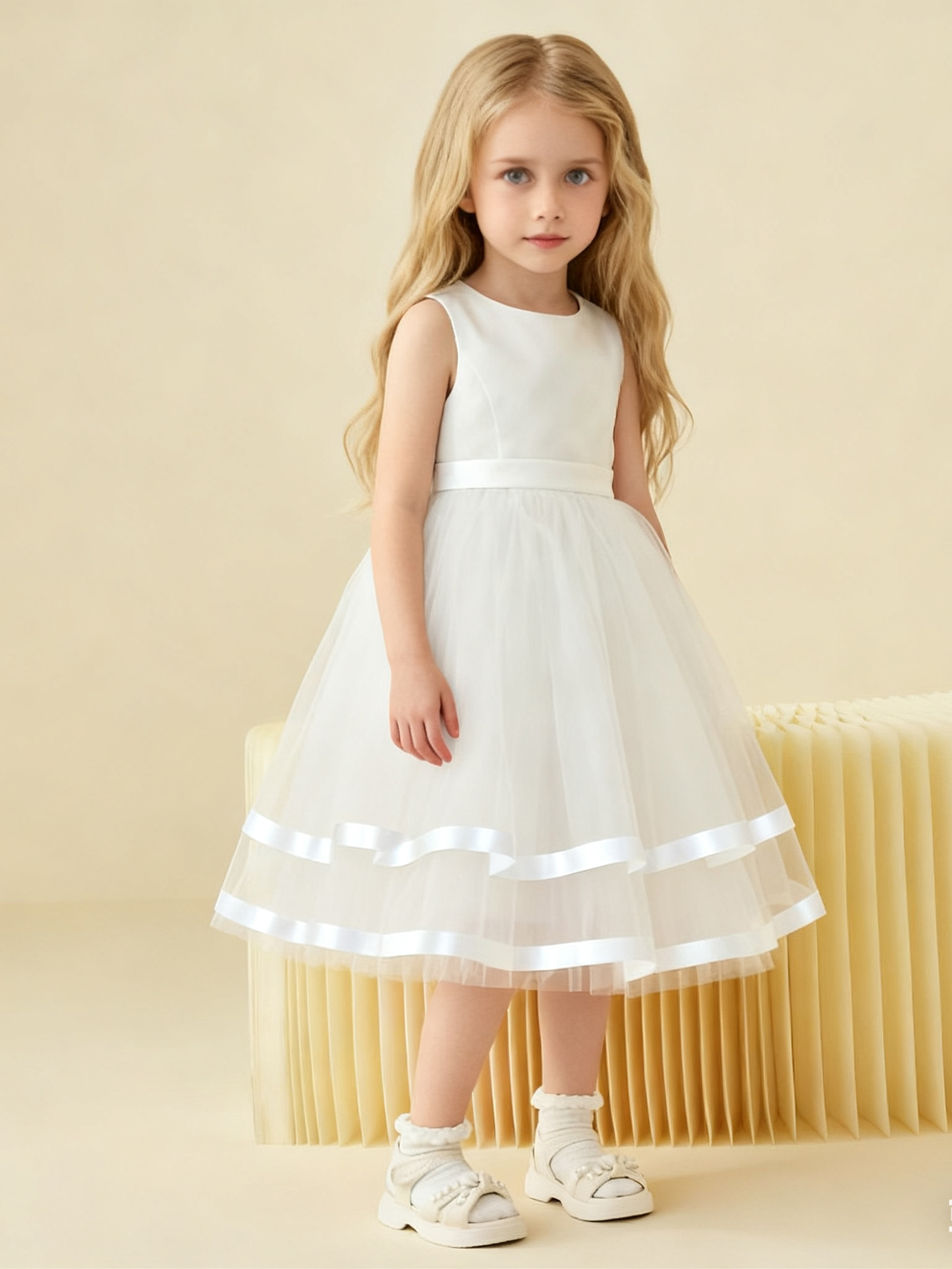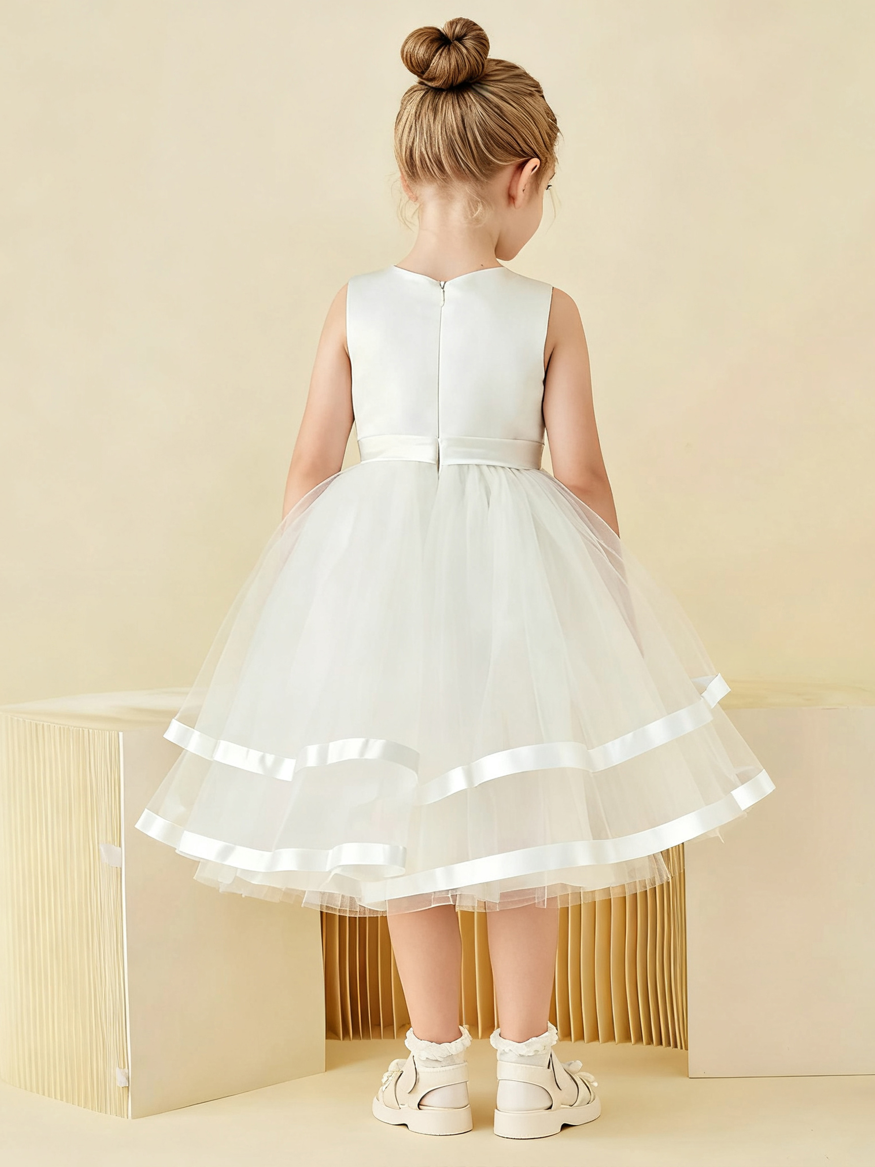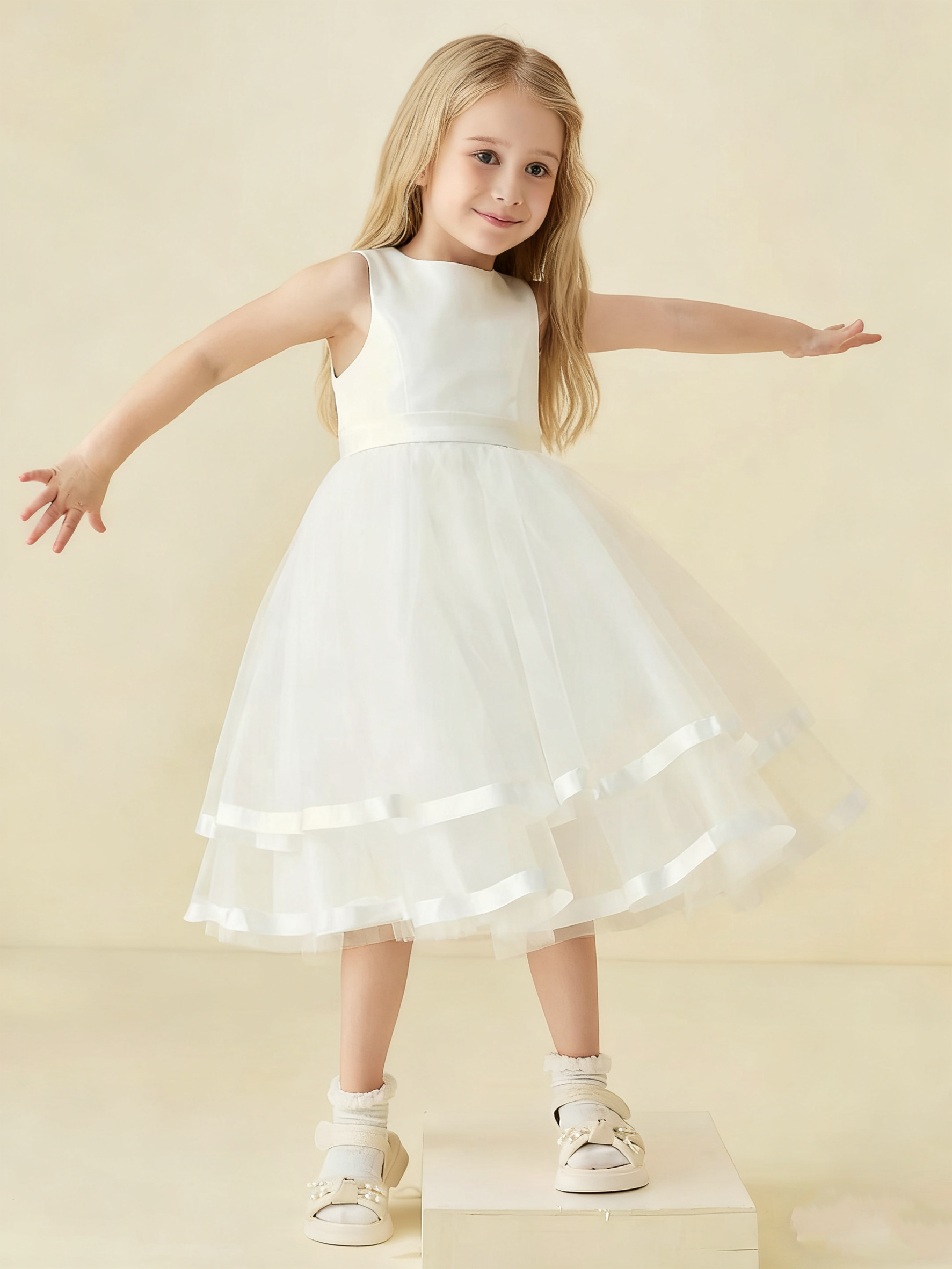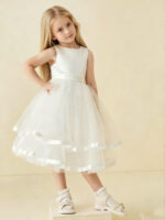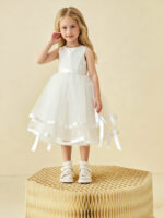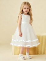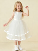 • Elevate her charm with our Simple Satin Flower Girl Dress with Tulle Skirt. A vision of grace, it features a satin bodice for a touch of luxury and a tulle skirt for an ethereal feel. Perfect for weddings or special occasions, its timeless design ensures she’ll be the epitome of elegance.